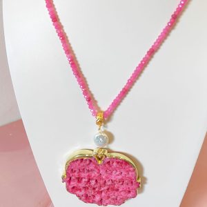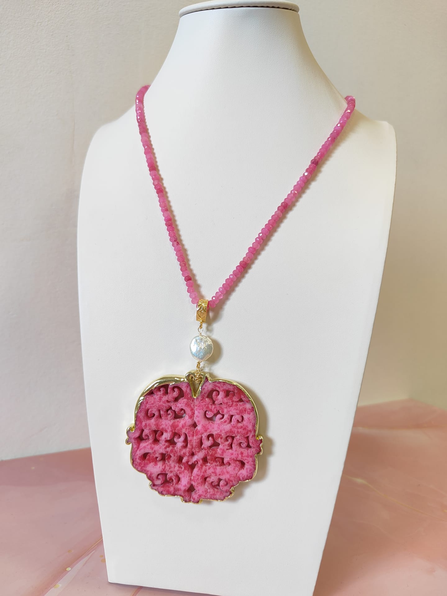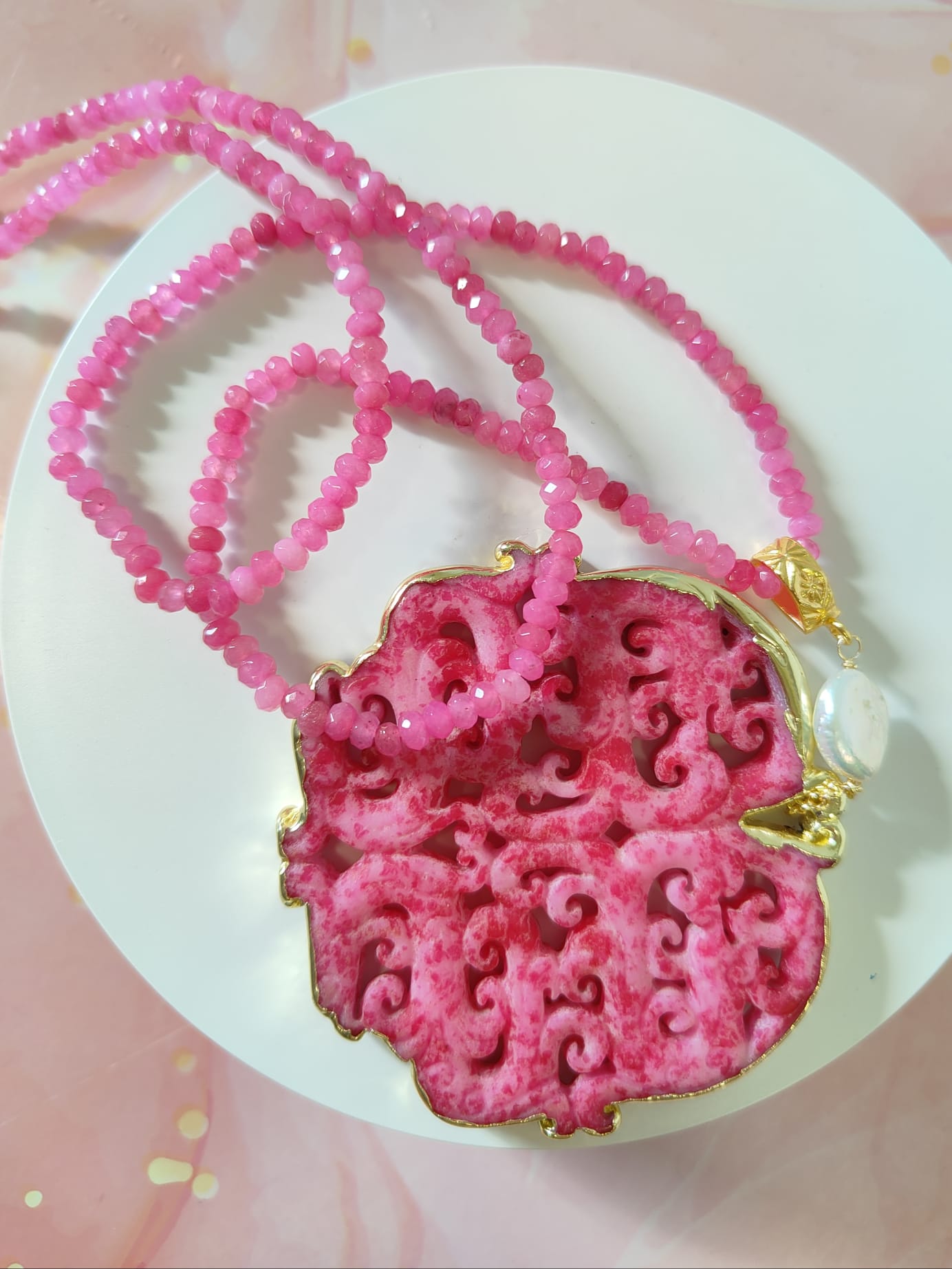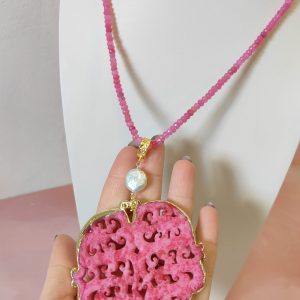 Il ciondolo, invece, è realizzato in giada fucsia intagliata con un elaborato motivo mandala. Le volute e le aperture geometriche creano un gioco di pieni e vuoti che richiama armonia, energia e protezione. Inoltre, il bordo dorato definisce il profilo della pietra e aggiunge un tocco prezioso. Sopra il pendente è inserita una perla naturale, scelta per illuminare il gioiello con una luce morbida e per bilanciare la forza del colore.