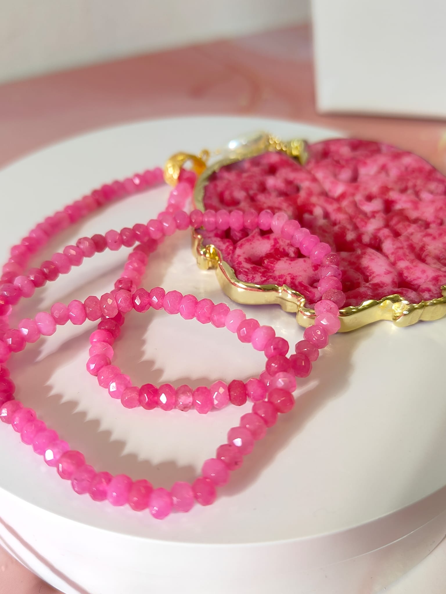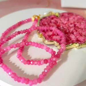 Questa collana mandala giada fucsia è un pezzo unico pensato per chi desidera un gioiello vivace e simbolico. La collana è composta da agata fucsia sfaccettata, scelta per il suo colore intenso e per la brillantezza prodotta dal taglio regolare delle pietre. Ogni elemento è infilato a mano, così il gioiello risulta leggero, confortevole e adatto a essere indossato per molte ore.