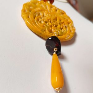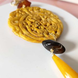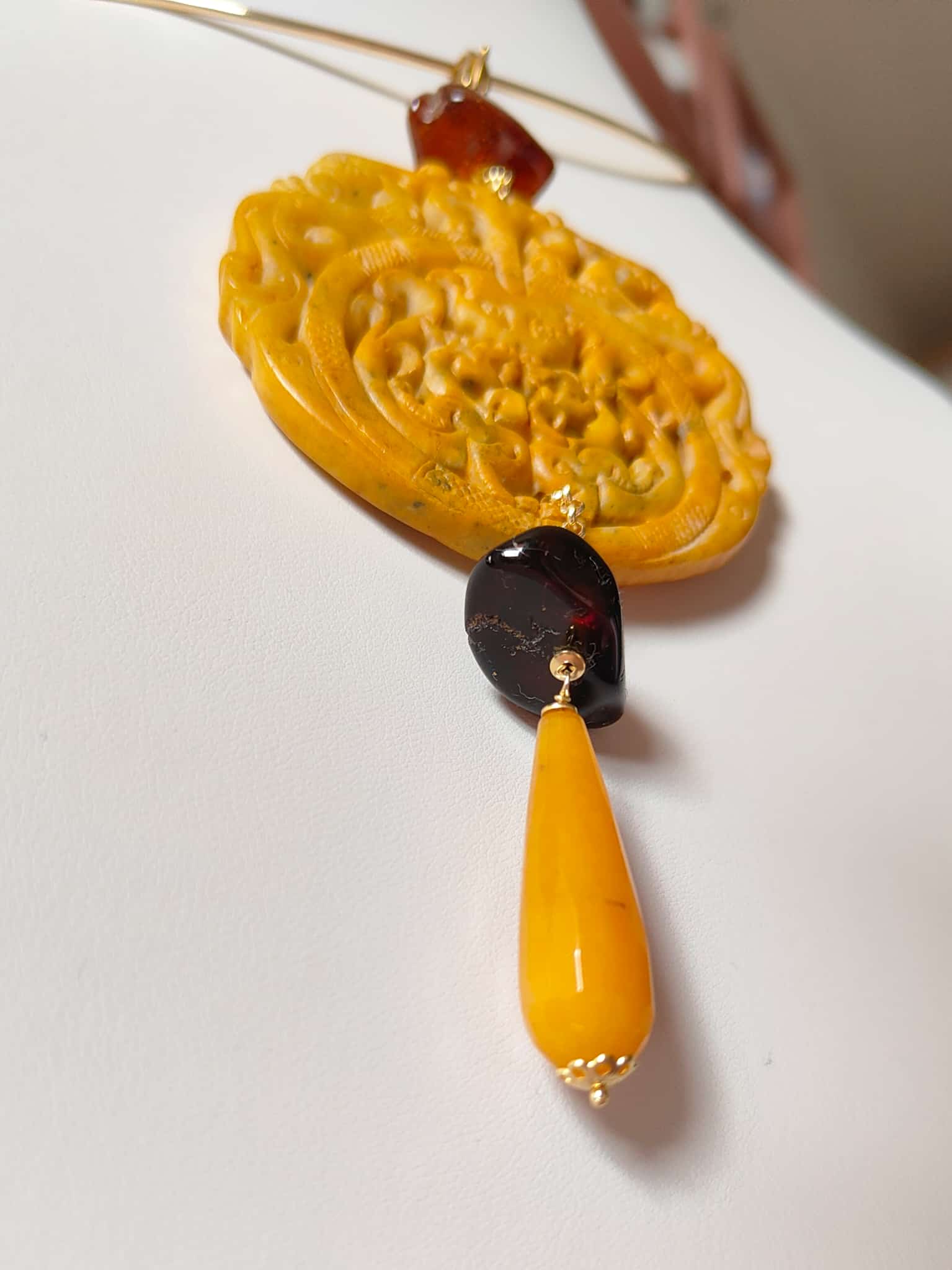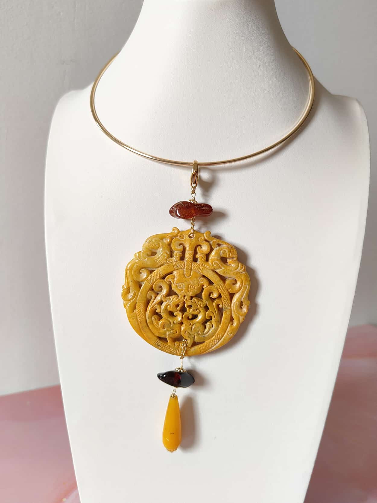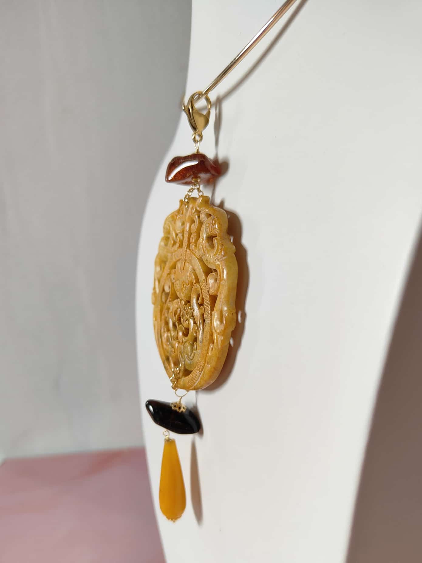Materiali: giada gialla antica, ambra naturale cognac, ambra scura, acciaio dorato