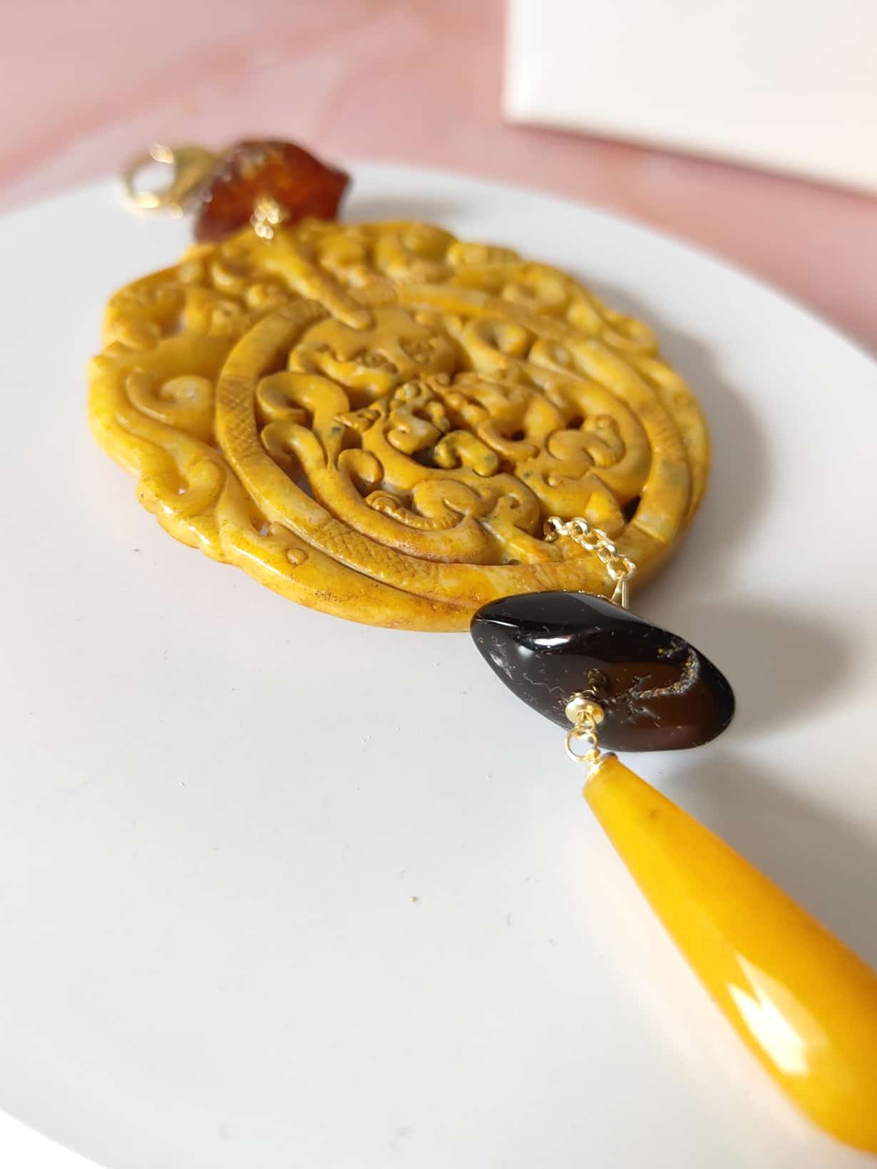 Sopra il mandala si trova una splendida ambra cognac, naturale e traslucida, che cattura la luce in riflessi dorati. Il suo colore caldo si fonde armoniosamente con la tonalità miele della giada. Più in basso, una ambra scura, densa e misteriosa, crea un contrasto elegante e profondo. A completare la composizione, una goccia di giada gialla lucente dona fluidità e un tocco di energia solare.