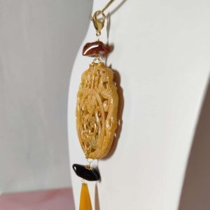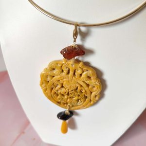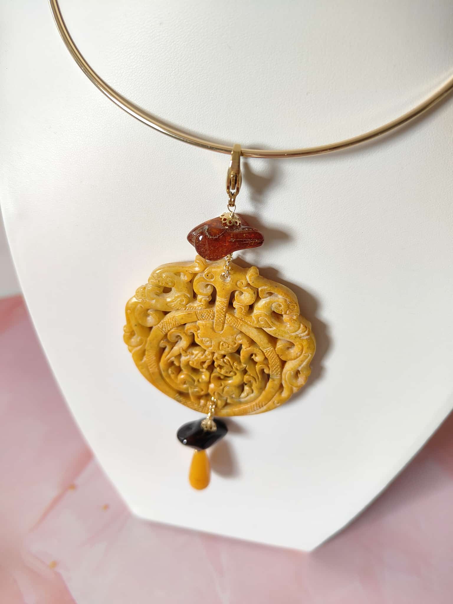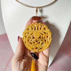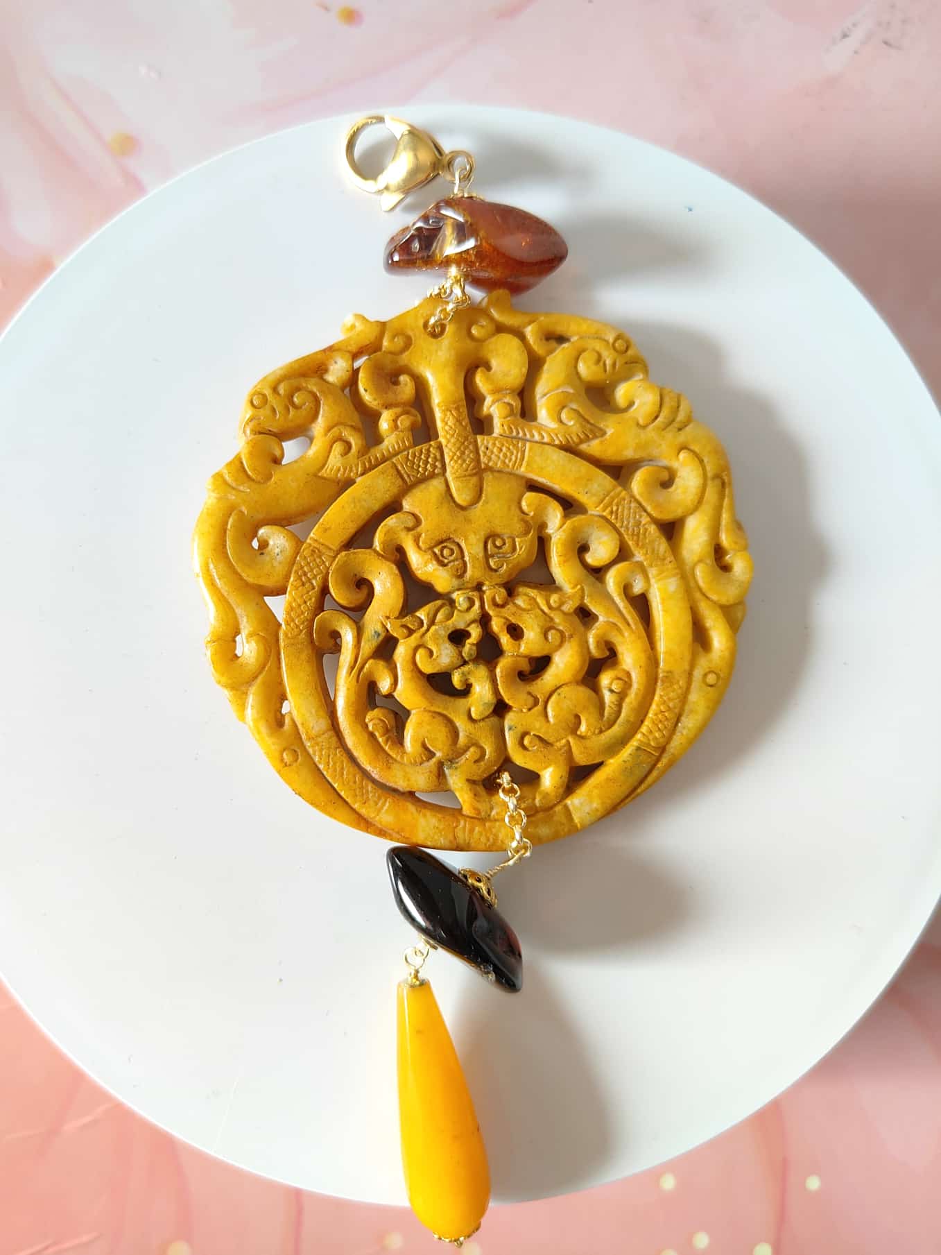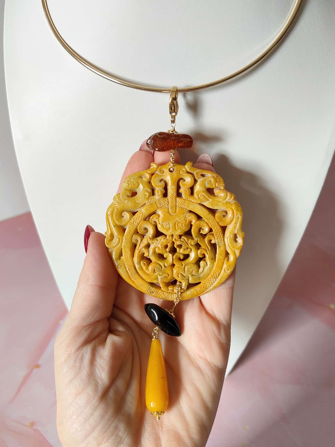 La collana Mandala Giada Gialla e Ambra è una creazione dal fascino caldo e luminoso. Ispirata ai simboli orientali dell’armonia, celebra la connessione tra natura, luce e artigianato. Il mandala centrale, in giada gialla antica, è scolpito con dettagli sinuosi che evocano equilibrio e forza interiore.