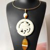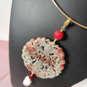Il pendente centrale è un mandala scolpito in giada antica, una pietra preziosa amata per le sue sfumature naturali e per il suo significato simbolico. Le tonalità neutre della giada, arricchite da leggere venature rossastre e tocchi terrosi, evocano il passaggio del tempo e la saggezza delle civiltà orientali. La lavorazione intricata restituisce un disegno ricco di dettagli, che rappresenta armonia, protezione e ciclicità.