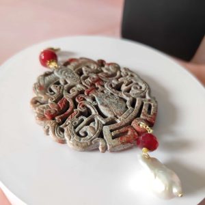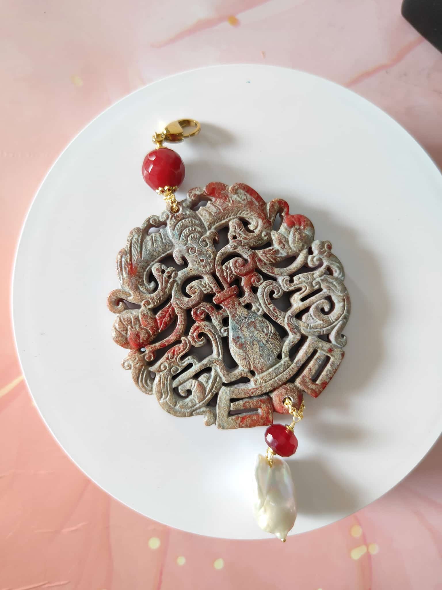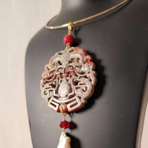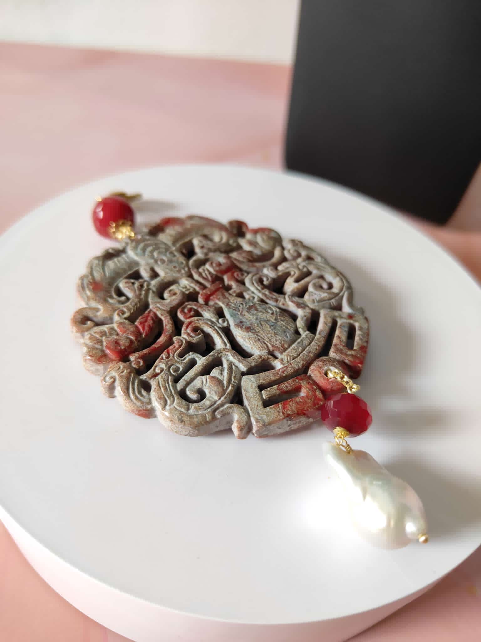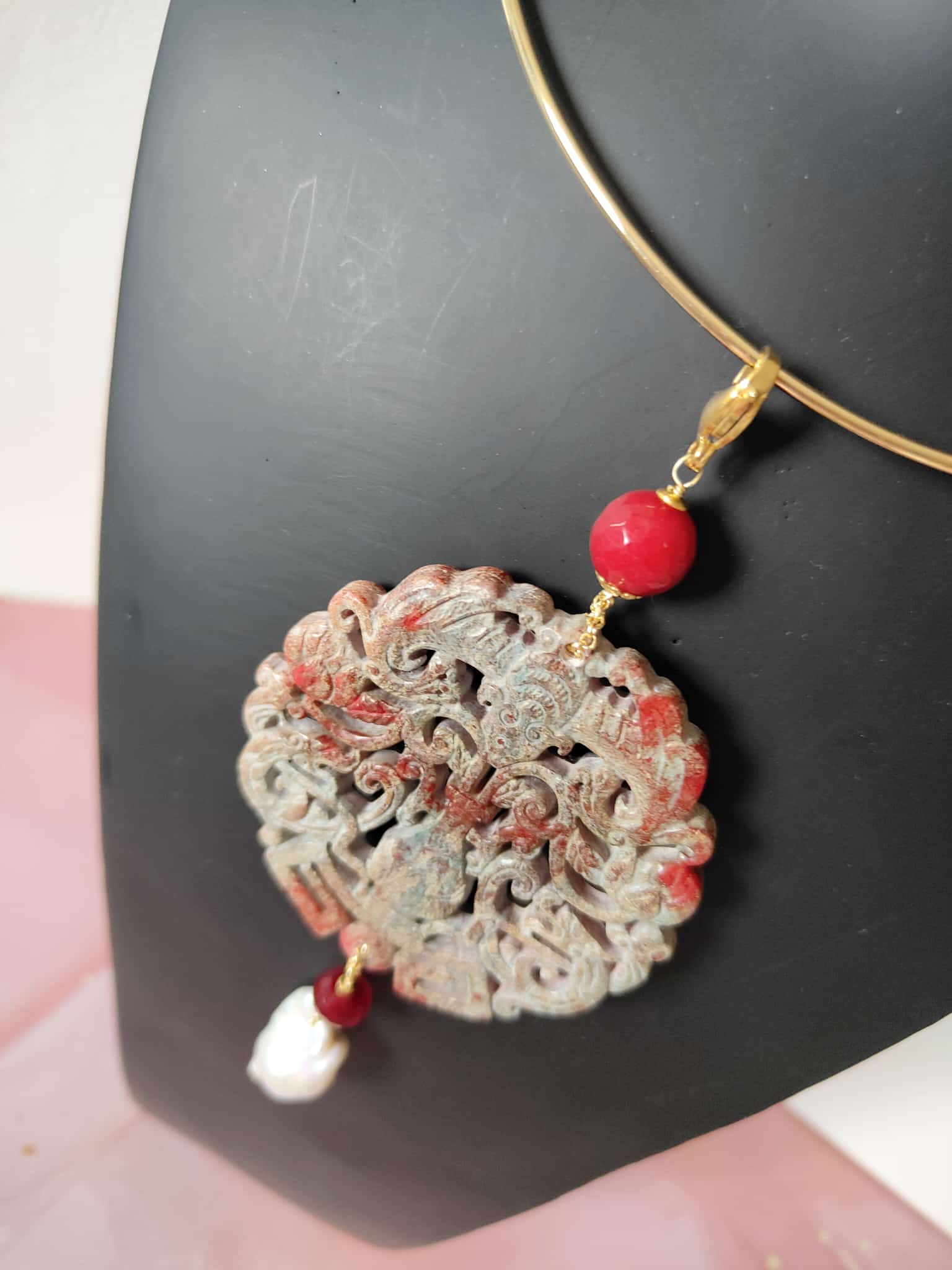 A impreziosire la composizione, due splendide gemme di agata rossa e borgogna, dai riflessi caldi e profondi. Queste pietre aggiungono energia e carattere, creando un elegante contrasto con la delicatezza della giada. Nella parte inferiore del pendente, una perla barocca naturale irregolare completa il gioiello con una nota luminosa e sofisticata.