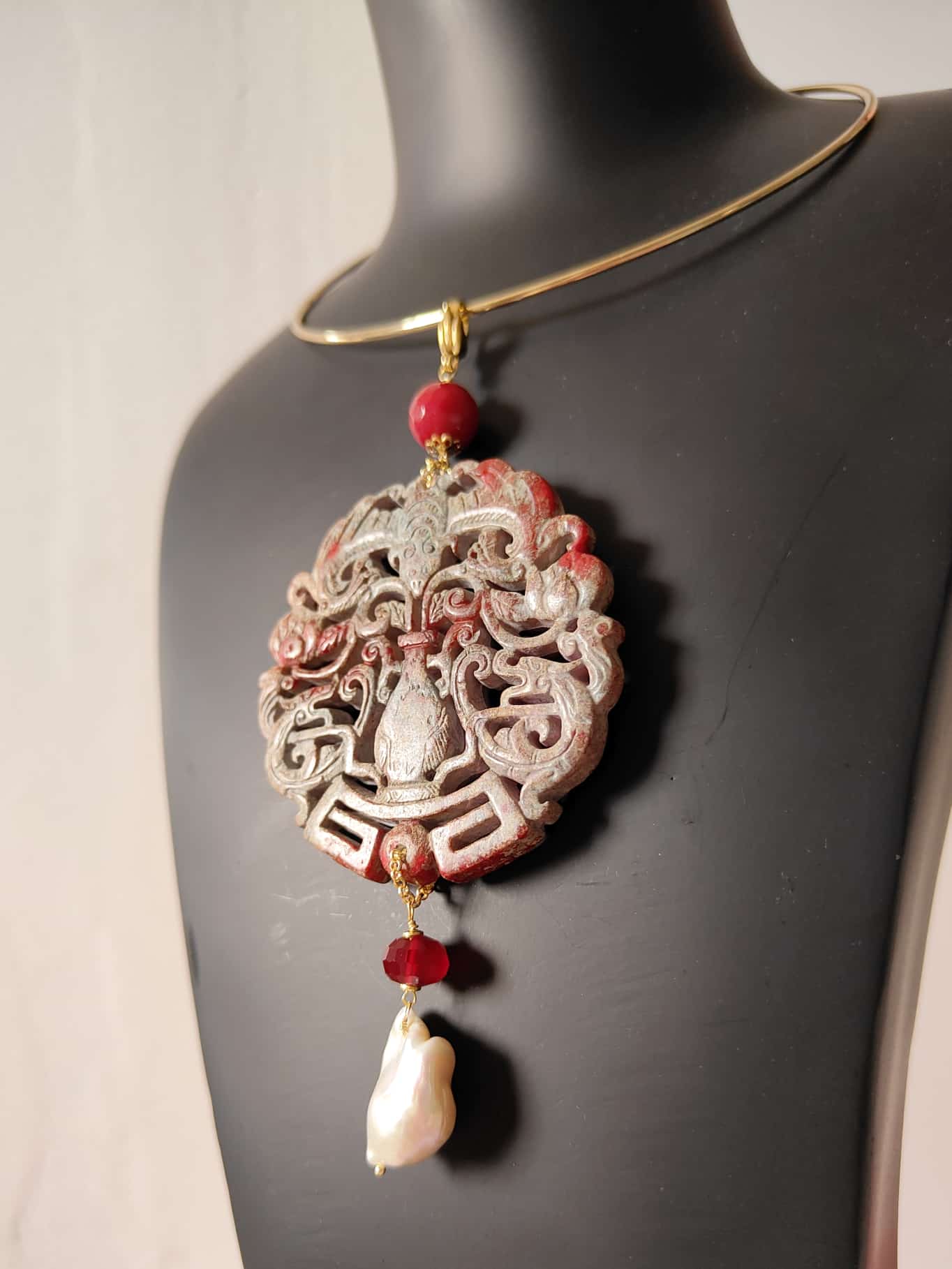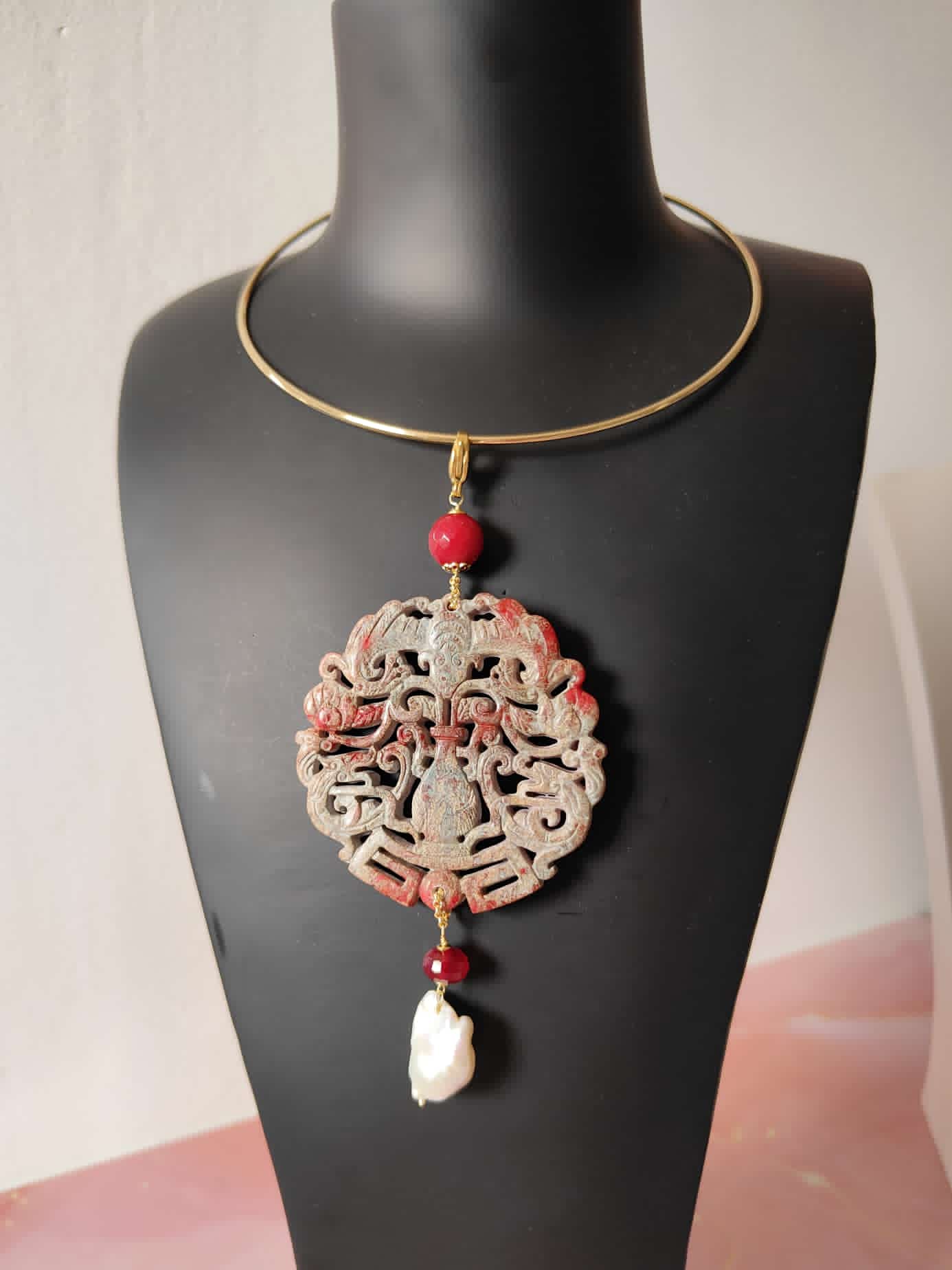 Materiali: giada antica, agata rossa, agata borgogna, perla barocca naturale