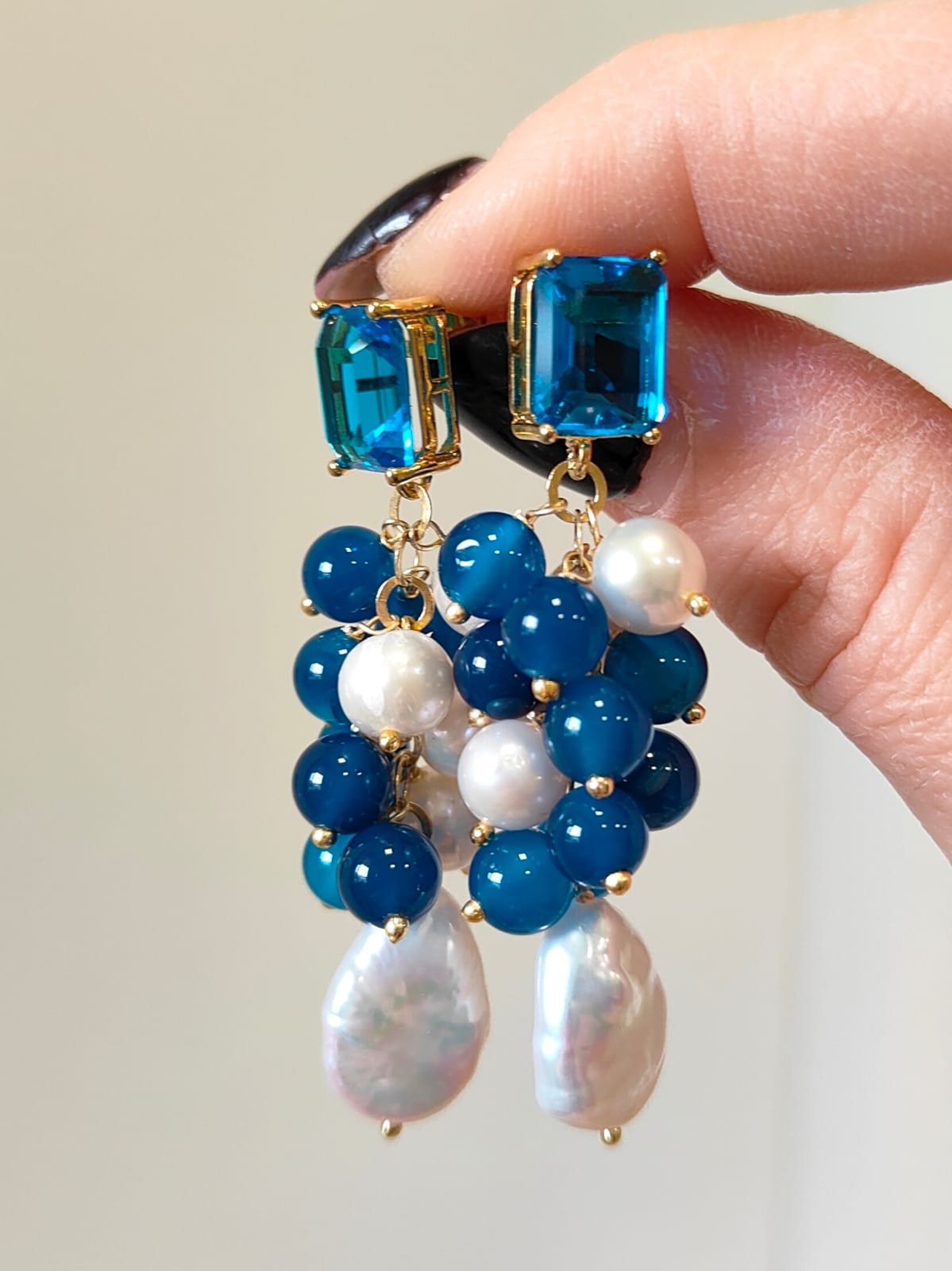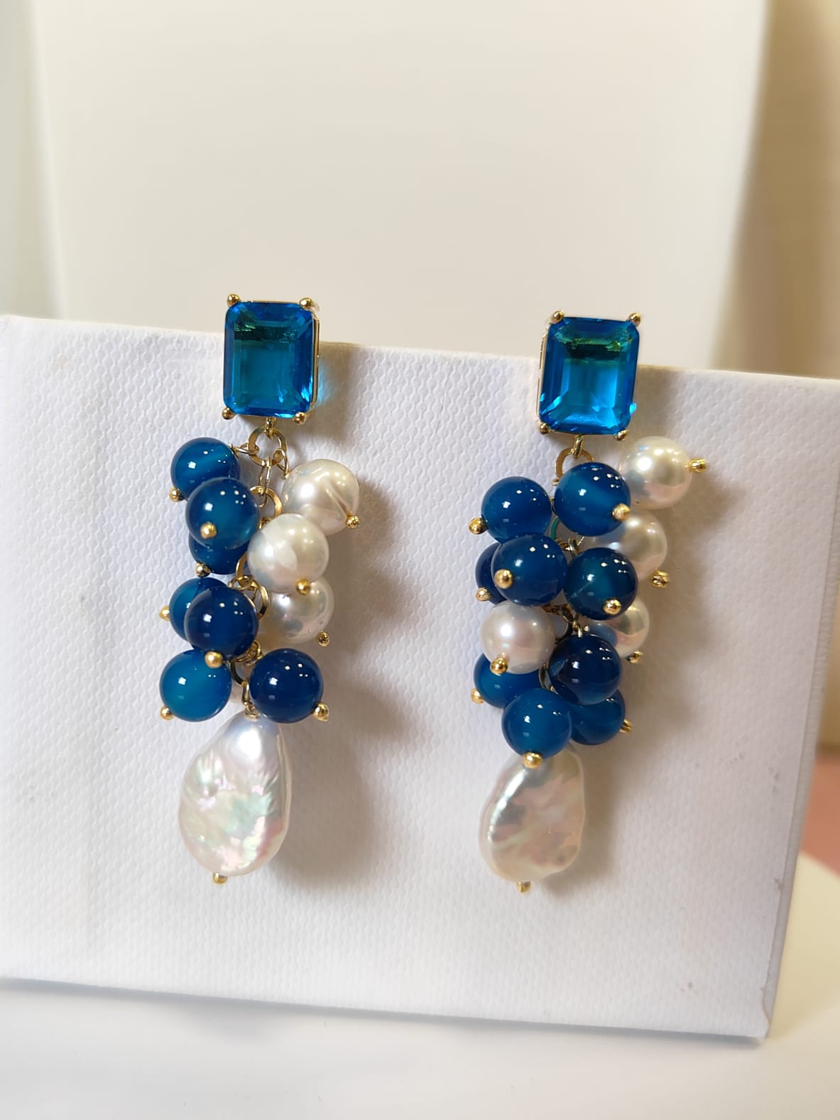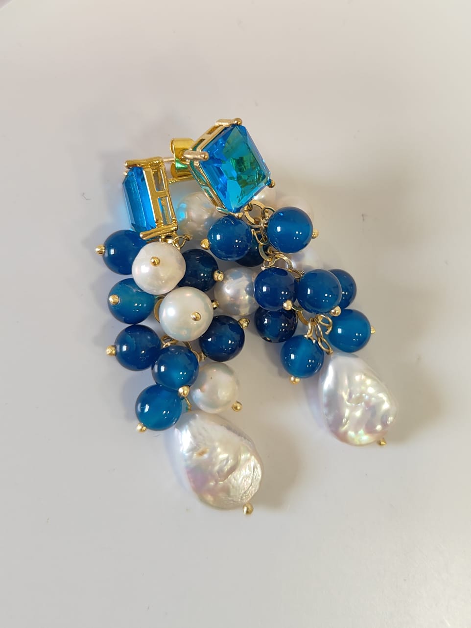 Questi orecchini agata perla sono una celebrazione di luce, colore e armonia, creati per chi ama gioielli raffinati e ricchi di movimento. La base è un perno a farfalla impreziosito da un cristallo rettangolare dal blu intenso, capace di catturare la luce e regalare una brillantezza magnetica. Da questo punto luminoso prende vita un morbido grappolo di sfere in agata blu e perle naturali, montate una a una per creare un effetto elegante, dinamico e prezioso.