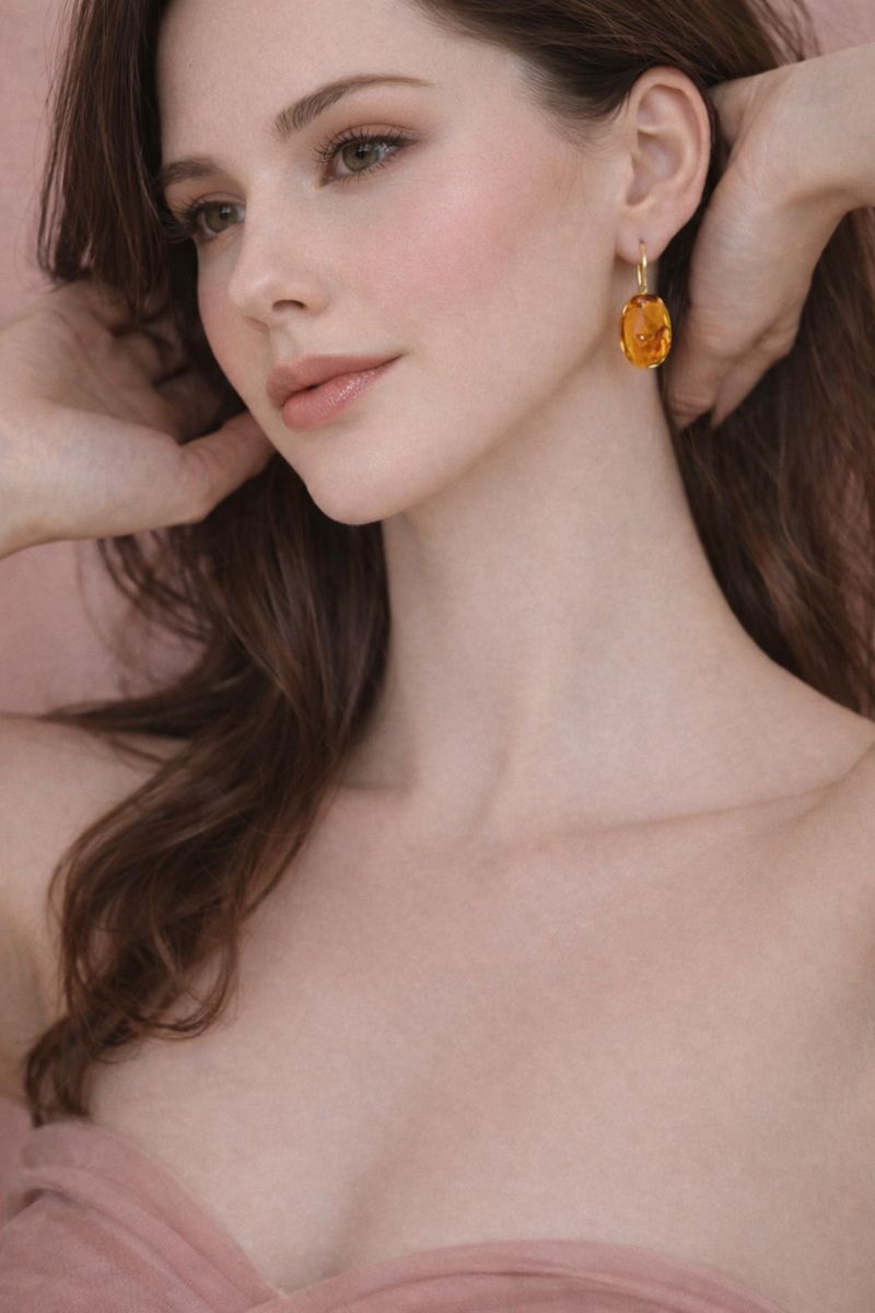 Le gemme sono realizzate in ambra baltica miele naturale, accuratamente selezionata per la sua trasparenza e per le tipiche inclusioni interne, segno distintivo della sua origine naturale. Ogni pietra presenta sfumature uniche che spaziano dal dorato intenso al miele più chiaro, creando riflessi morbidi e vibranti.