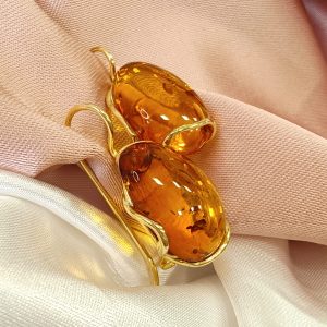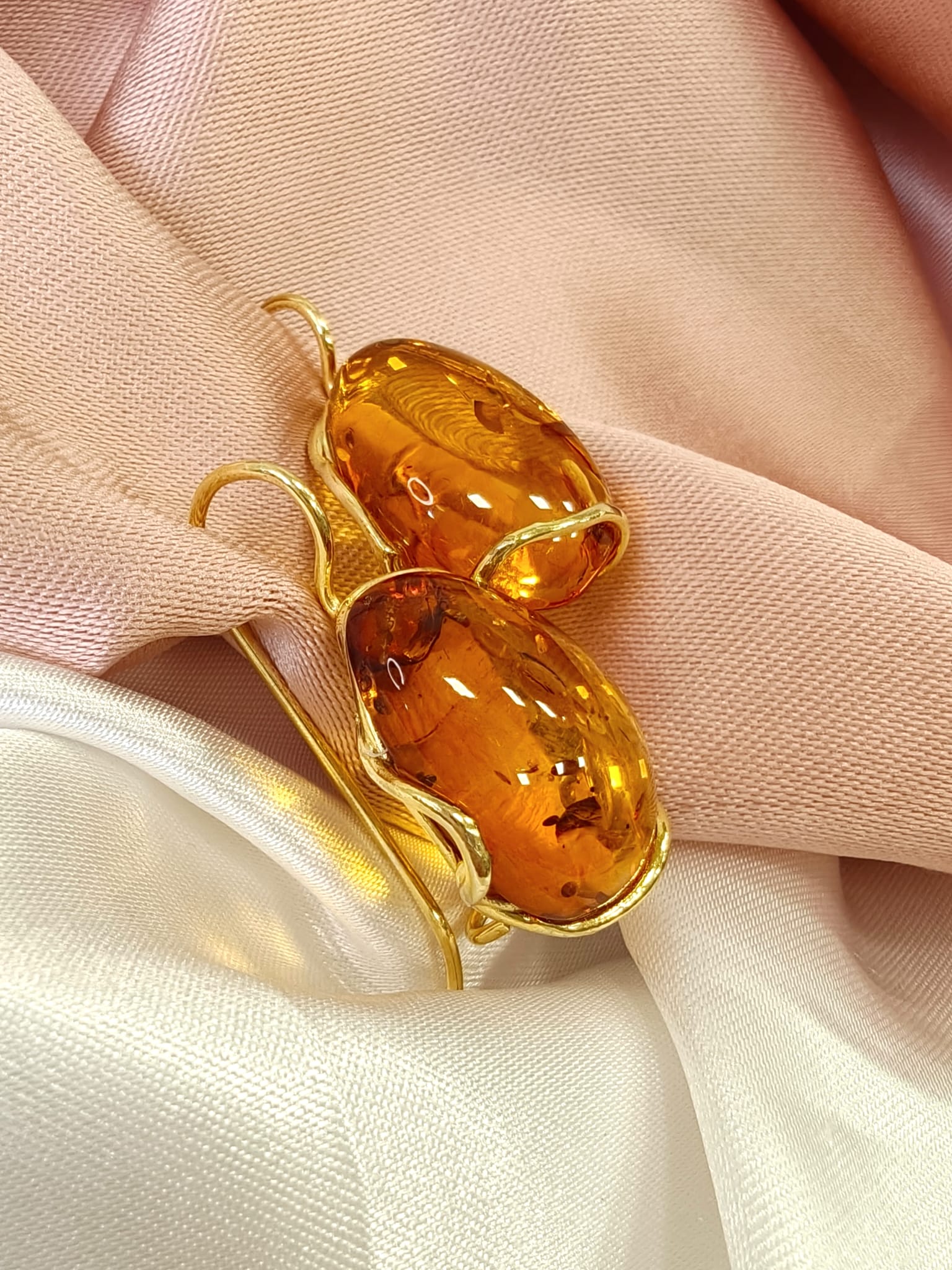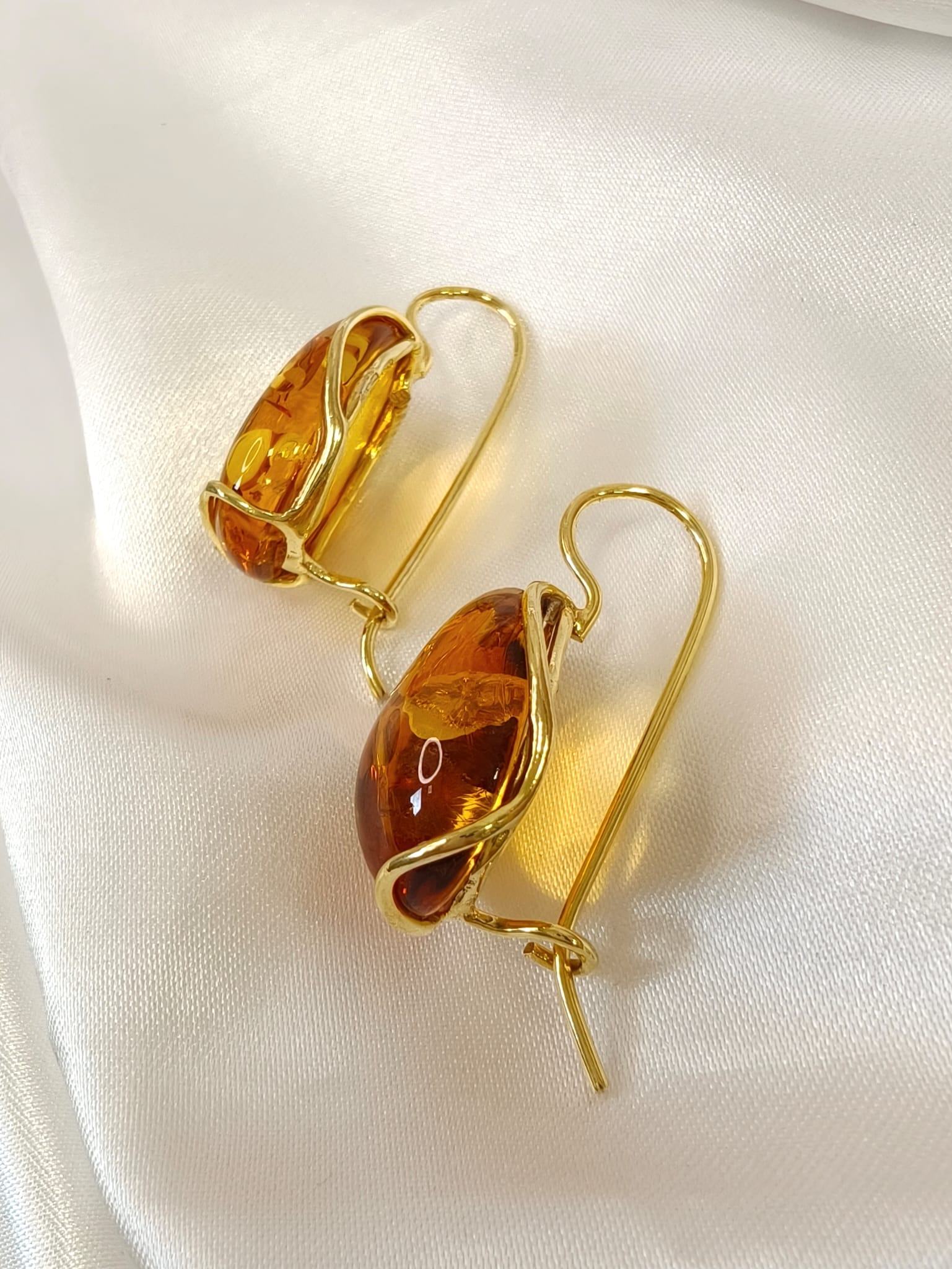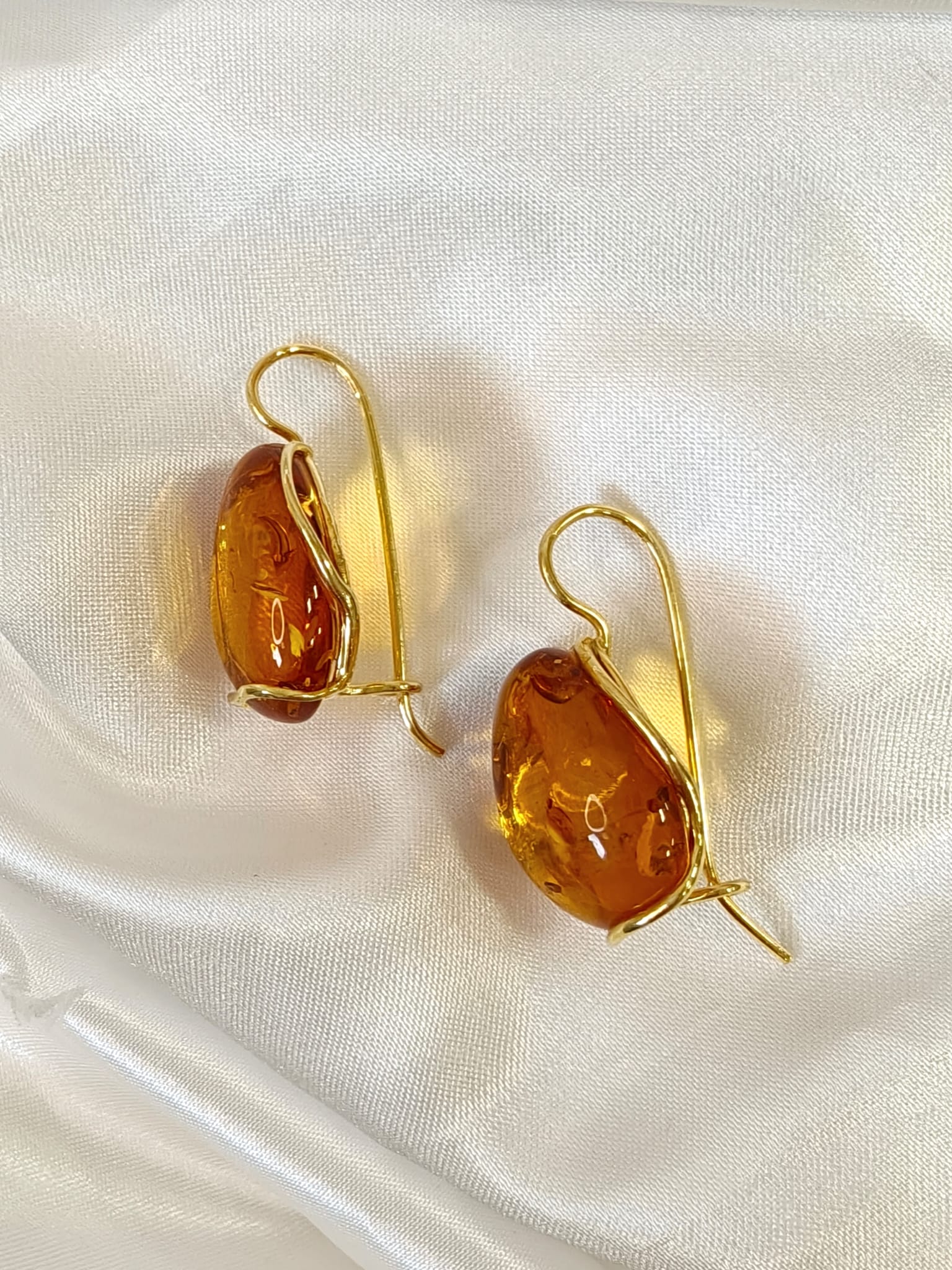La montatura è realizzata in argento 925 placcato oro, lavorata a mano per seguire armoniosamente la forma ovale dell’ambra. Il design essenziale esalta la pietra senza appesantirla, lasciando che la luce attraversi l’ambra e ne metta in risalto la bellezza naturale. I ganci garantiscono una vestibilità confortevole e sicura.