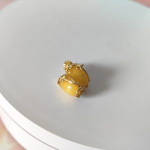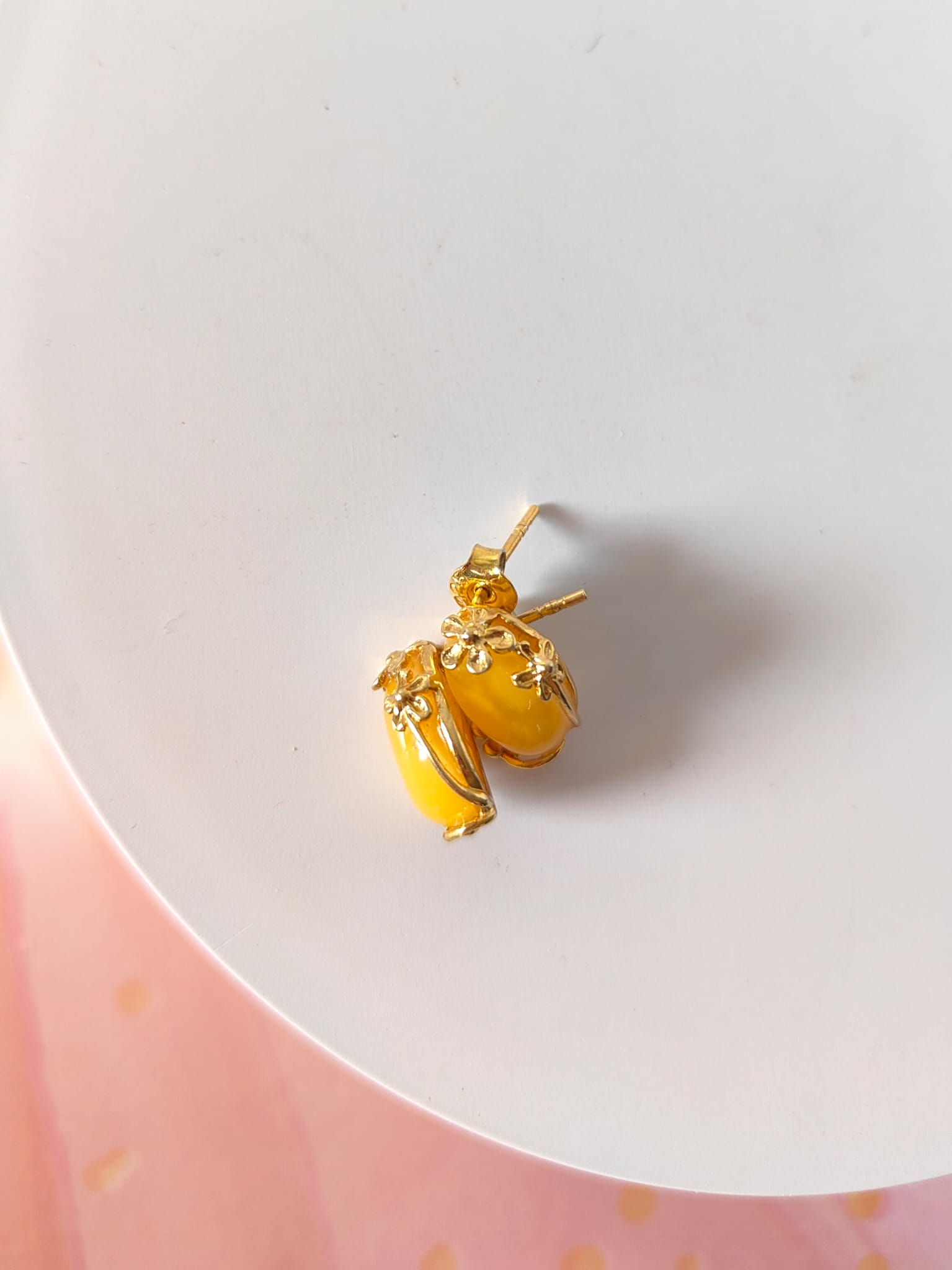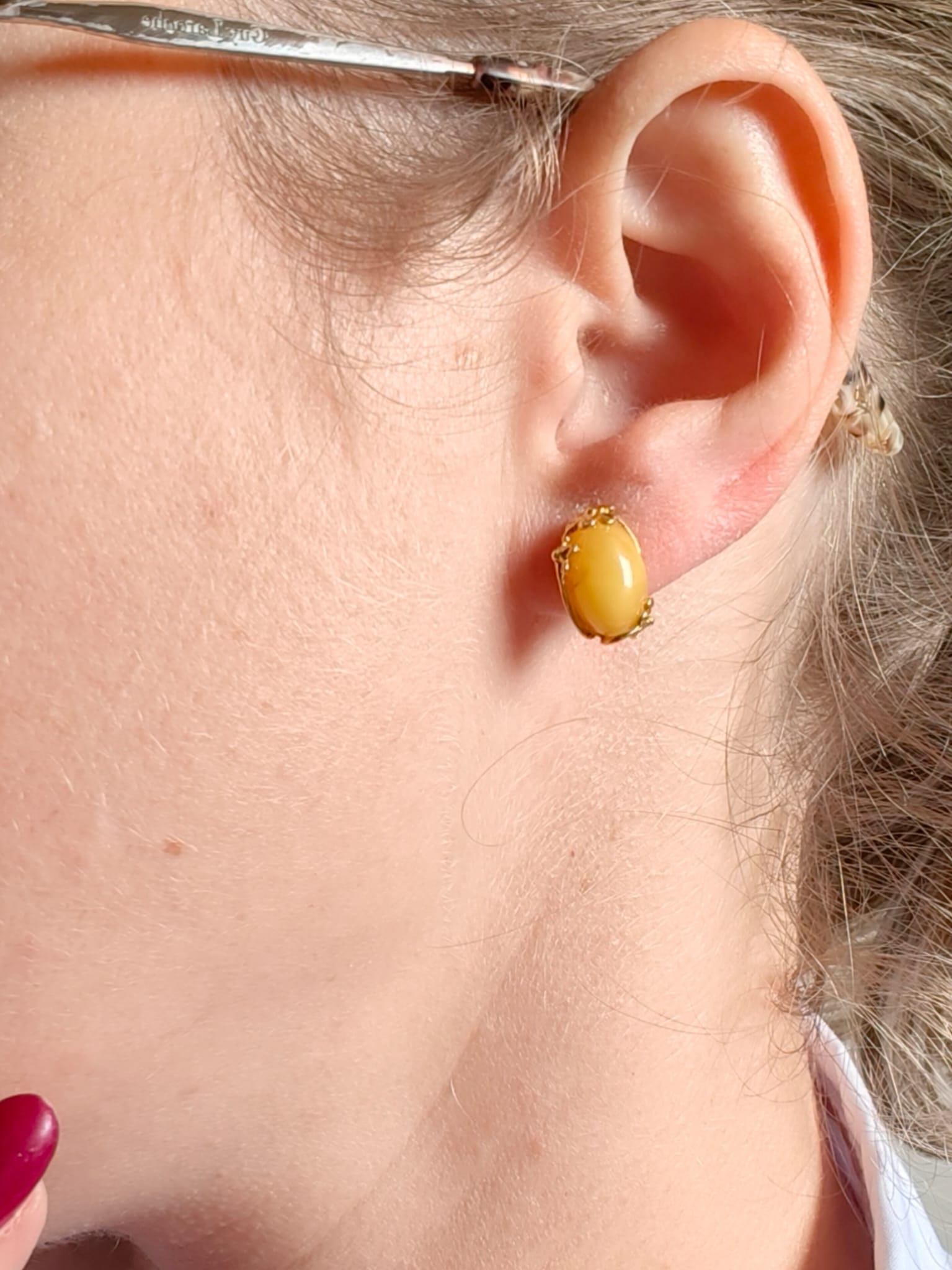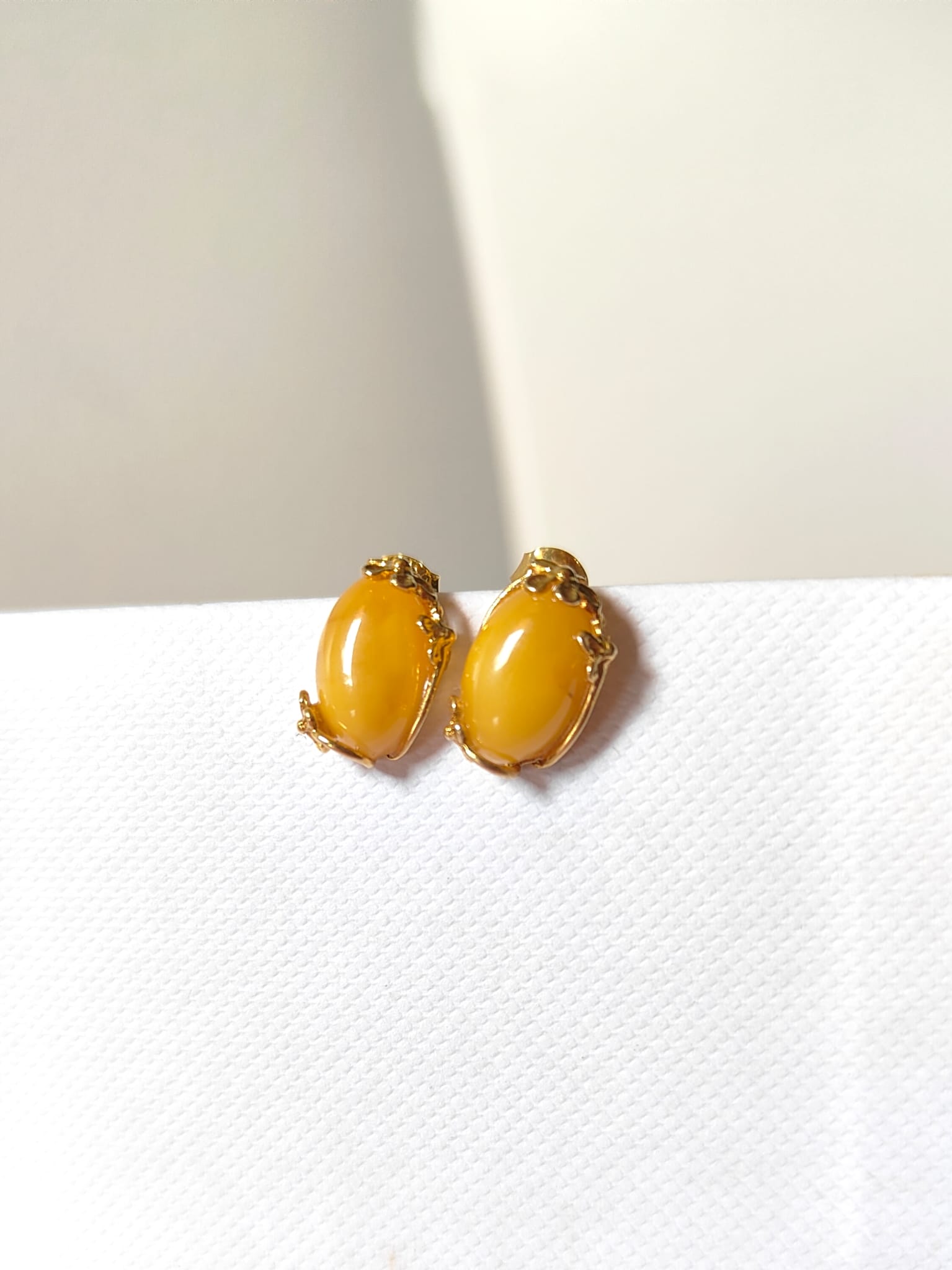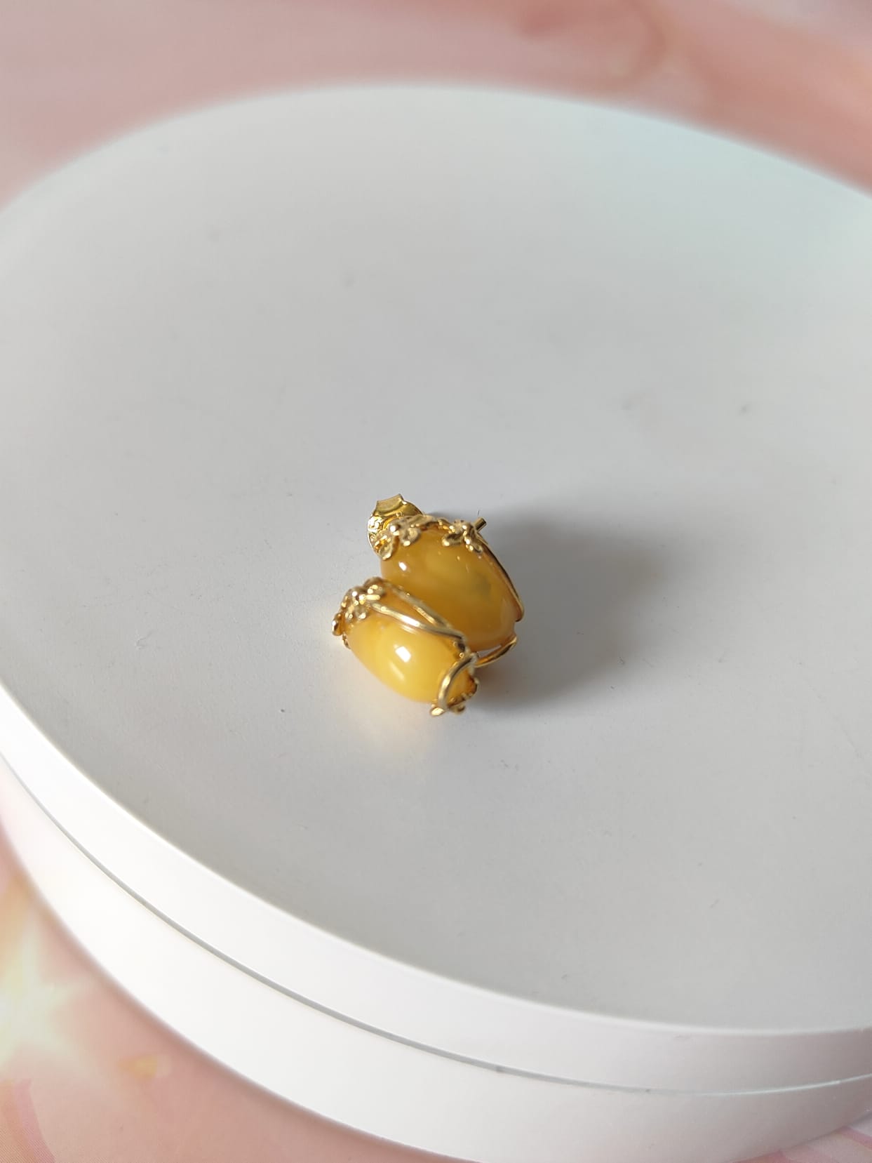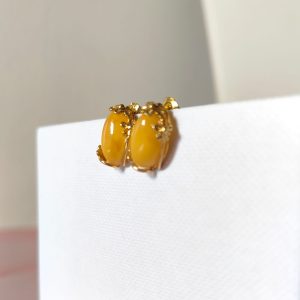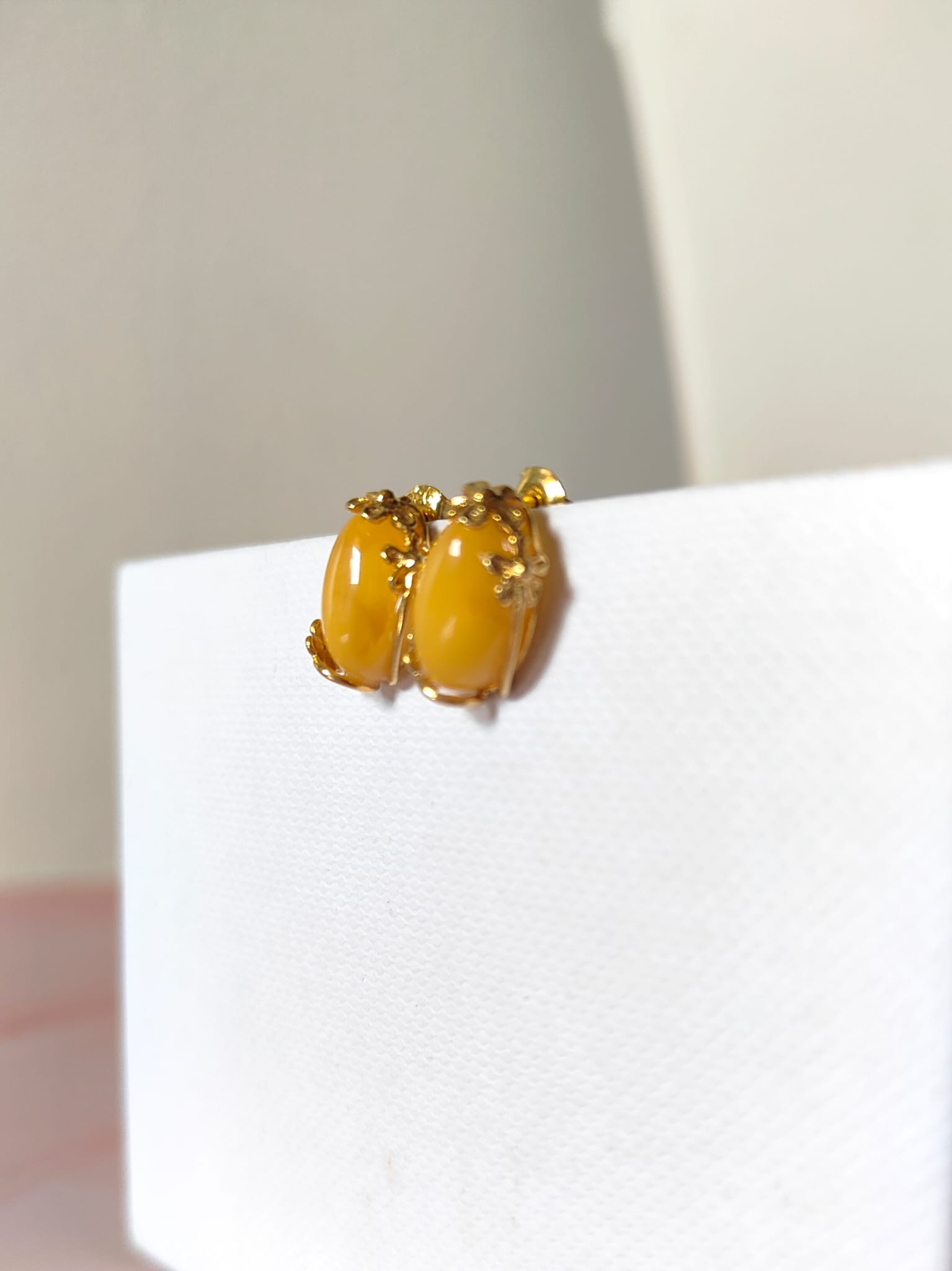 Questi orecchini da lobo sono realizzati in ambra baltica naturale dal colore miele intenso, con superfici levigate che riflettono la luce con delicatezza. La montatura, in argento 925 placcato oro, presenta un design decorativo a griffe dorate che abbraccia la pietra, creando un effetto raffinato e armonioso.