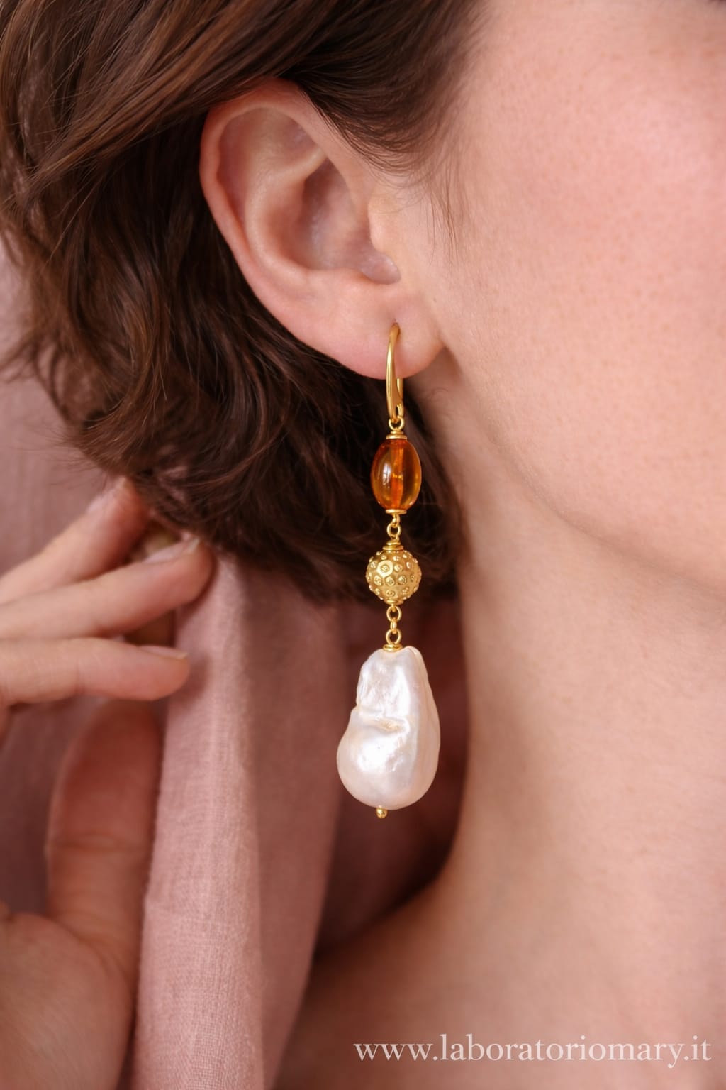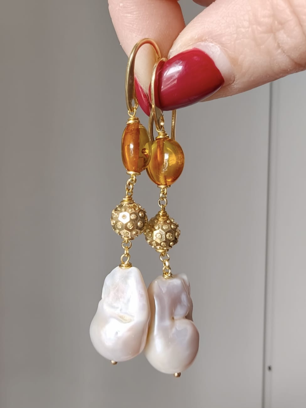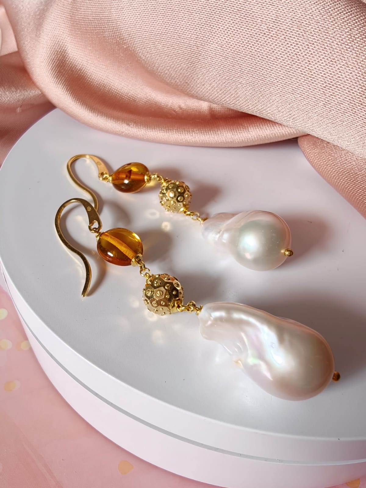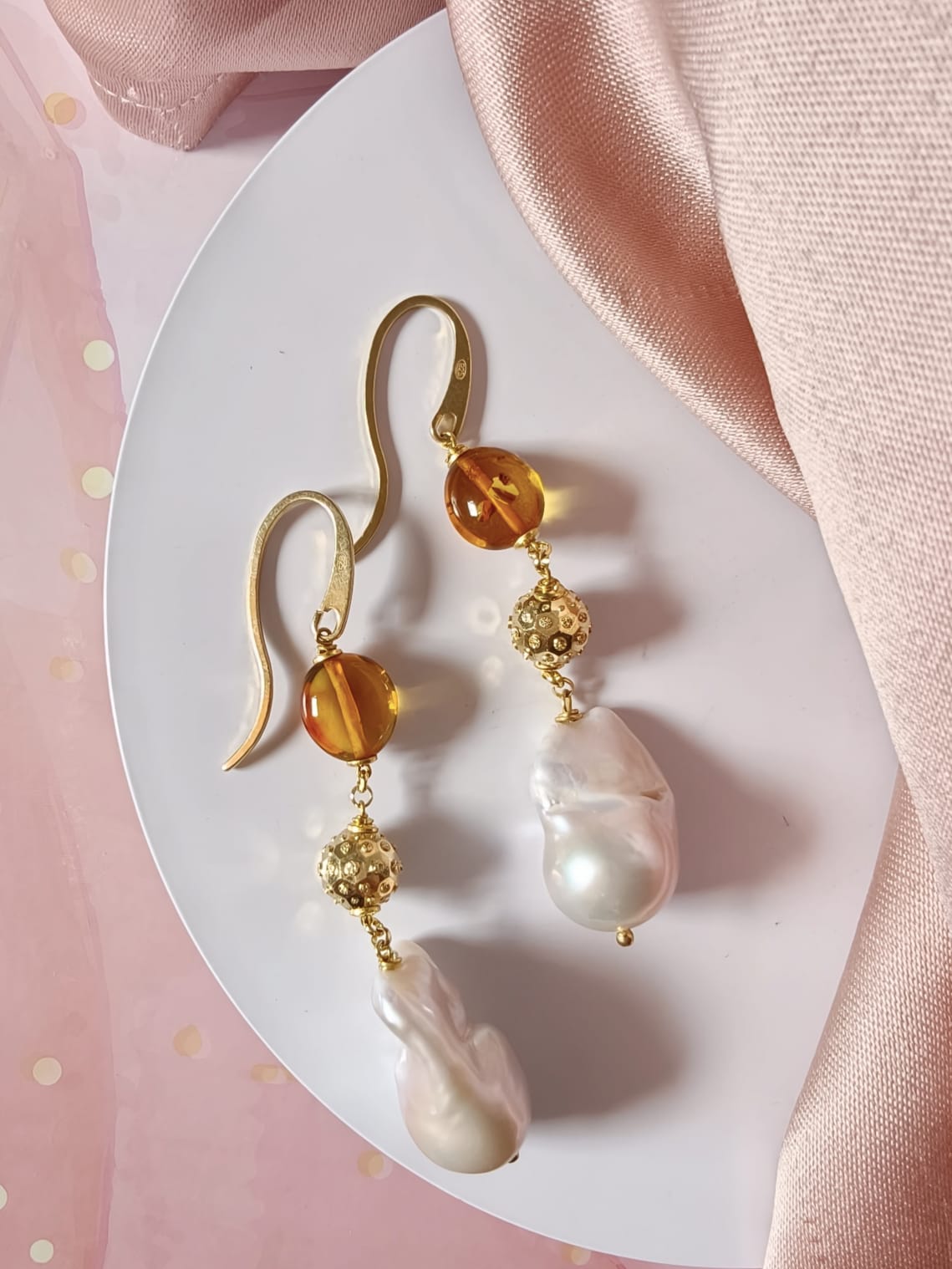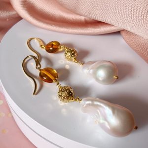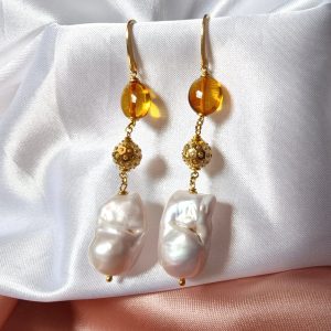 La parte superiore è impreziosita da una perla in ambra baltica naturale, scelta per la sua trasparenza calda e le sfumature dorate che catturano la luce in modo delicato. A seguire, una sfera decorativa in argento 925 placcato oro aggiunge un accento prezioso e luminoso, fungendo da elegante elemento di raccordo tra i materiali. La composizione si completa con una perla barocca naturale, protagonista del design, dalla forma irregolare e unica, che dona carattere e autenticità a ogni singolo orecchino.
