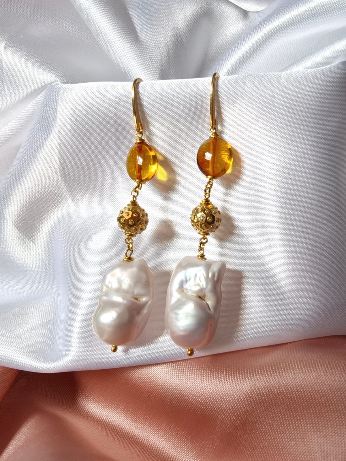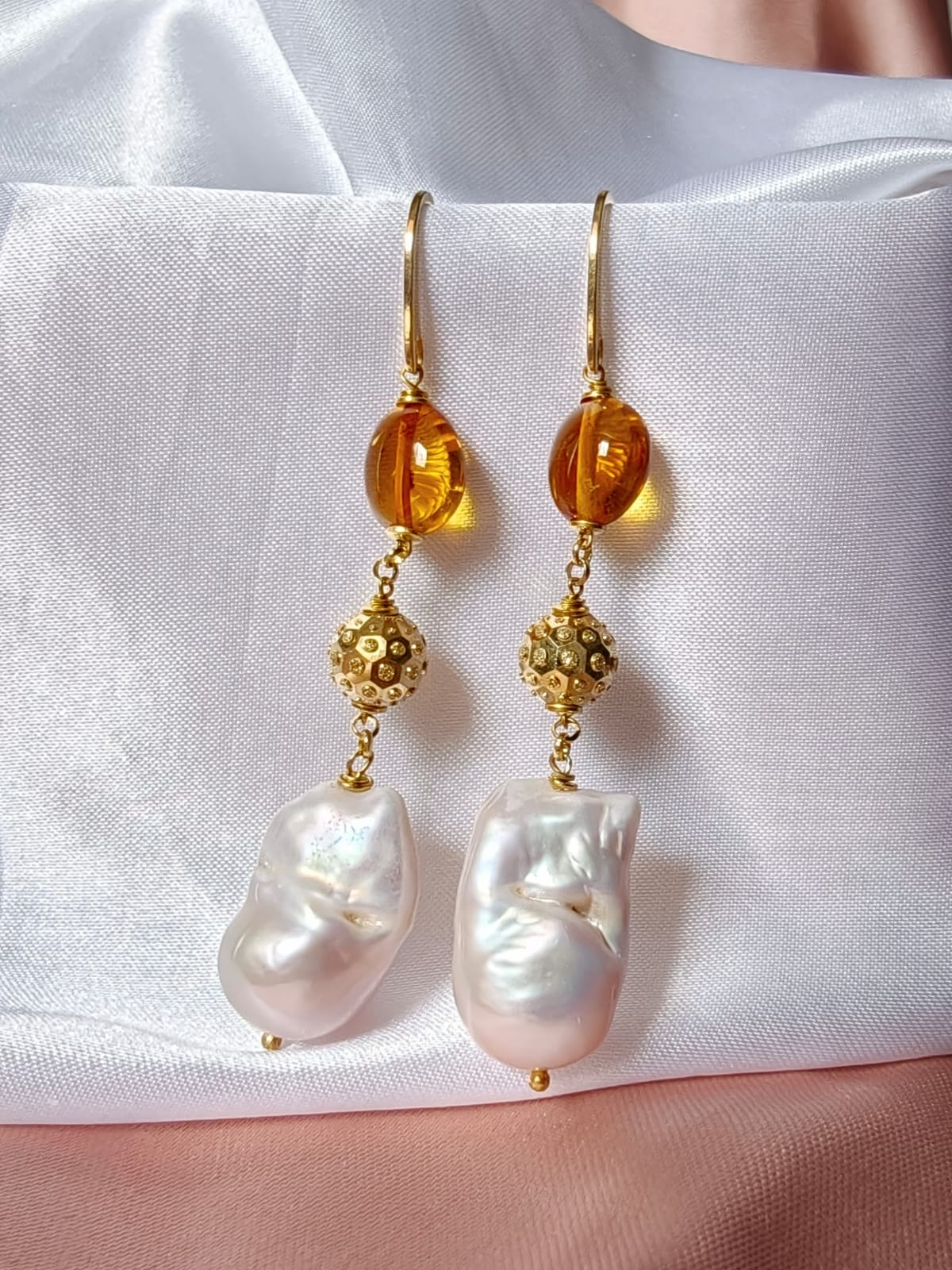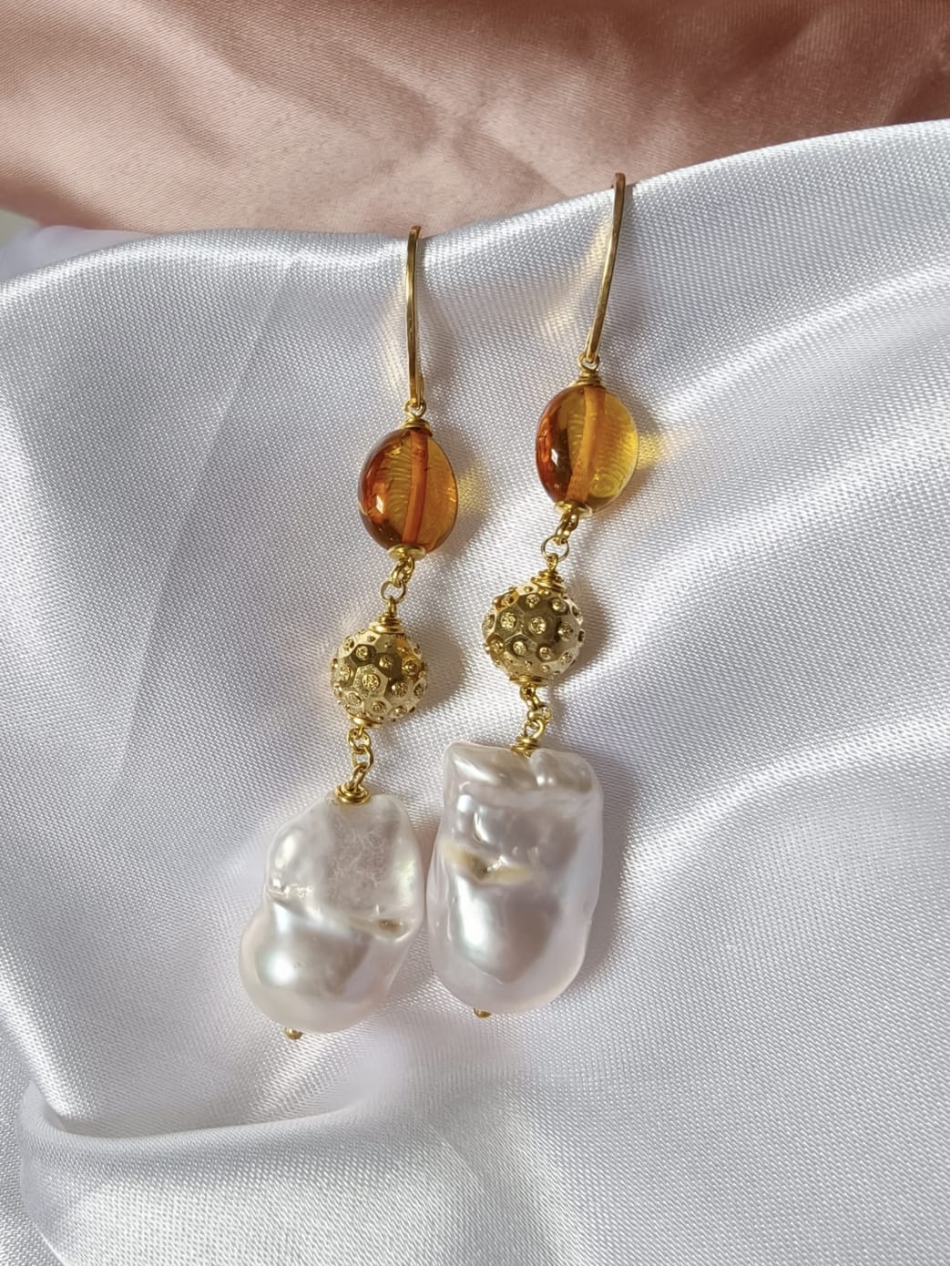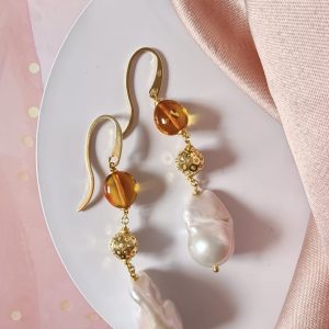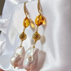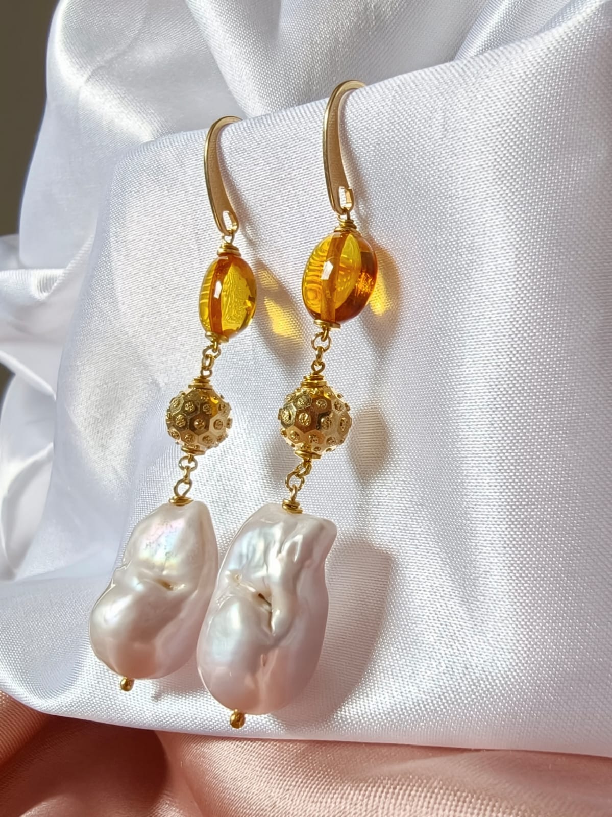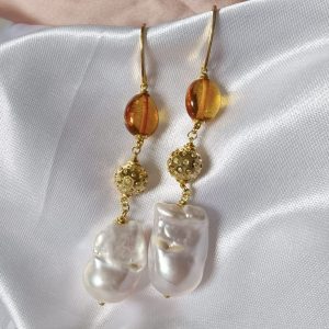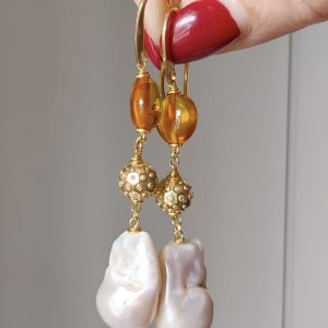 Materiali: ambra baltica naturale, perle barocche naturali, argento 925 placcato oro