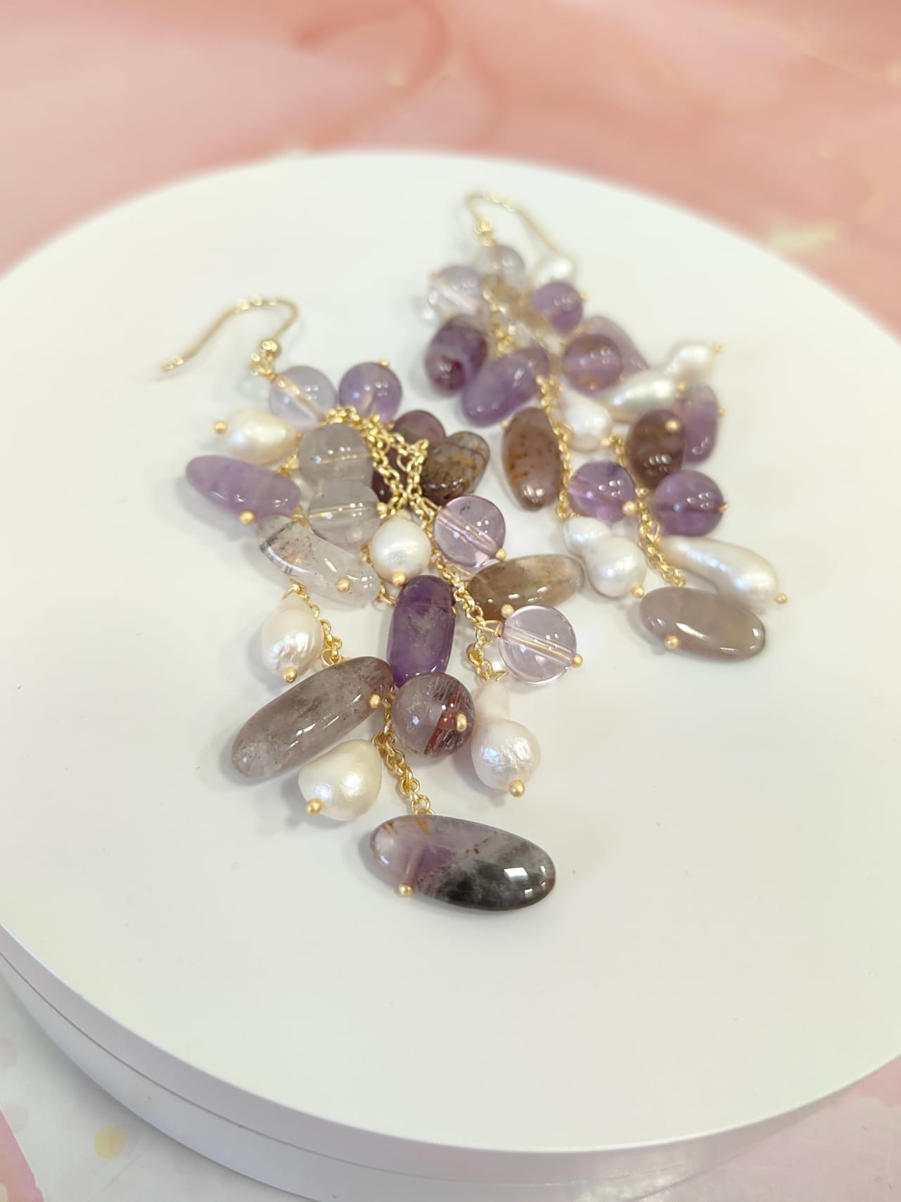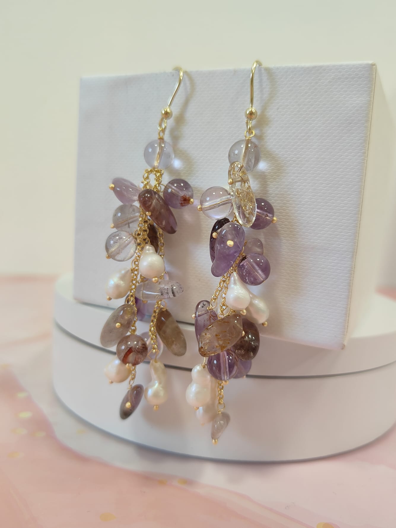 Il design a cascata permette di abbinare gli orecchini sia a collane minimal sia a gioielli coordinati nei toni del lilla, del nude, dell’oro e del bianco. Si abbinano perfettamente anche ai gioielli con ametista presenti sul sito, creando armonia cromatica senza apparire eccessivamente coordinati.
