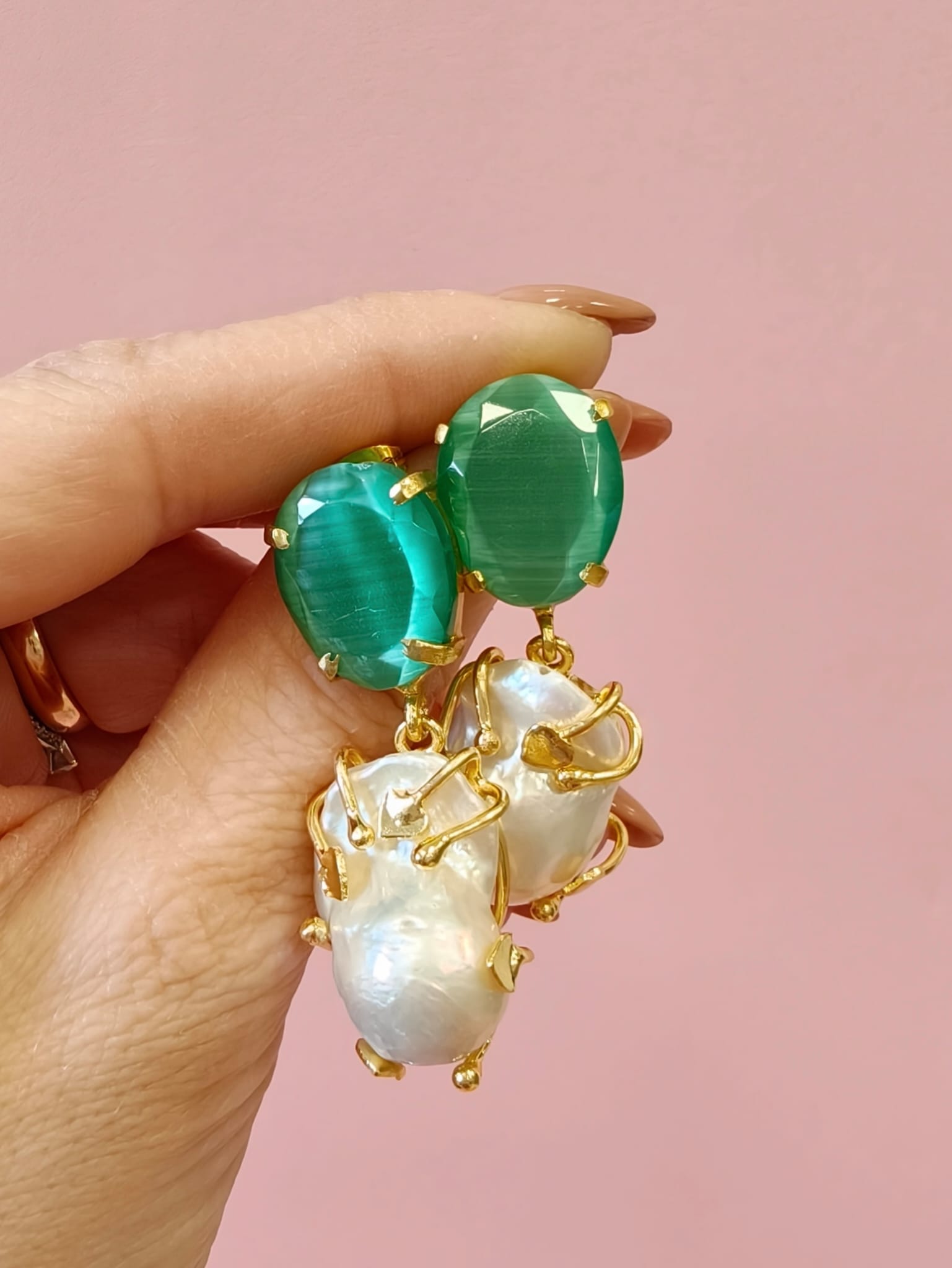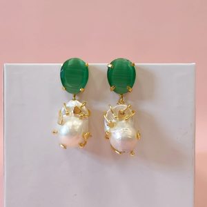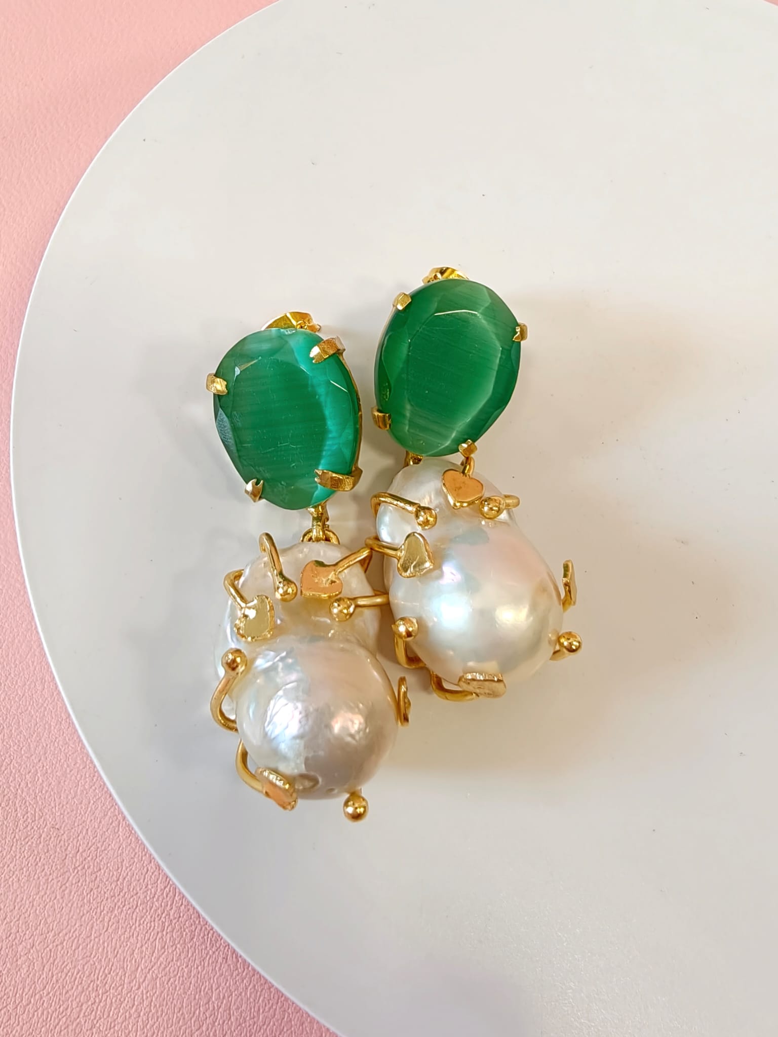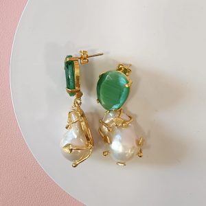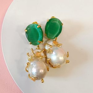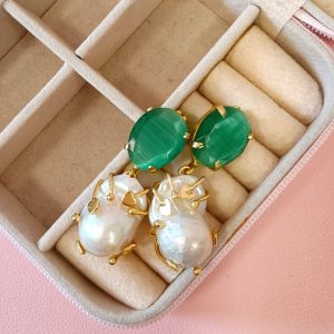Gli orecchini barocche e occhio di gatto raccontano un’eleganza che nasce dall’incontro tra natura e design. La perla barocca, con la sua forma irregolare e luminosa, si abbina alla profondità magnetica dell’occhio di gatto verde, creando un equilibrio raffinato e ricercato.
