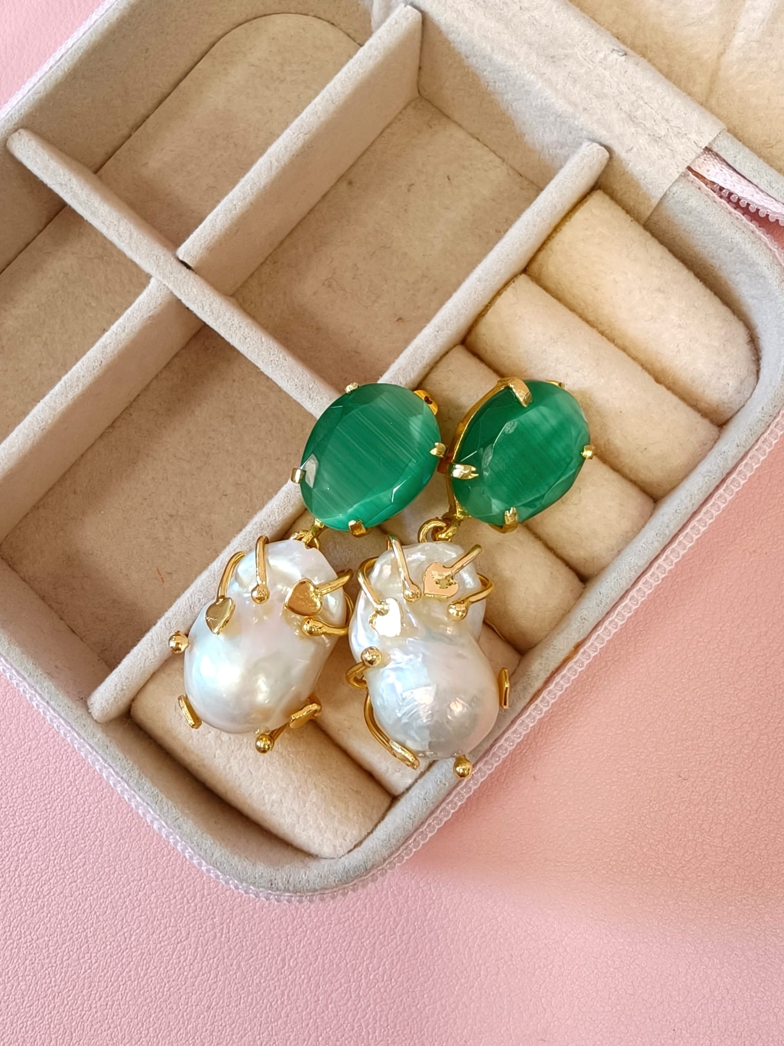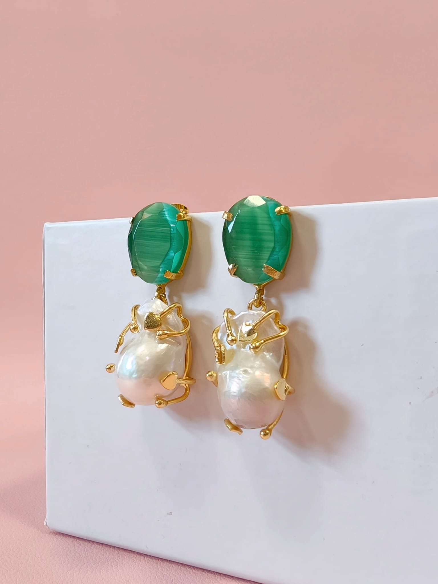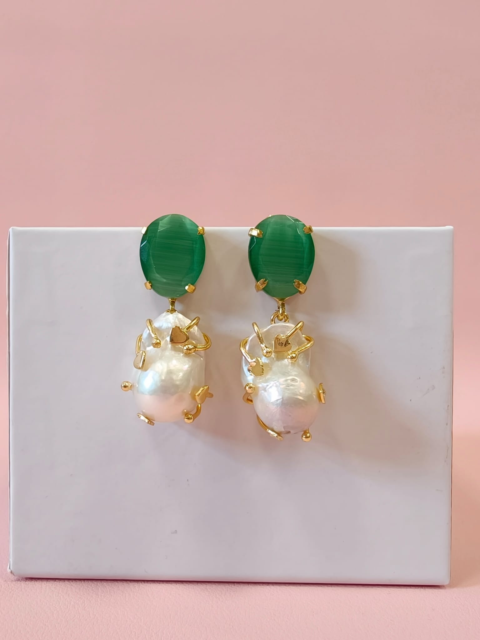 Gli orecchini barocche e occhio di gatto raccontano un’eleganza che nasce dall’incontro tra natura e design. La perla barocca, con la sua forma irregolare e luminosa, si abbina alla profondità magnetica dell’occhio di gatto verde, creando un equilibrio raffinato e ricercato.