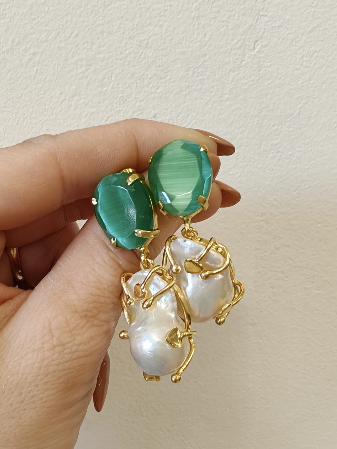 Materiali: ottone dorato, perla barocca naturale e occhio di gatto verde.