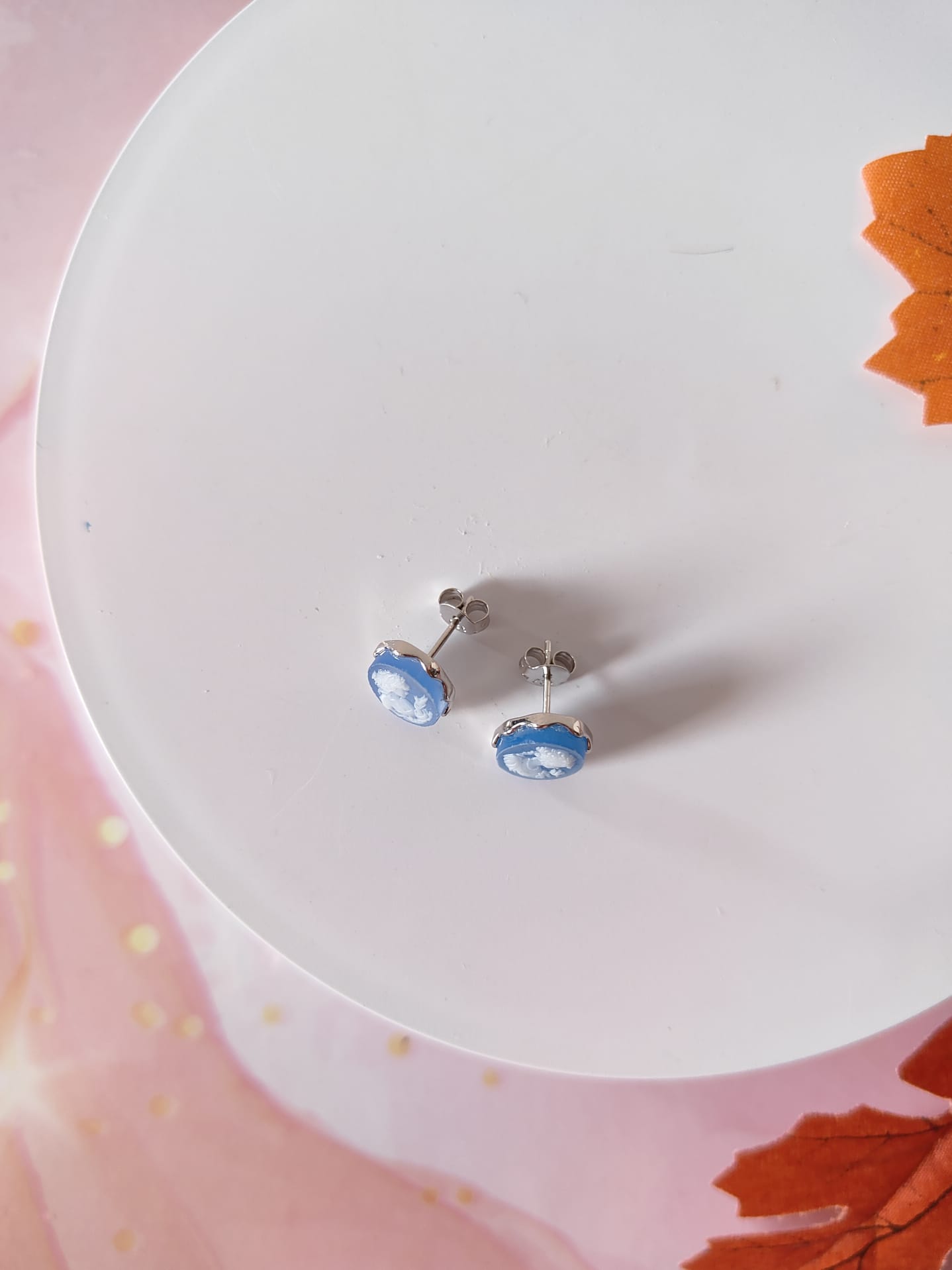 Il contrasto tra il fondo azzurro e il rilievo bianco crea un effetto visivo luminoso e raffinato, ideale per illuminare il viso con discrezione. L’agata, pietra nota per le sue proprietà simboliche legate alla calma e alla protezione, aggiunge ulteriore valore a questi orecchini, rendendoli un dono significativo oltre che un prezioso ornamento.