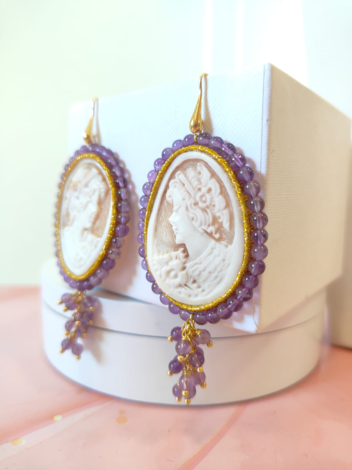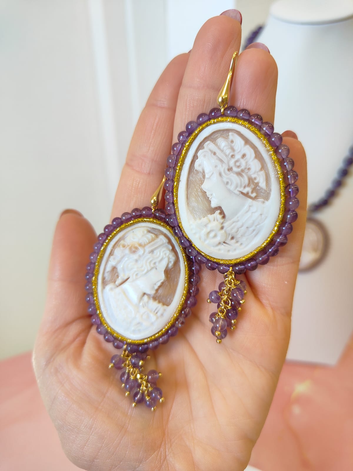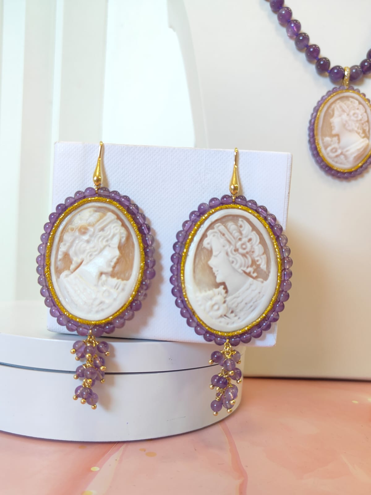 Orecchini Cammeo E Ametista Incisi A Mano