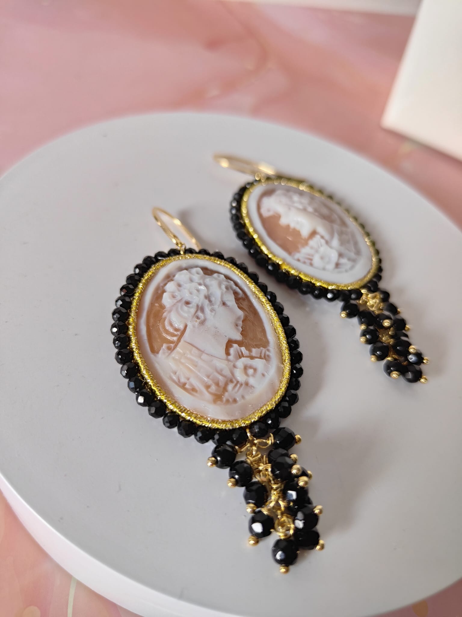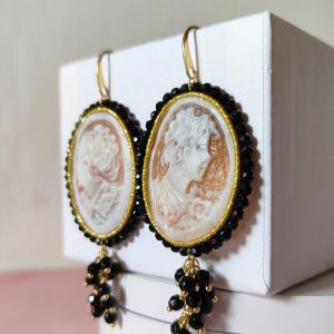 Gli orecchini cammeo e onice nero sono una raffinata espressione di eleganza artigianale e fascino senza tempo. Ogni coppia è realizzata a mano con cura e attenzione ai dettagli, fondendo la tradizione del cammeo inciso con la luminosità misteriosa dell’onice.
