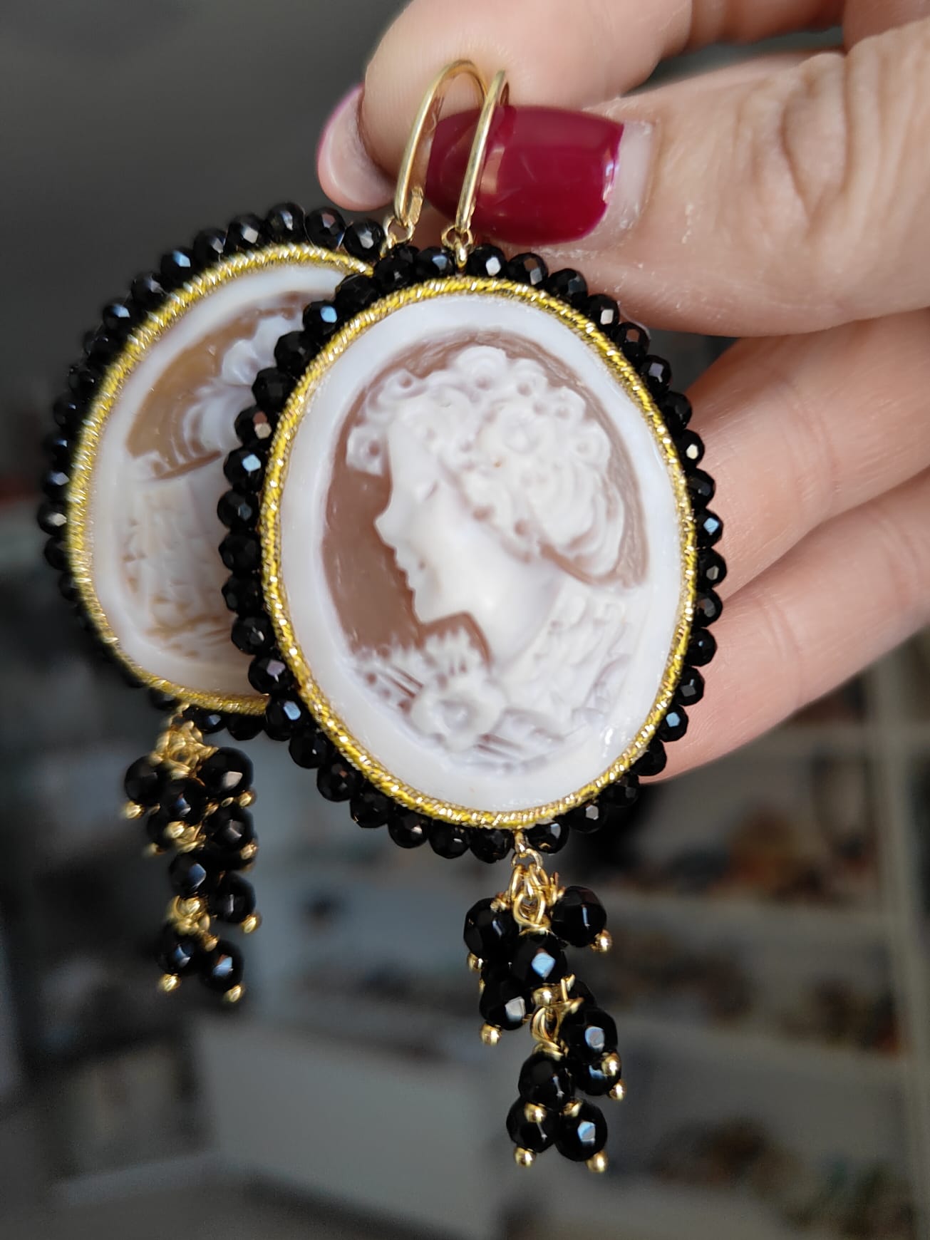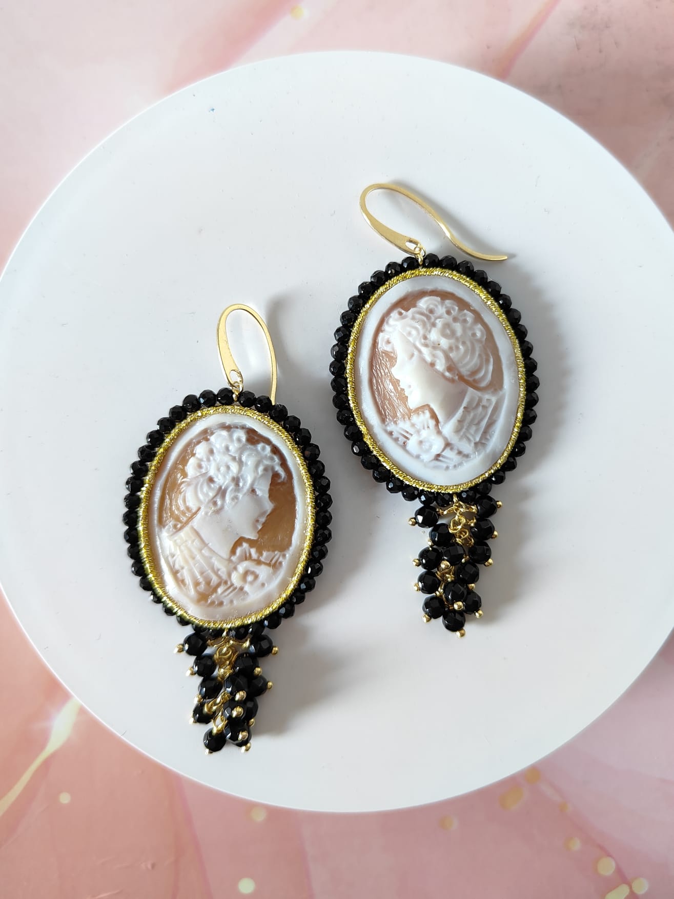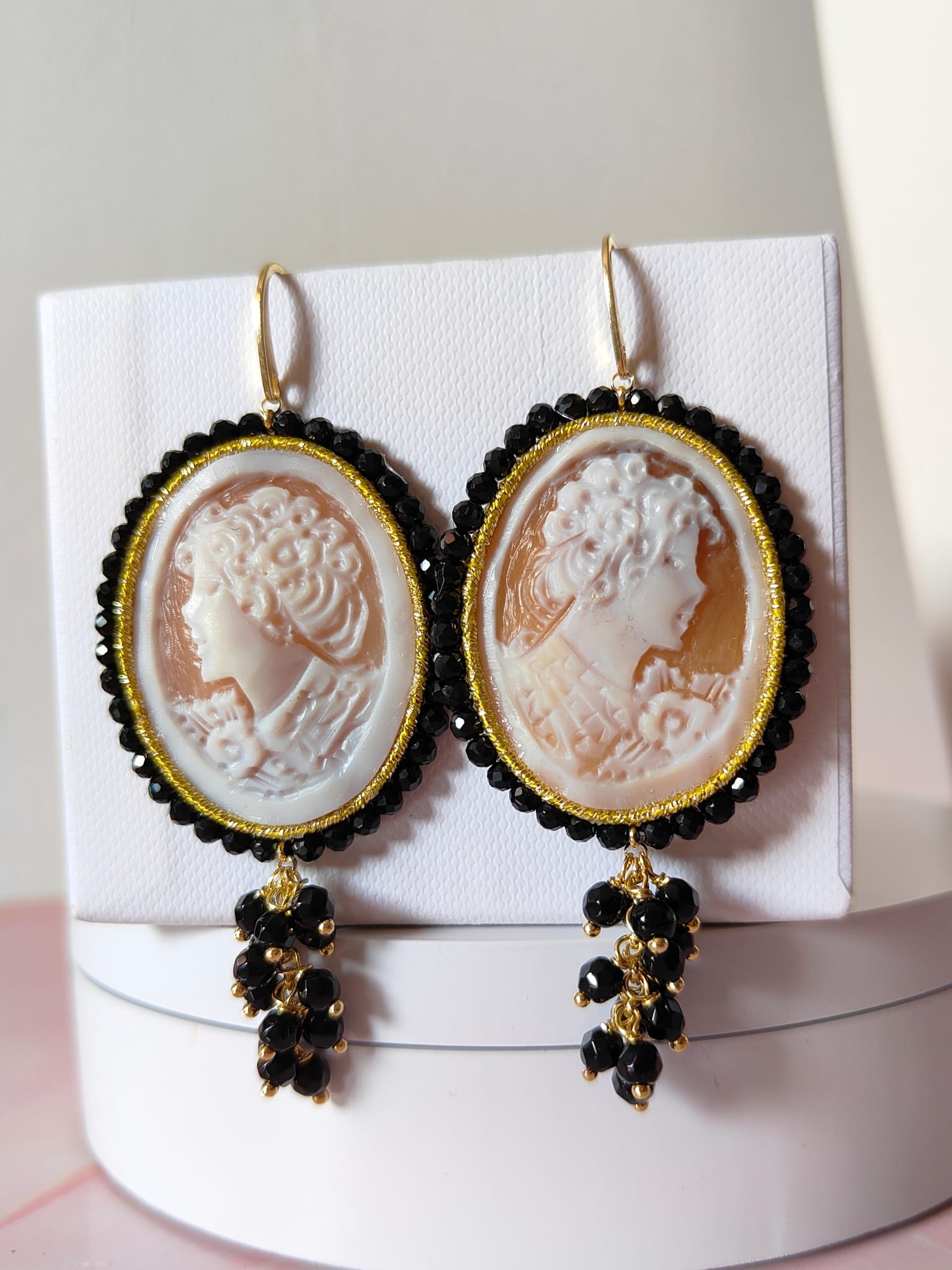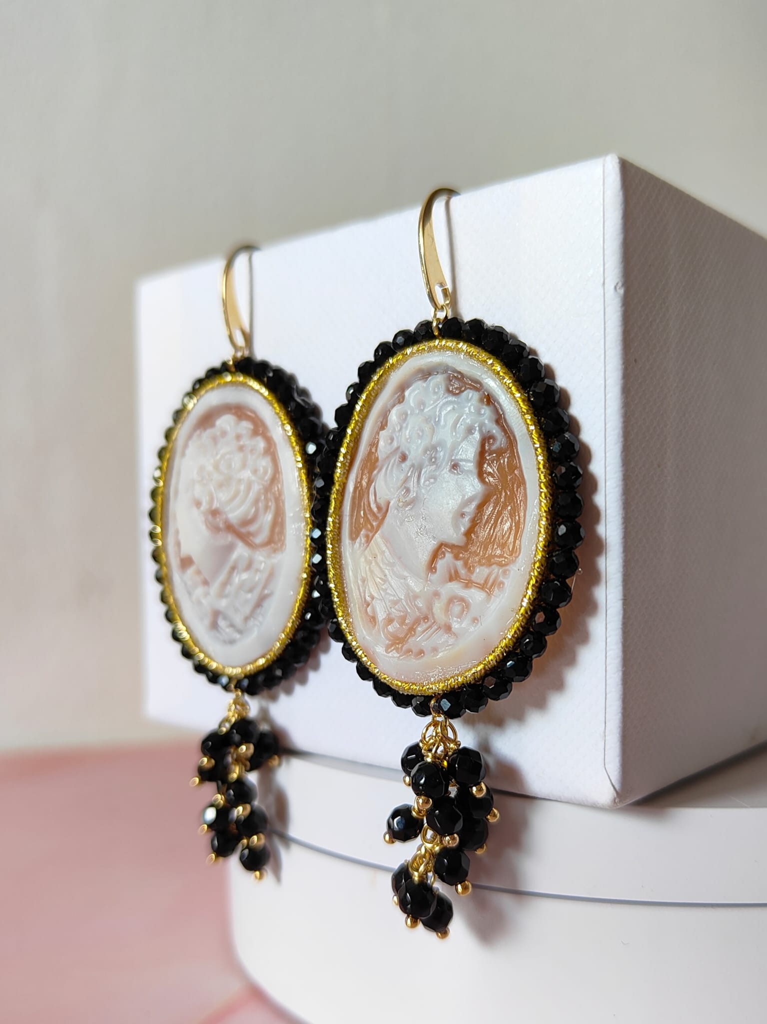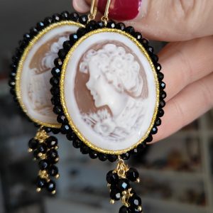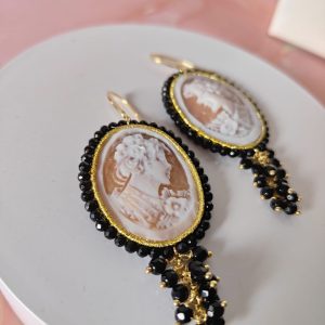 Ogni dettaglio degli orecchini è studiato per creare armonia: i riflessi dei cristalli si fondono con le sfumature naturali del cammeo, mentre l’onice nero incornicia la composizione con un tocco di carattere. Indossarli significa portare con sé una piccola opera d’arte capace di donare personalità a qualsiasi outfit.
