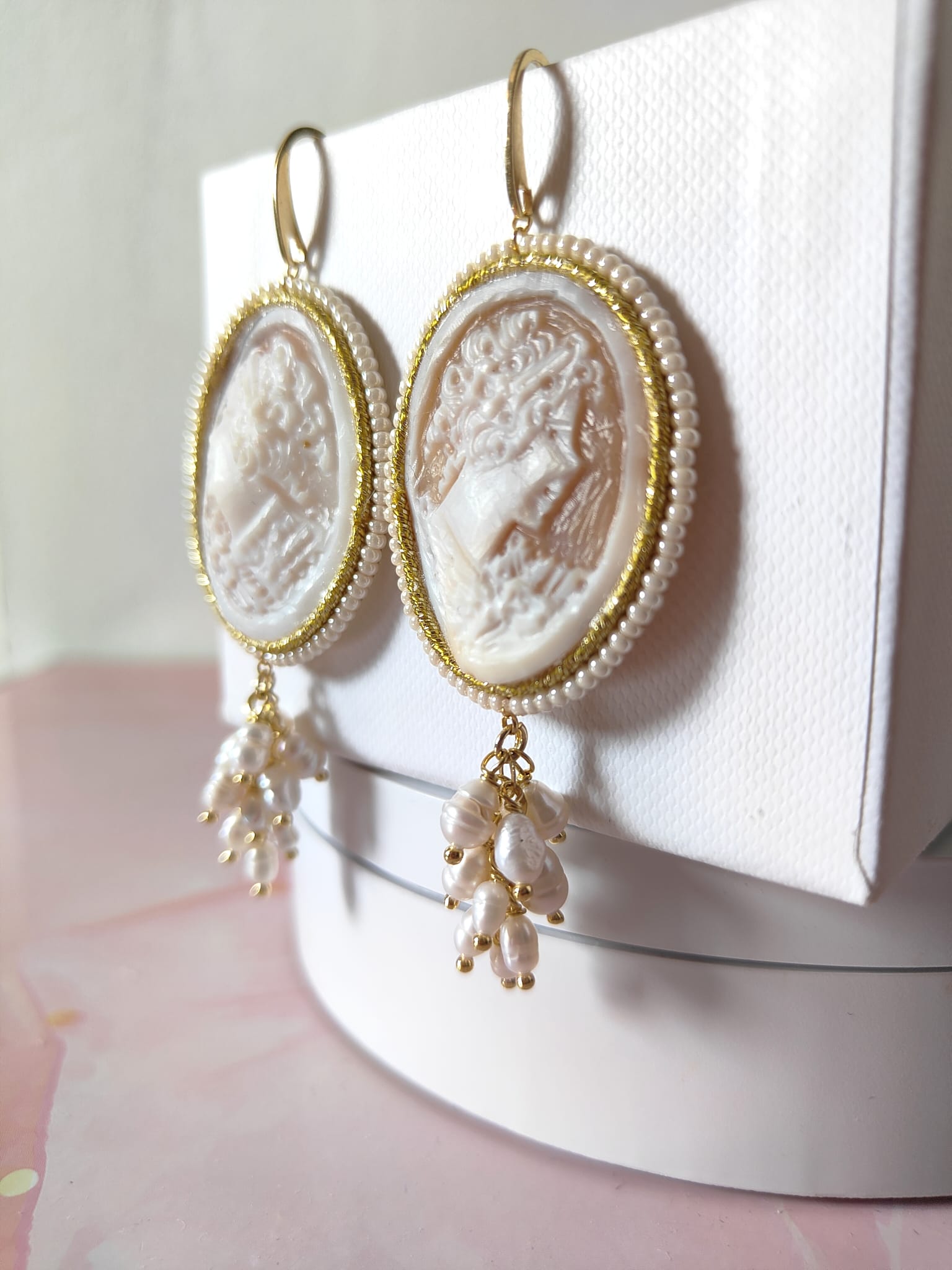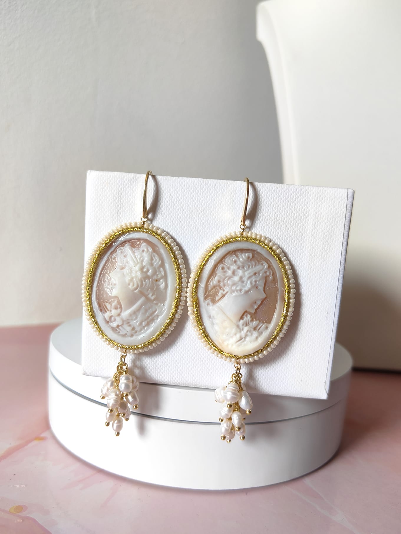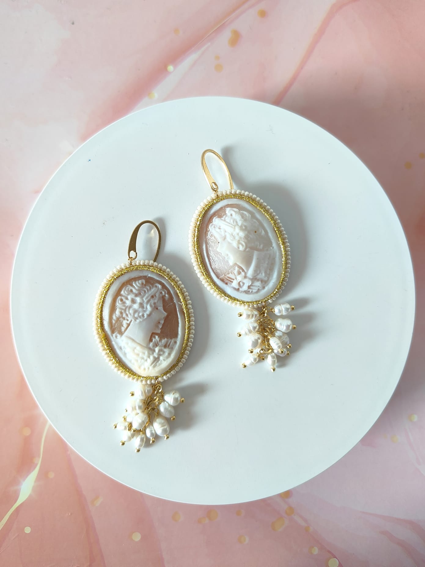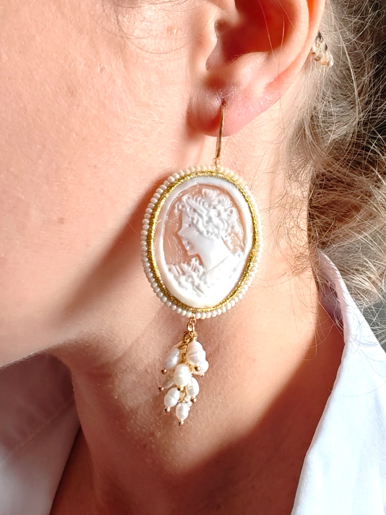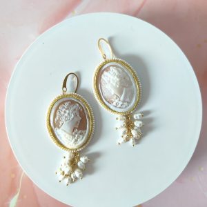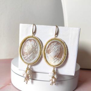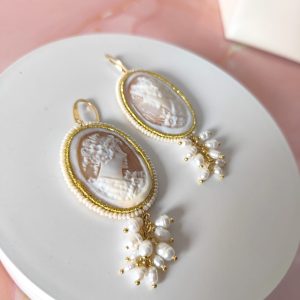 Il cammeo, inciso a mano su conchiglia sardonica, raffigura un delicato profilo femminile circondato da fiori. La cornice dorata e le piccole perline che la adornano creano un contrasto armonioso con la morbidezza delle perle. Le monachelle, realizzate in argento 925 placcato oro, assicurano una vestibilità comoda e una lucentezza calda che esalta il volto con discreta eleganza.