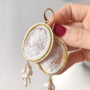 Gli orecchini cammeo e perle barocche sono un omaggio all’eleganza senza tempo e alla bellezza artigianale italiana. Ogni dettaglio racconta una storia di maestria e di luce: dal cammeo sardonico inciso a mano al grappolo di perle naturali, tutto è pensato per valorizzare la femminilità con un tocco raffinato e unico.