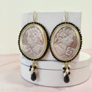 Ogni cammeo è inciso a mano, quindi può presentare leggere variazioni nel tratto e nei dettagli del volto. Le perle e le pietre naturali non sono mai identiche tra loro: proprio per questo ogni coppia di orecchini porta con sé un carattere irripetibile. Di conseguenza, indossarli significa scegliere un gioiello artigianale che racconta la cura del lavoro manuale.