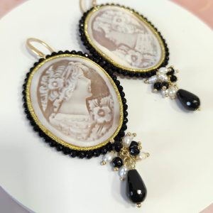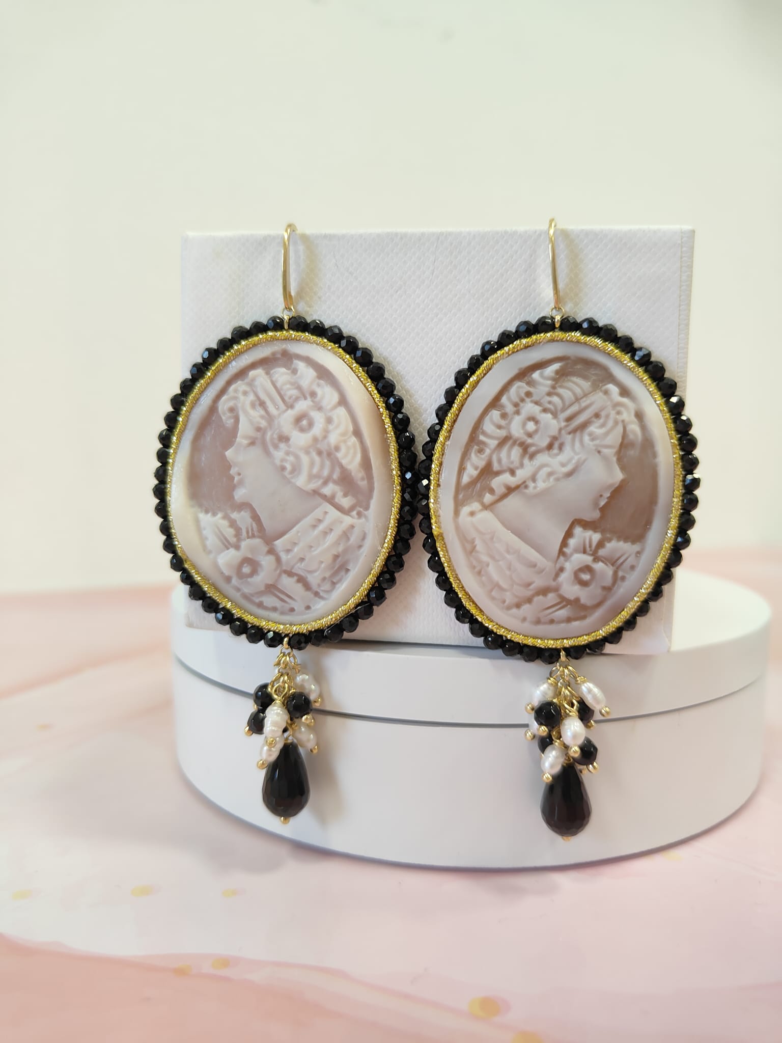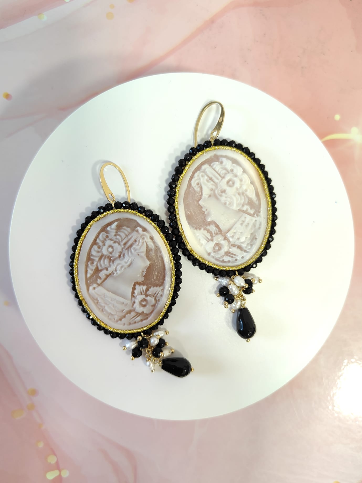 La cornice di ogni cammeo è rifinita con un cordoncino dorato che ne segue dolcemente i contorni. Subito all’esterno, una fitta corona di cristalli neri sfaccettati aggiunge profondità e luce, esaltando il gioco di chiaroscuri. Le piccole perle naturali e le gocce di onice nero pendono alla base come un piccolo grappolo mobile, così ogni movimento del capo crea riflessi e ritmo.
