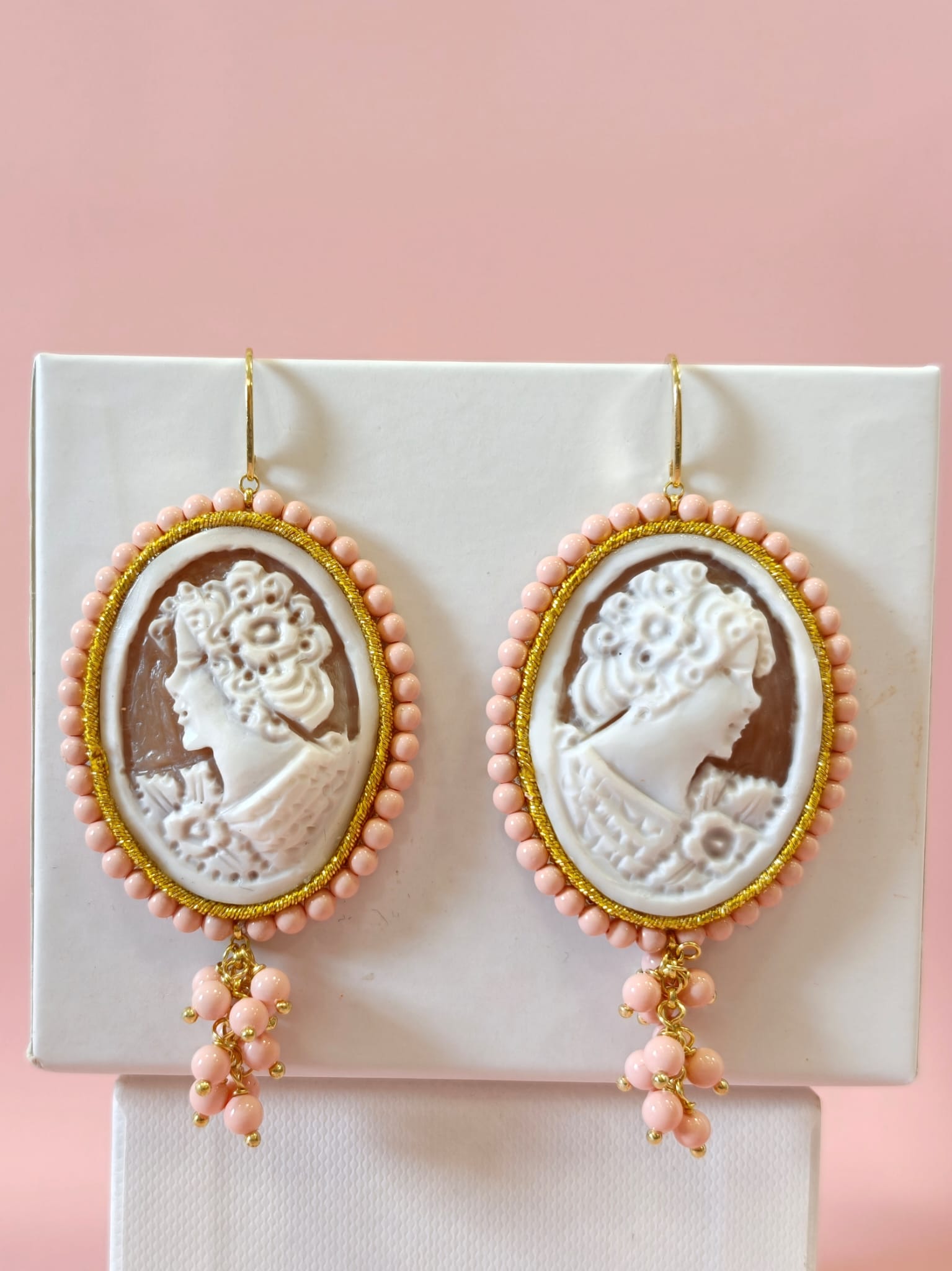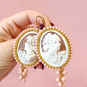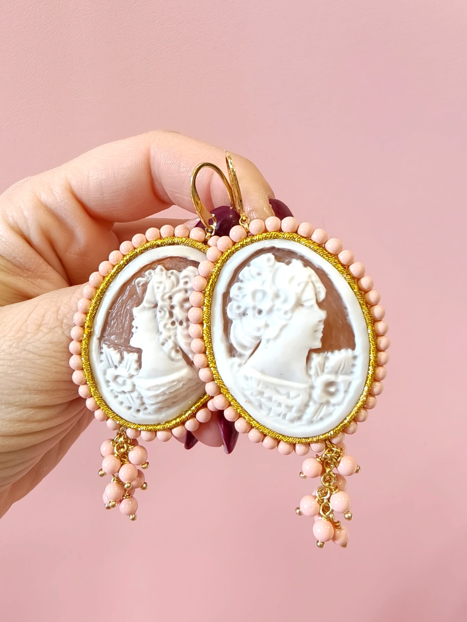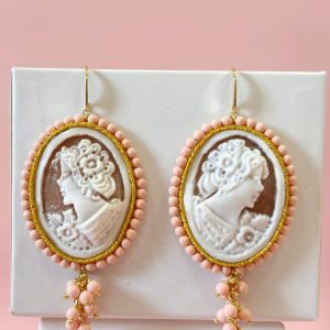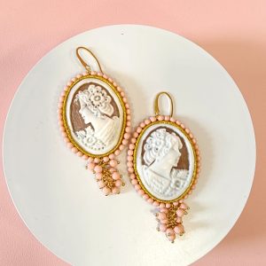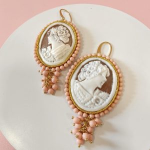 Nella parte inferiore, un delicato grappolo di pasta di corallo rosa aggiunge movimento e un tocco di femminilità sofisticata. Il rosa tenue dialoga con l’avorio del cammeo e con i riflessi dorati della montatura, creando un equilibrio elegante e ricercato.
