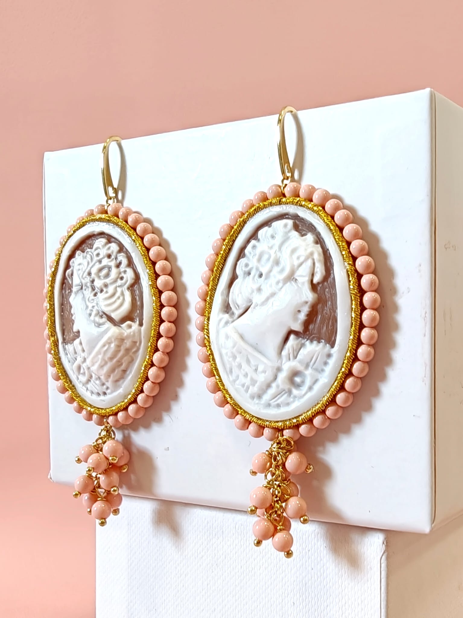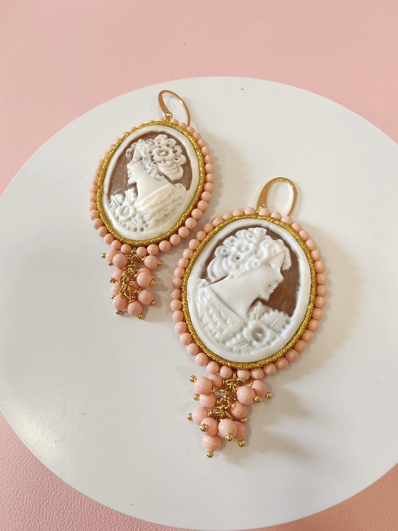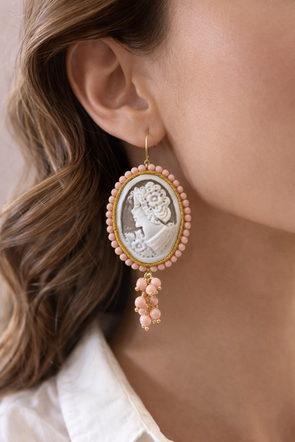 Nella parte inferiore, un delicato grappolo di pasta di corallo rosa aggiunge movimento e un tocco di femminilità sofisticata. Il rosa tenue dialoga con l’avorio del cammeo e con i riflessi dorati della montatura, creando un equilibrio elegante e ricercato.