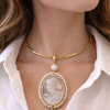 Ogni cammeo misura 49×39 mm ed è rifinito sui bordi con cura artigianale, così da esaltarne la forma ovale e l’effetto tridimensionale dell’incisione. La montatura è completata da una monachella in argento 925 placcata oro, scelta per garantire luminosità, qualità e armonia cromatica con i dettagli decorativi.