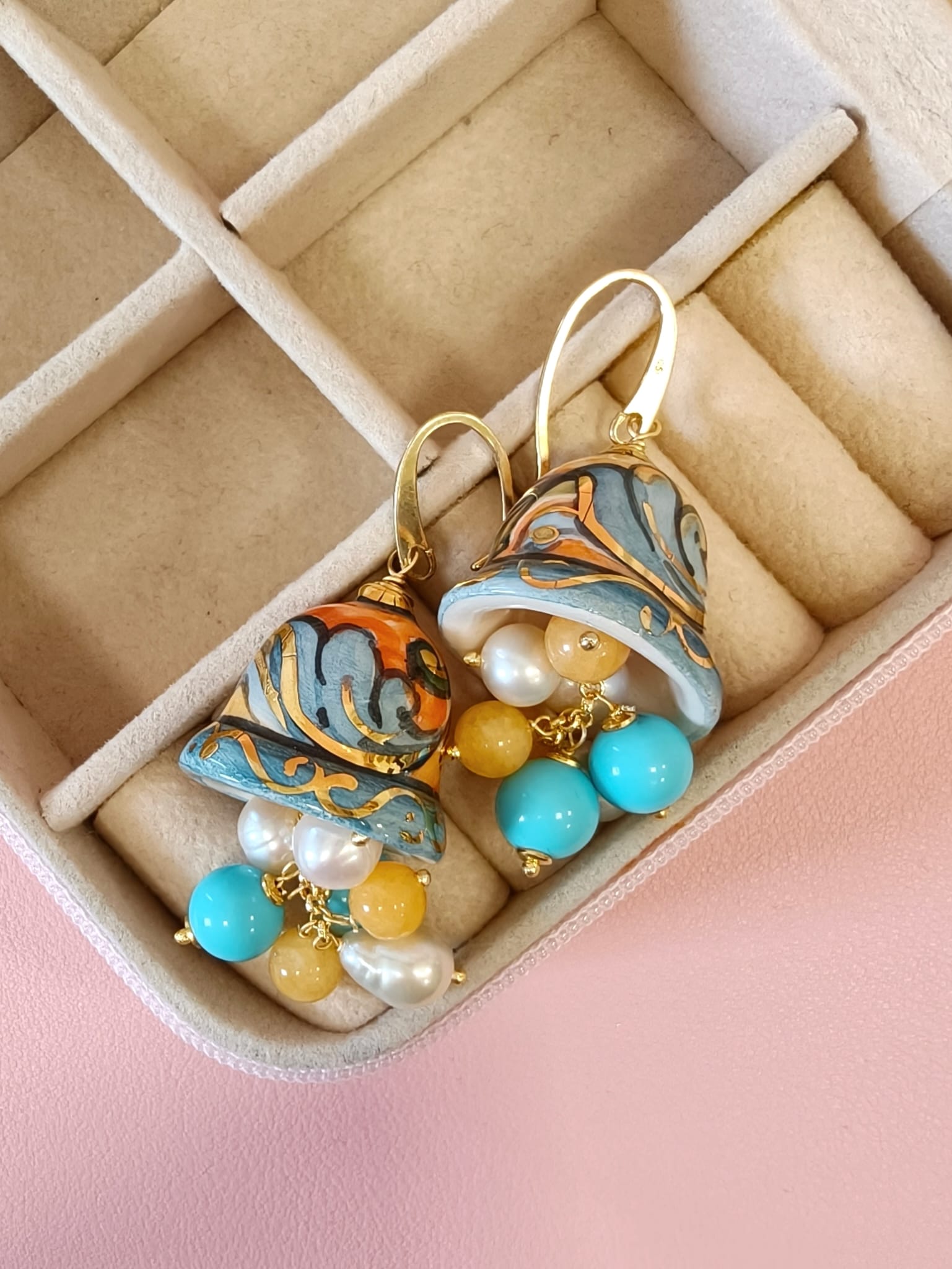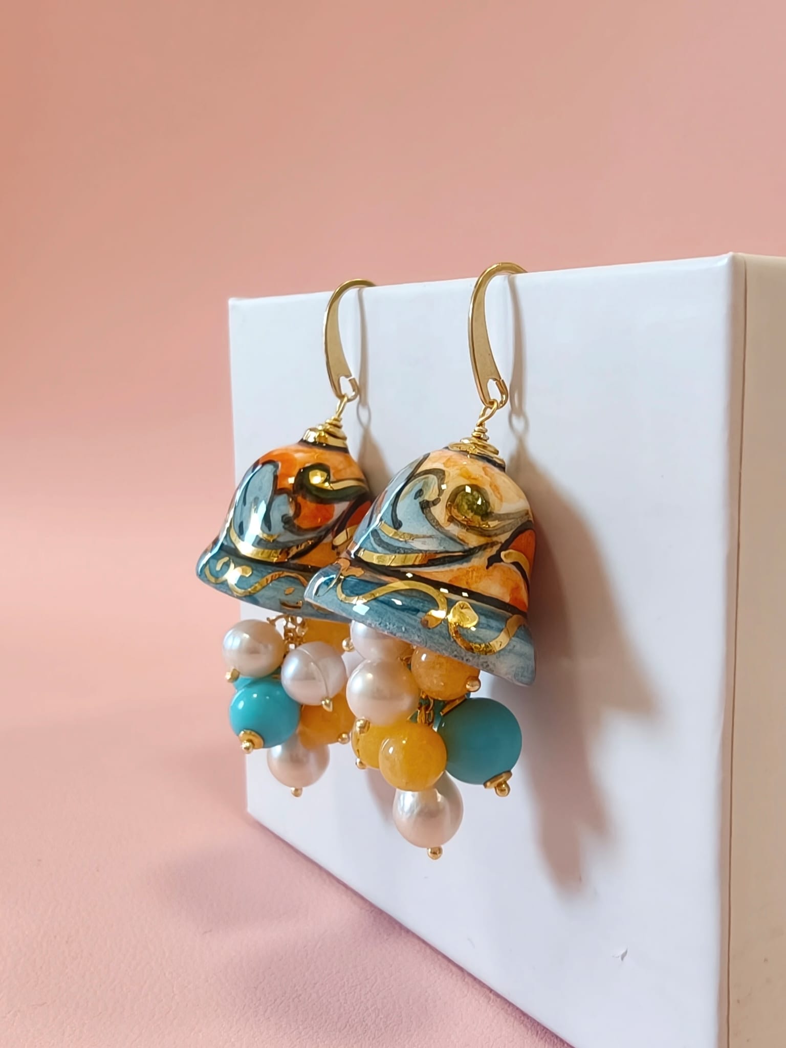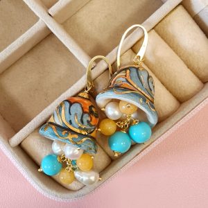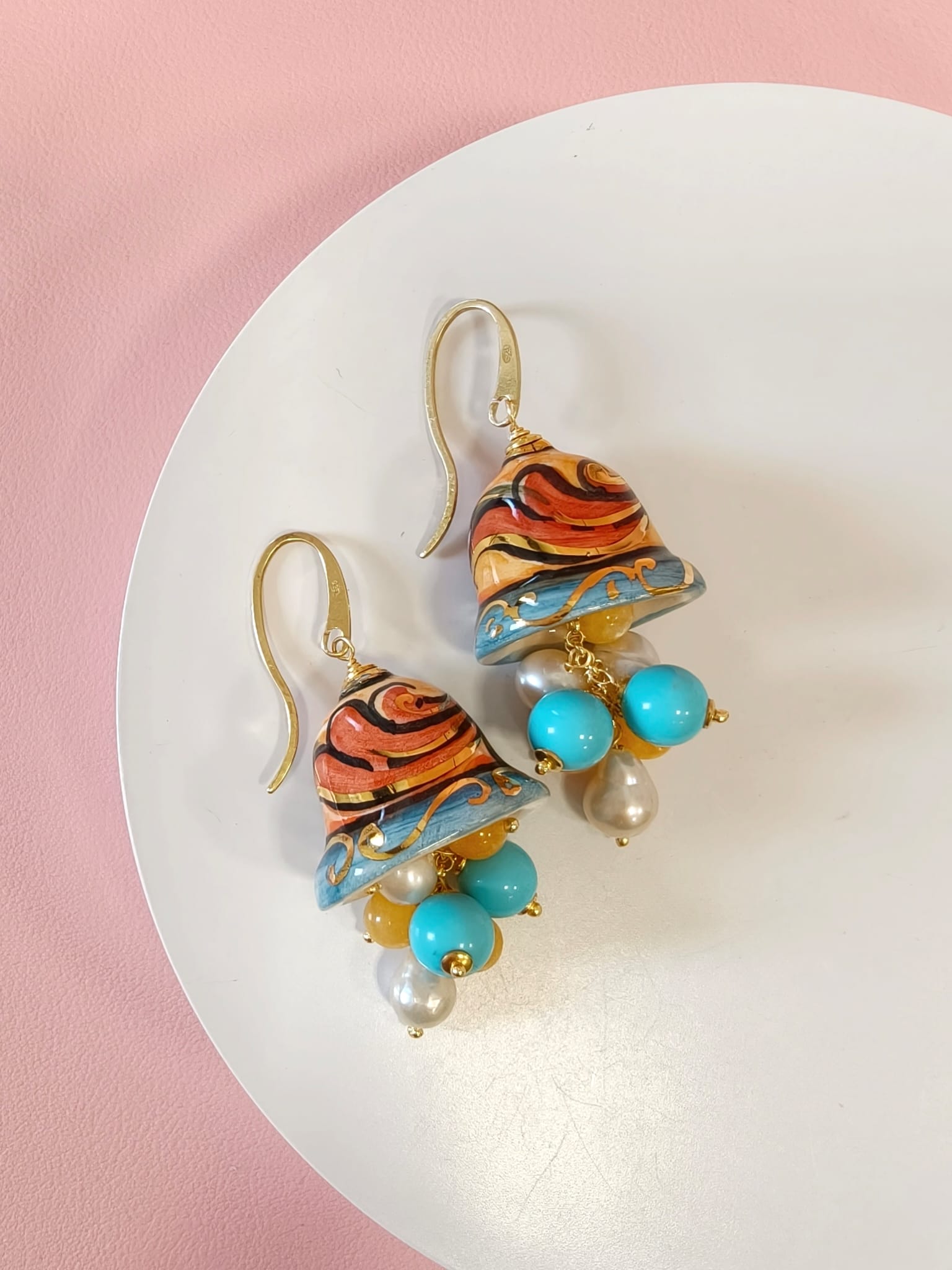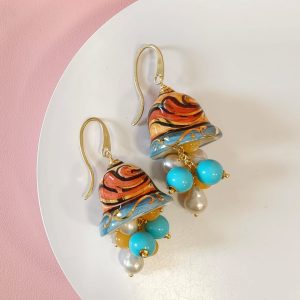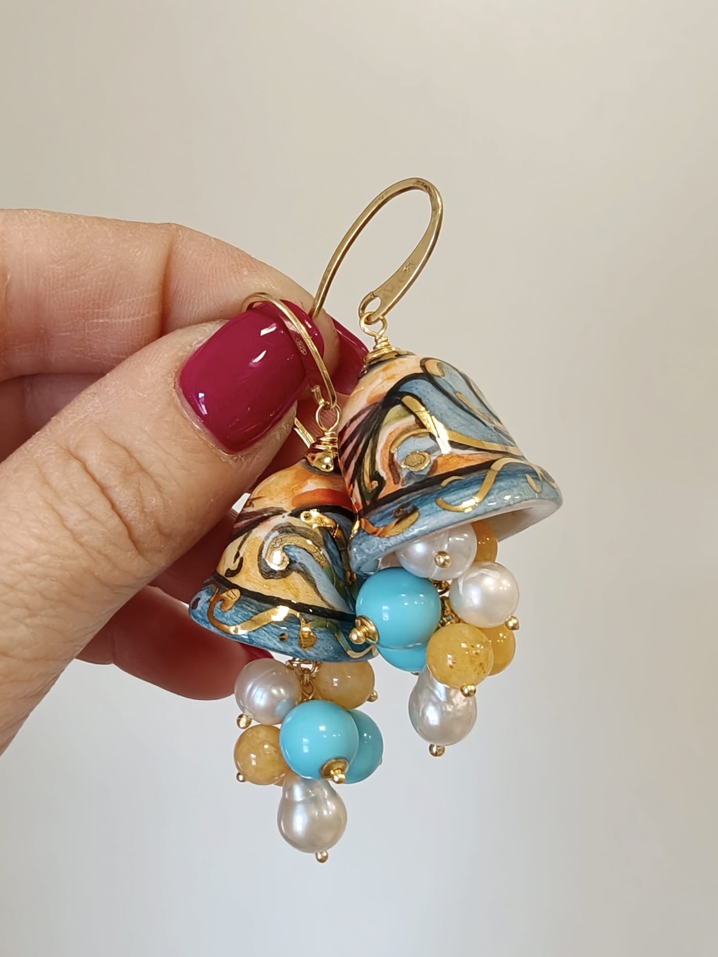 Gli Orecchini Campanelle Siciliane Turchese fondono tradizione e freschezza cromatica con ceramica dipinta a mano, pasta turchese, giada gialla e perle.