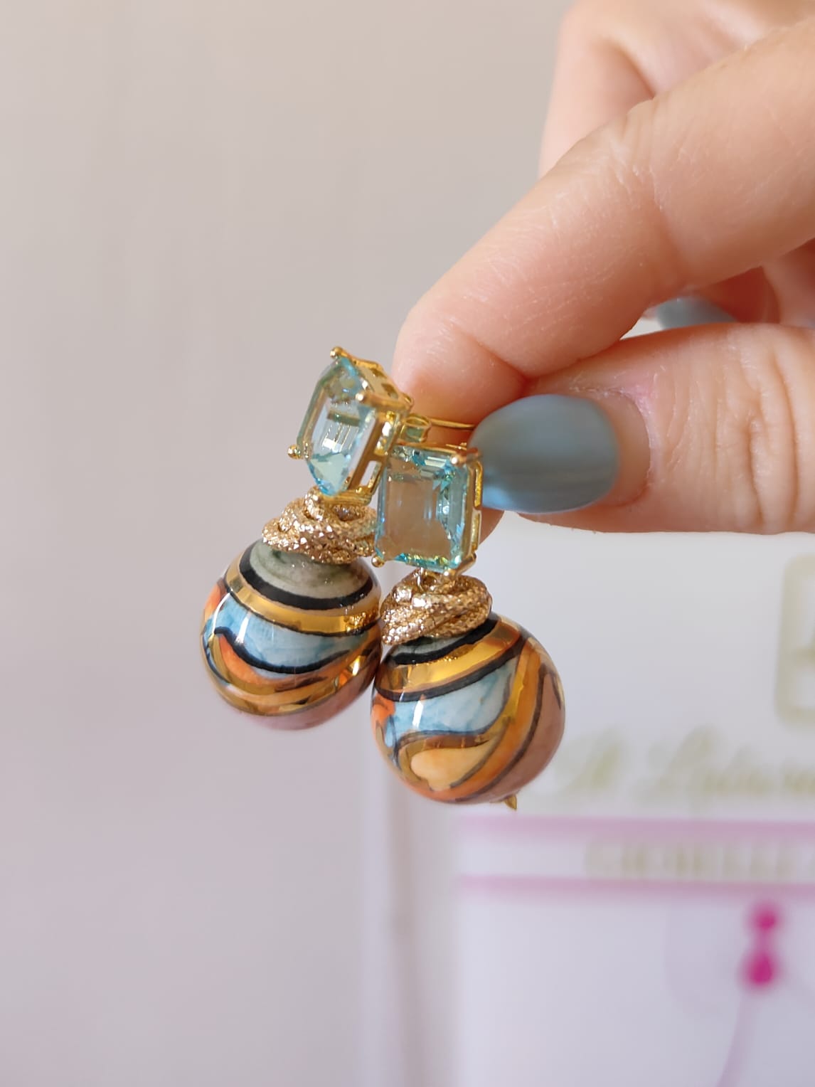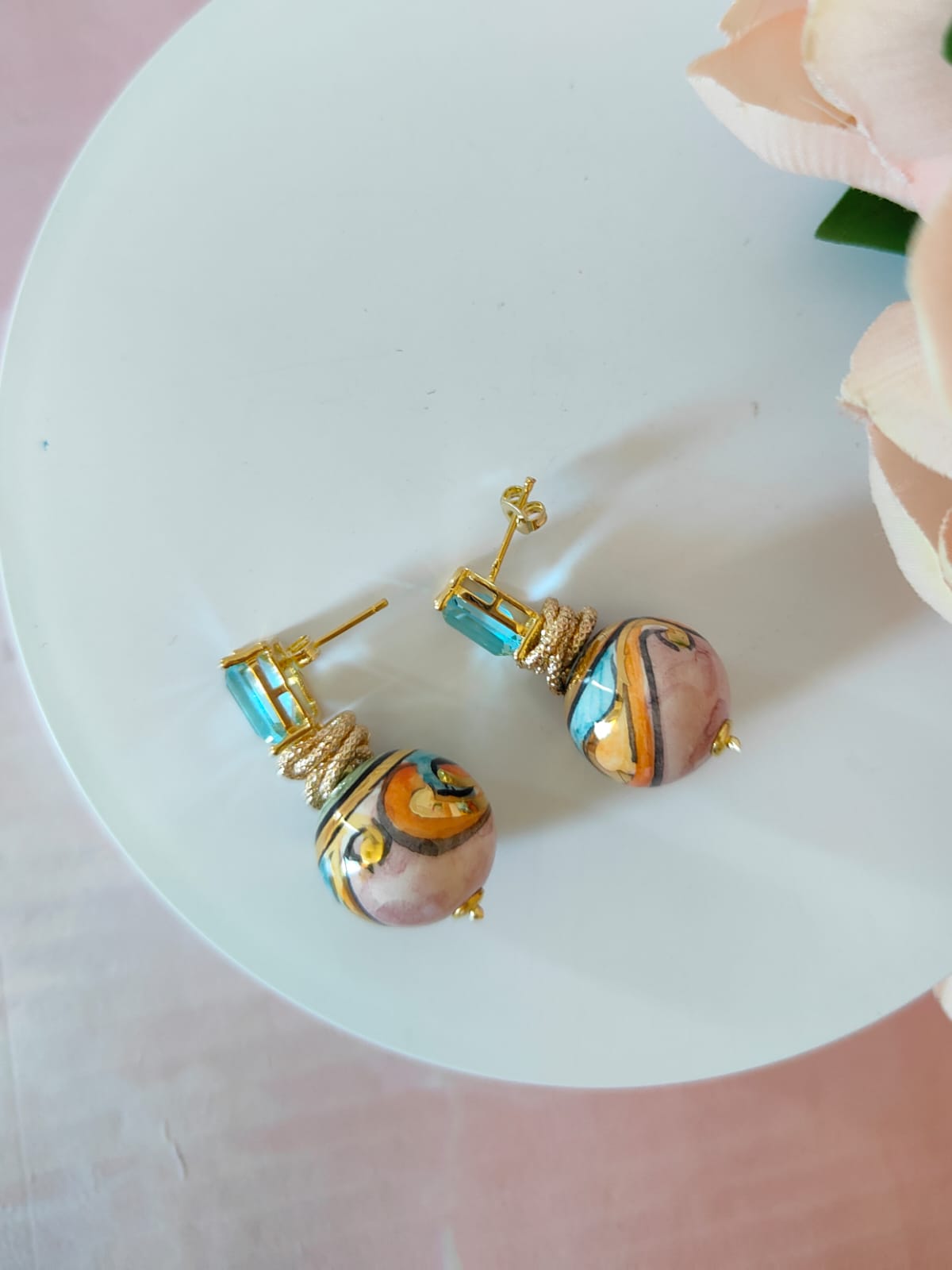 Orecchini ceramica e cristallo che uniscono eleganza e artigianato in un design delicato ma ricco di carattere. Perfetti per chi cerca un gioiello raffinato, colorato e luminoso, in grado di raccontare la bellezza della tradizione con uno stile moderno.