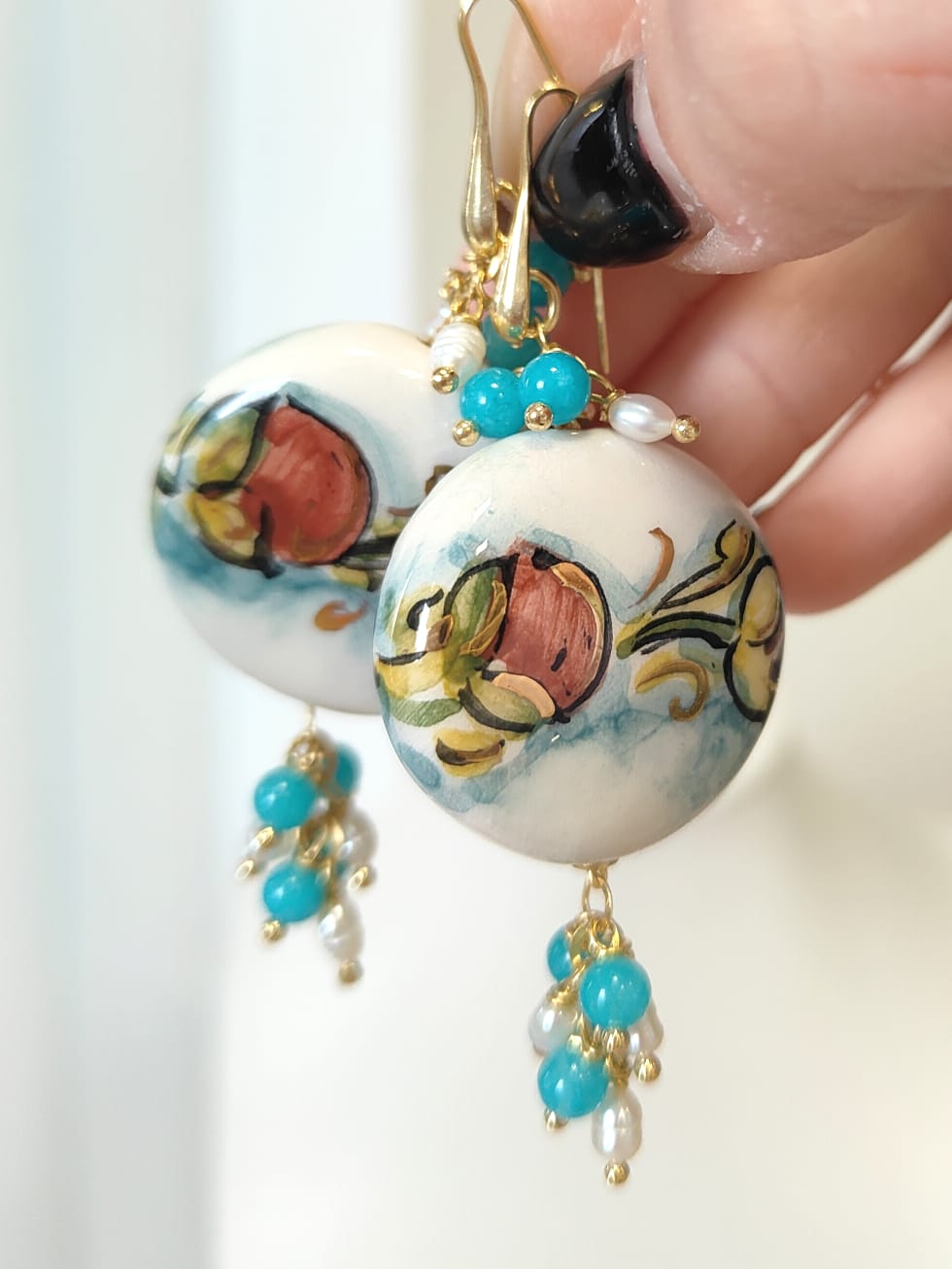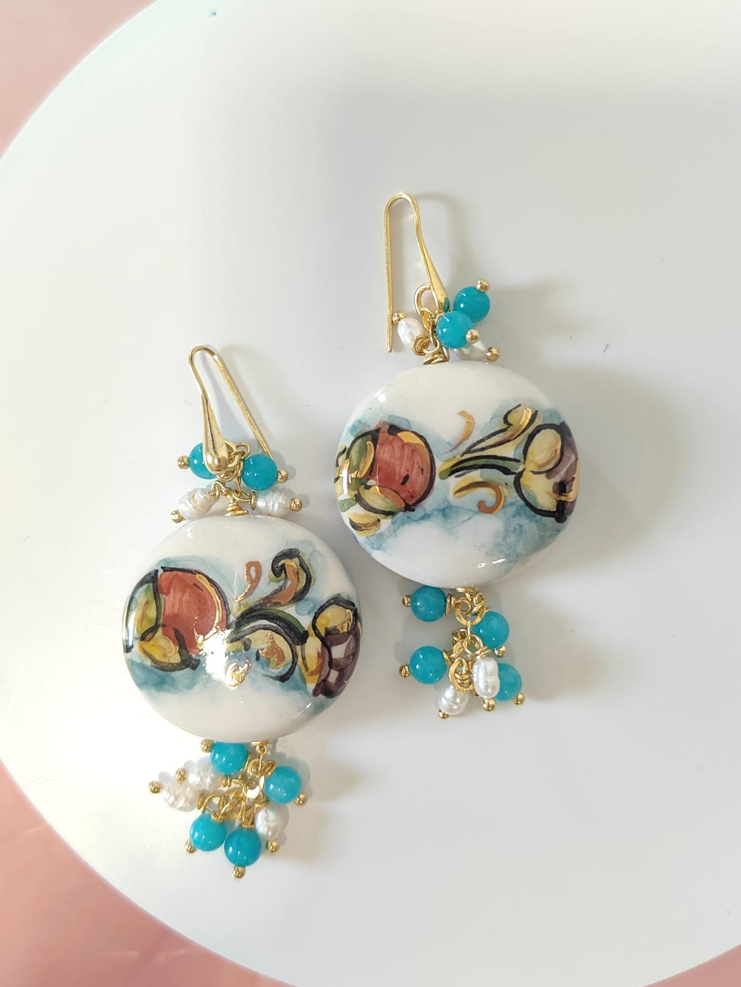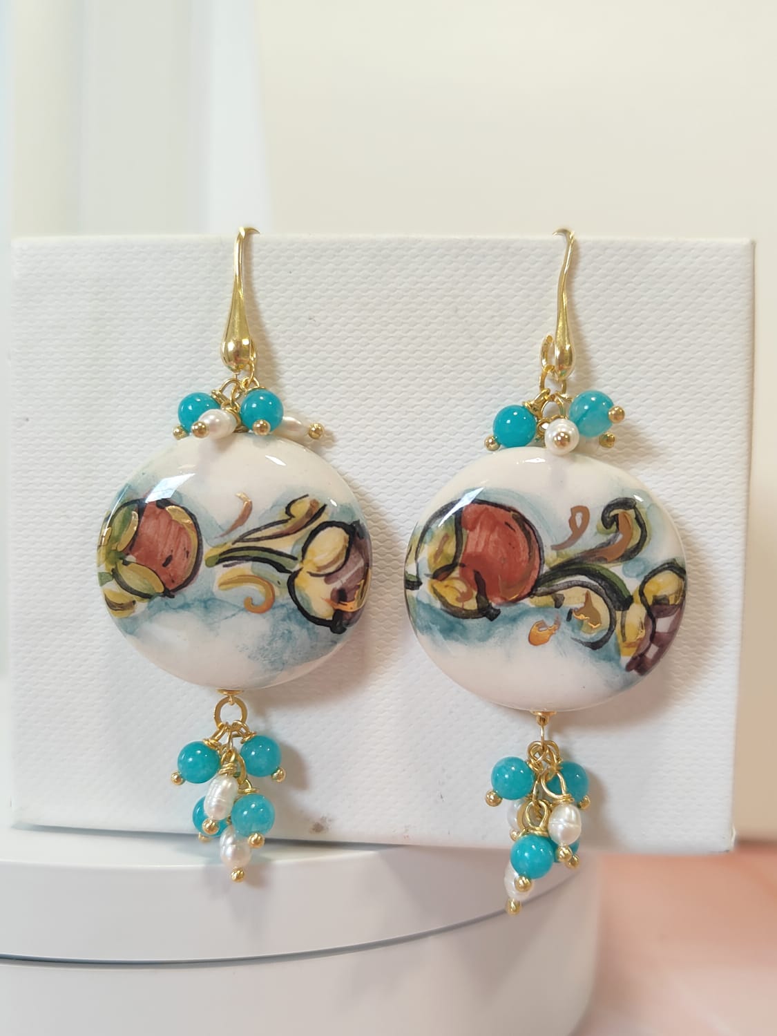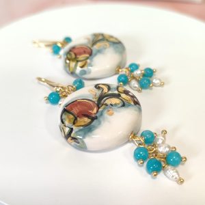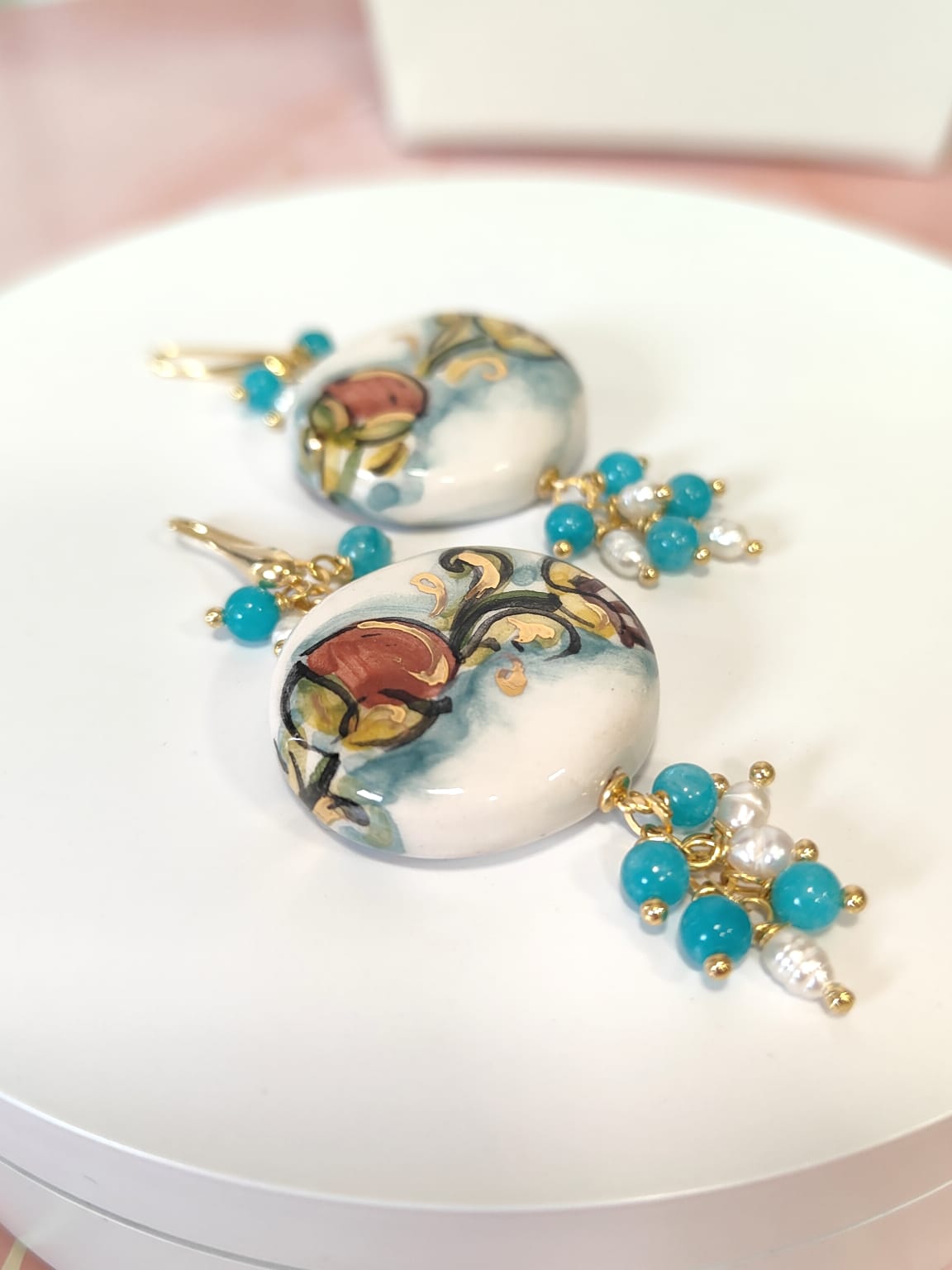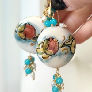 Materiali: ceramica di Caltagirone dipinta a mano, giada turchese, perle naturali