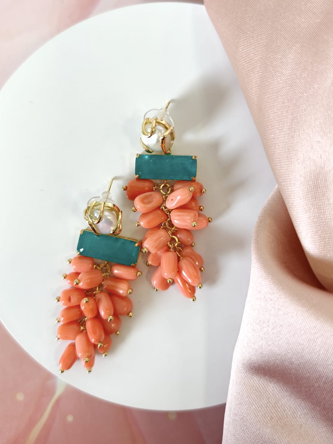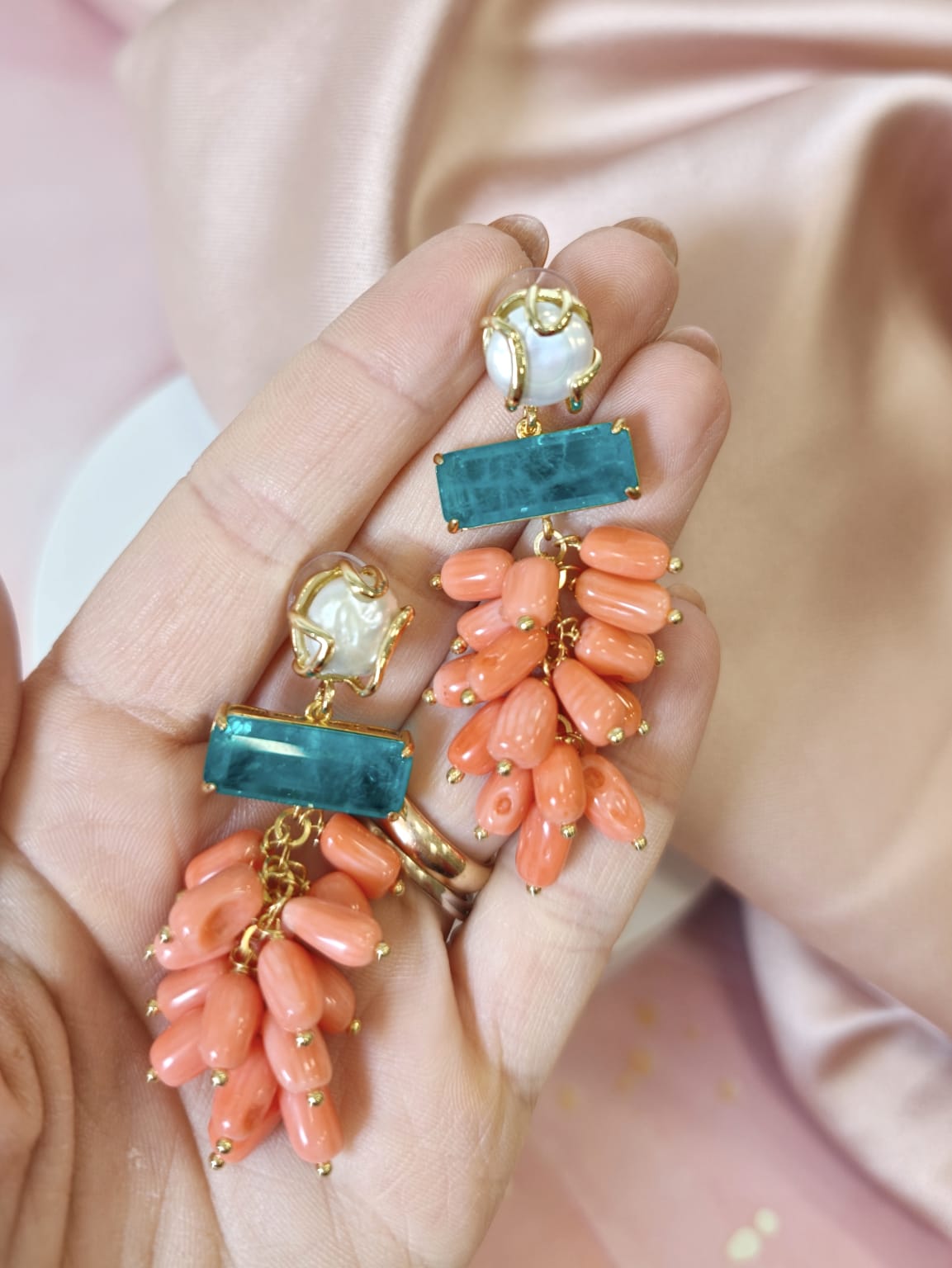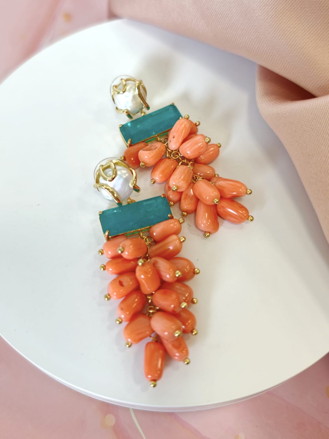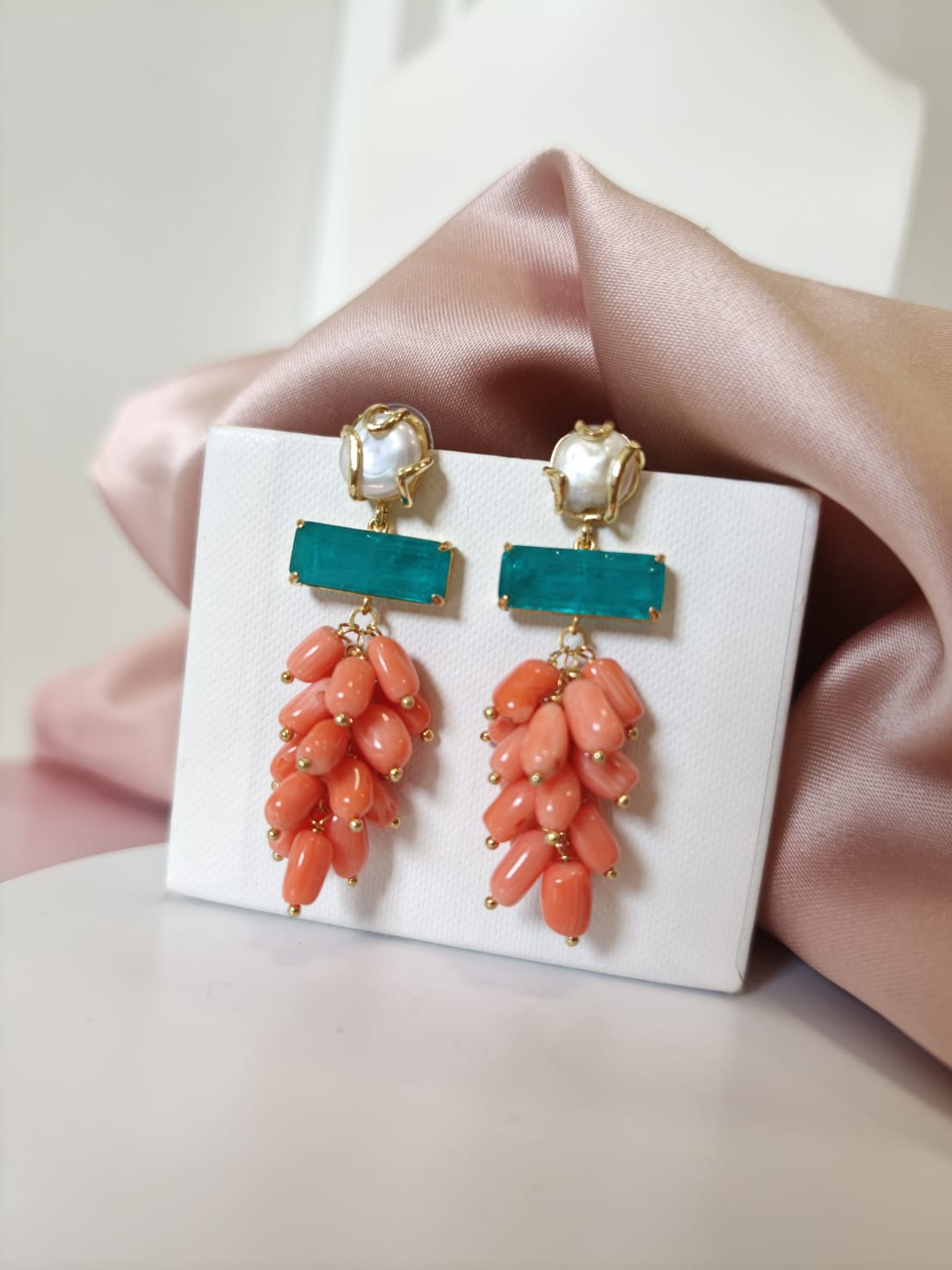 Orecchini Corallo Bamboo Eleganti Con Perla E Quarzo