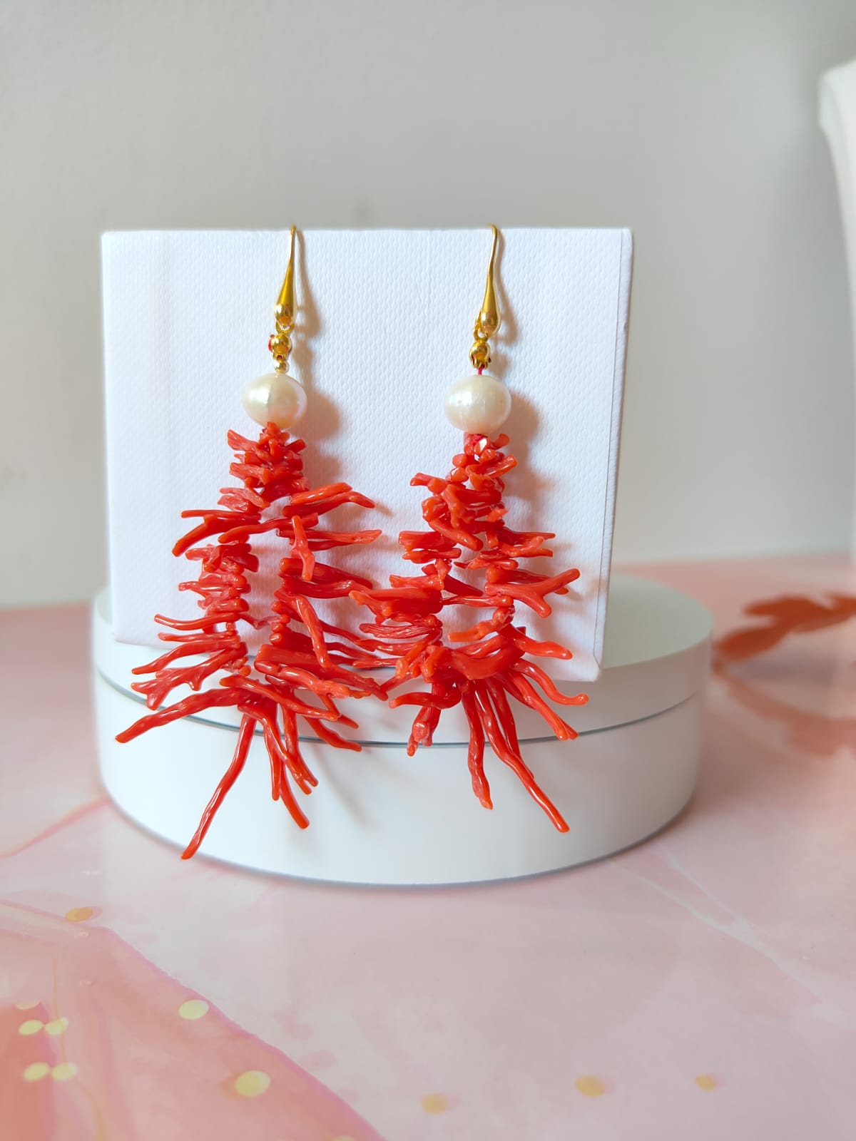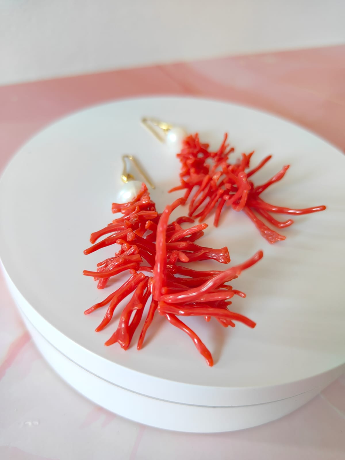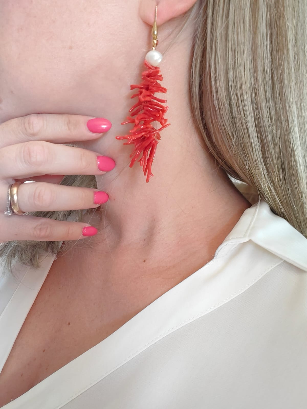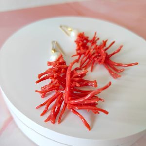 Gli orecchini corallo rosso sono un omaggio autentico alla bellezza del Mediterraneo. Un design audace e ricco di fascino, pensato per chi ama distinguersi con stile. Ogni pezzo è realizzato con veri rami di corallo rosso, modellati in una composizione scultorea e arricchiti da una perla naturale incastonata sopra ogni ramo. La monachella, in argento 925 dorato, completa la creazione con una nota preziosa e delicata.
