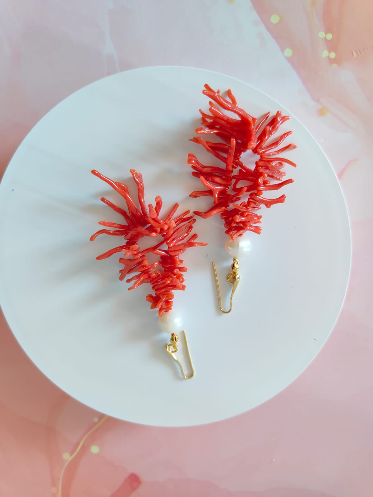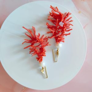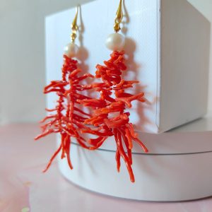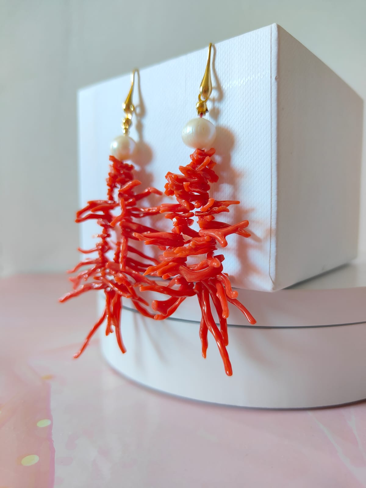 Gli orecchini corallo rosso sono un omaggio autentico alla bellezza del Mediterraneo. Un design audace e ricco di fascino, pensato per chi ama distinguersi con stile. Ogni pezzo è realizzato con veri rami di corallo rosso, modellati in una composizione scultorea e arricchiti da una perla naturale incastonata sopra ogni ramo. La monachella, in argento 925 dorato, completa la creazione con una nota preziosa e delicata.