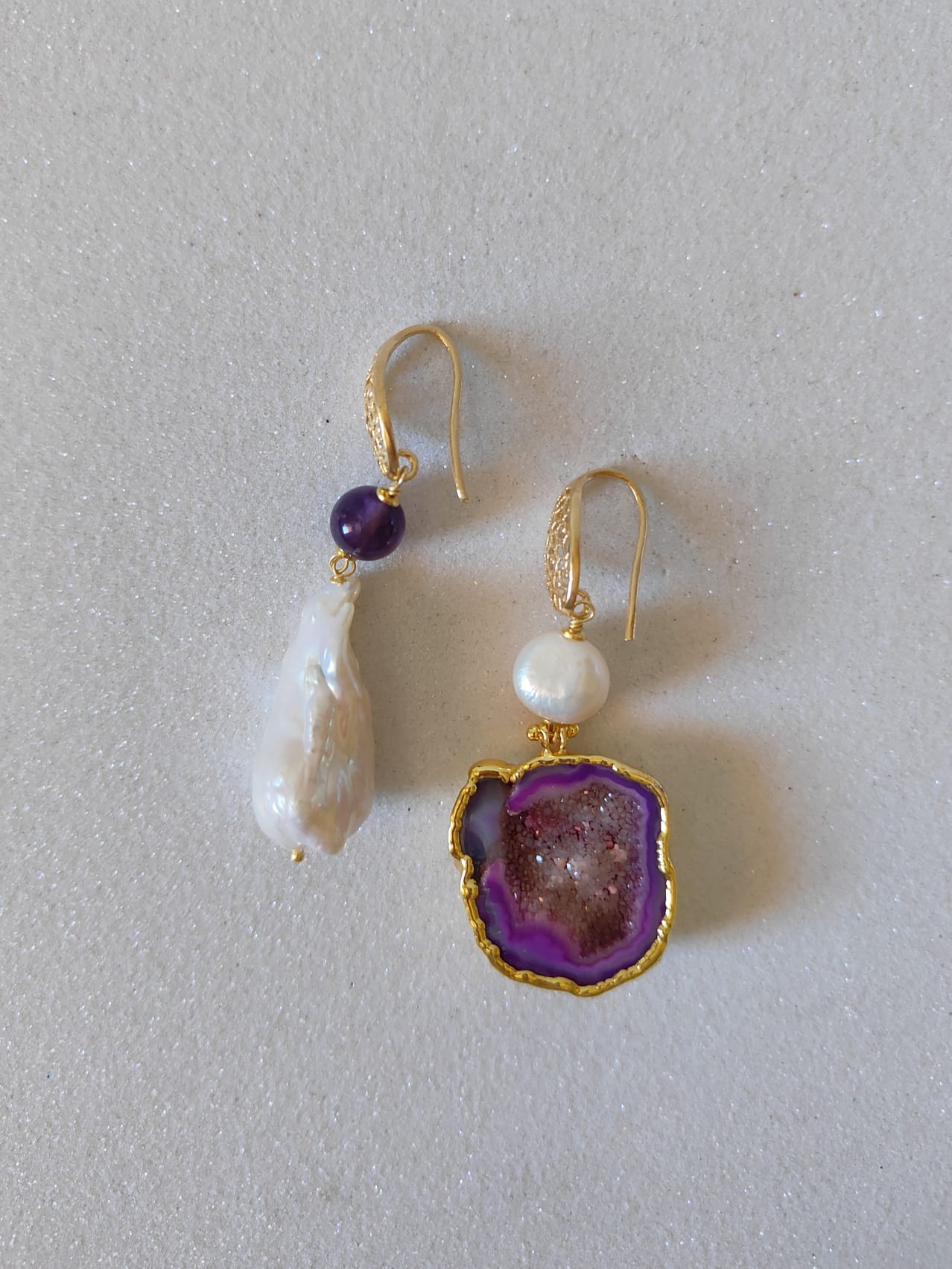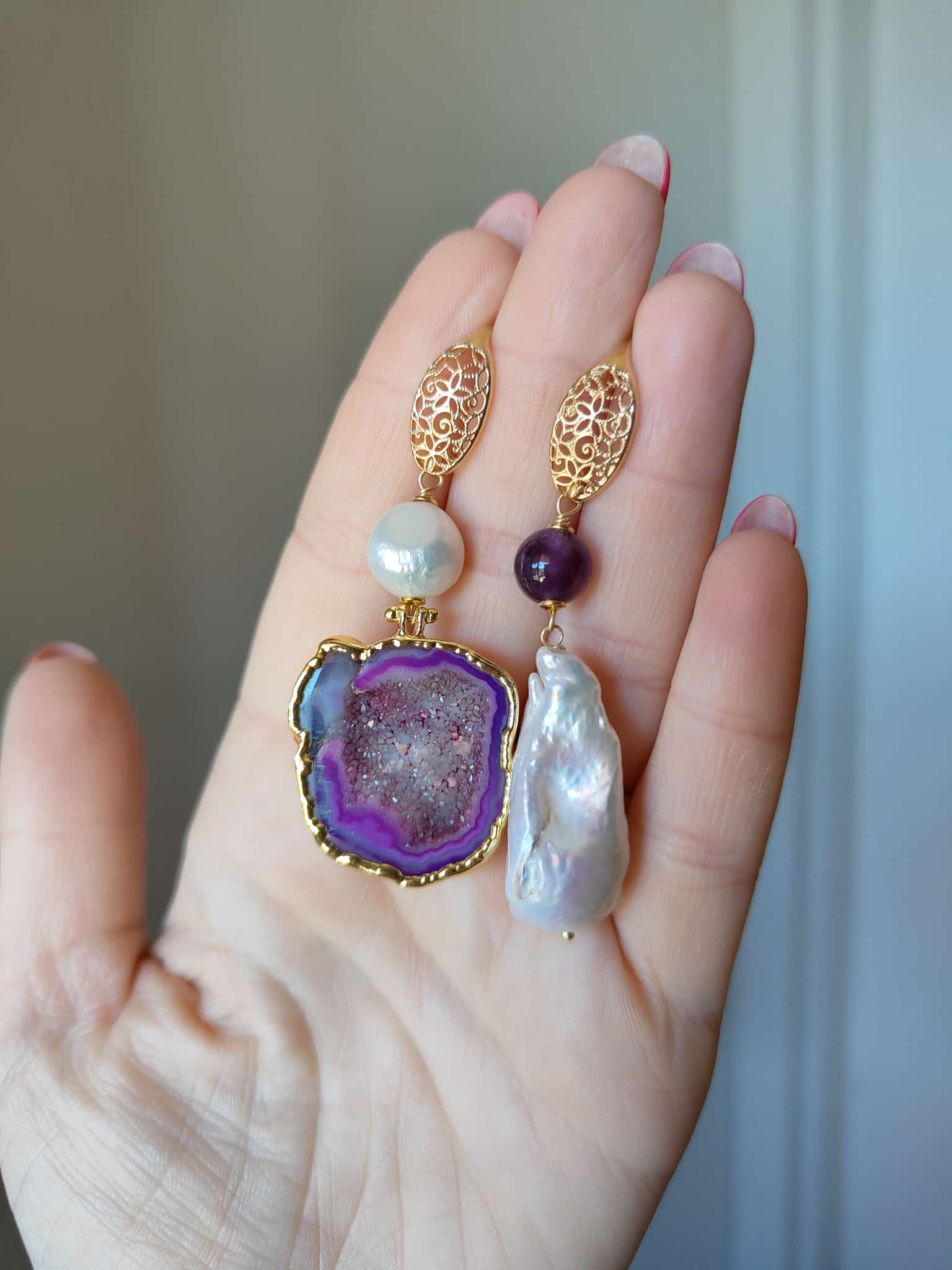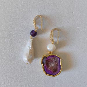 – Materiali: argento 925 placcato oro, ottone dorato, drusa di quarzo viola, perla barocca, ametista