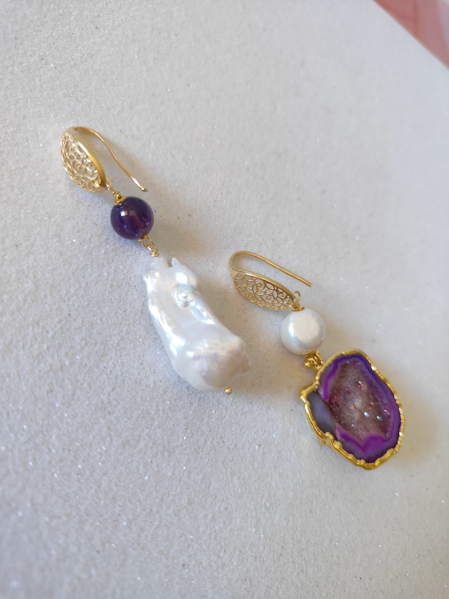 La drusa di quarzo viola, con le sue sfumature cangianti, riflette bagliori unici a ogni movimento. La superficie cristallina cattura la luce e la diffonde, creando un effetto brillante e magnetico. Accanto a essa, la perla barocca si distingue per la sua forma irregolare e per i riflessi madreperlati che ricordano le onde del mare.