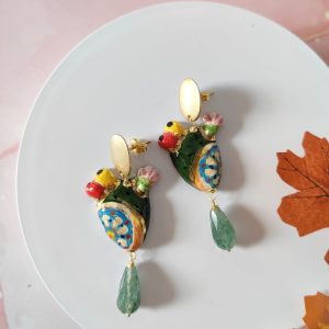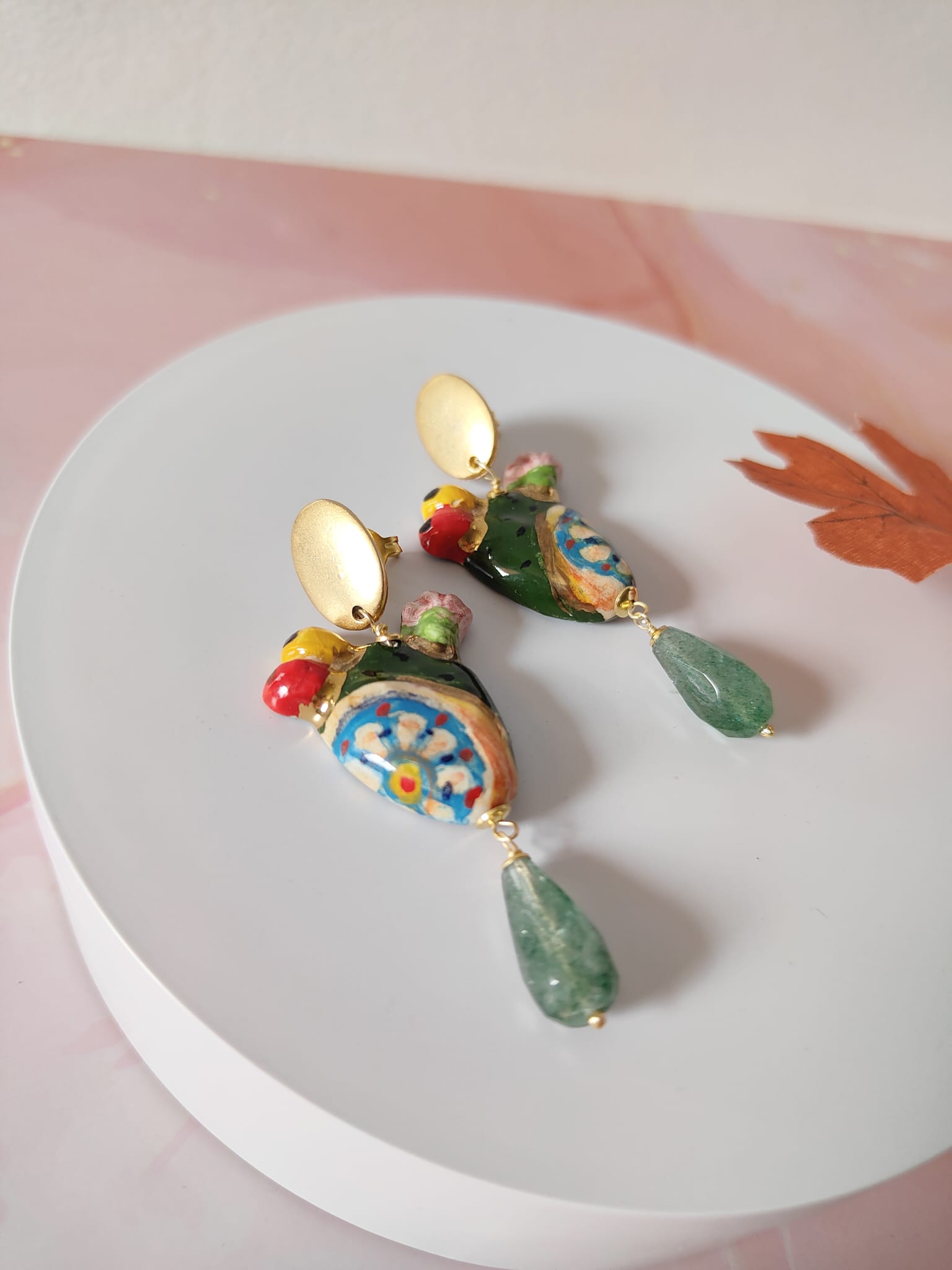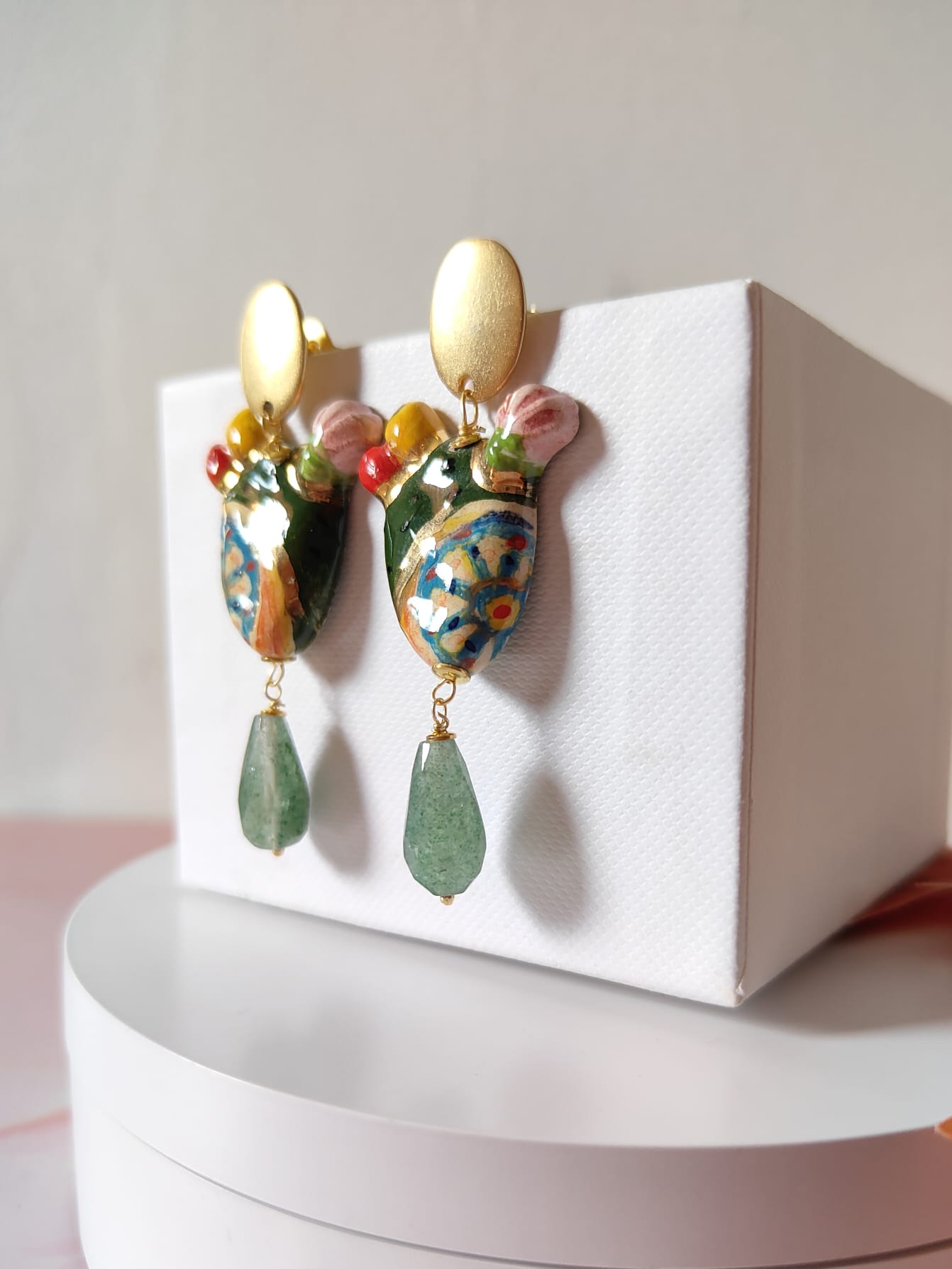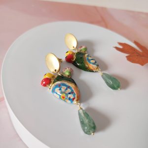 A completare il design, la goccia di quarzo verde, simbolo di armonia e forza interiore. La pietra, scelta per la sua luminosità e naturalezza, dona movimento e un elegante contrasto cromatico con la ceramica dipinta. L’insieme crea un gioiello armonioso, capace di raccontare una storia di terra, sole e tradizioni mediterranee.