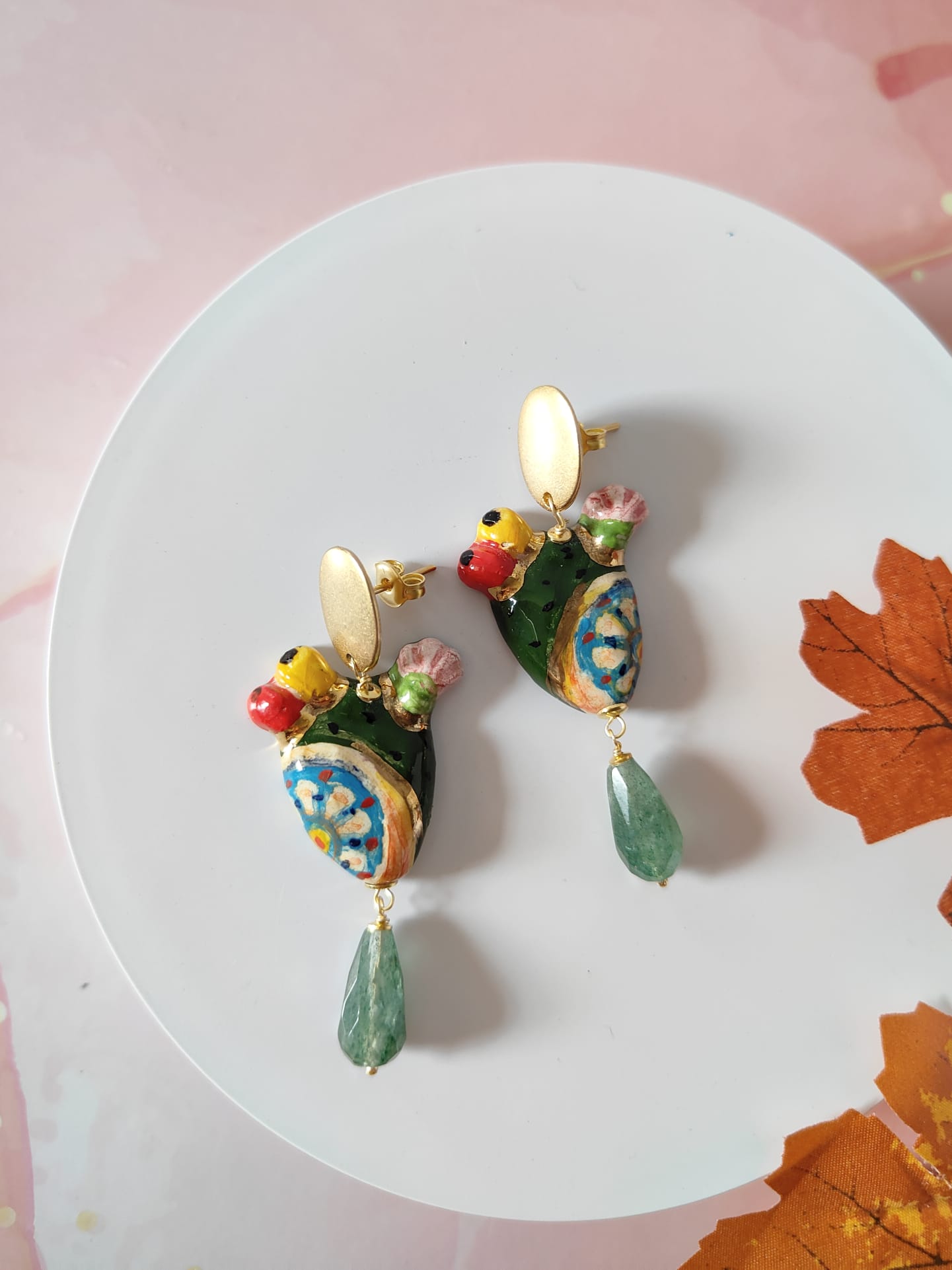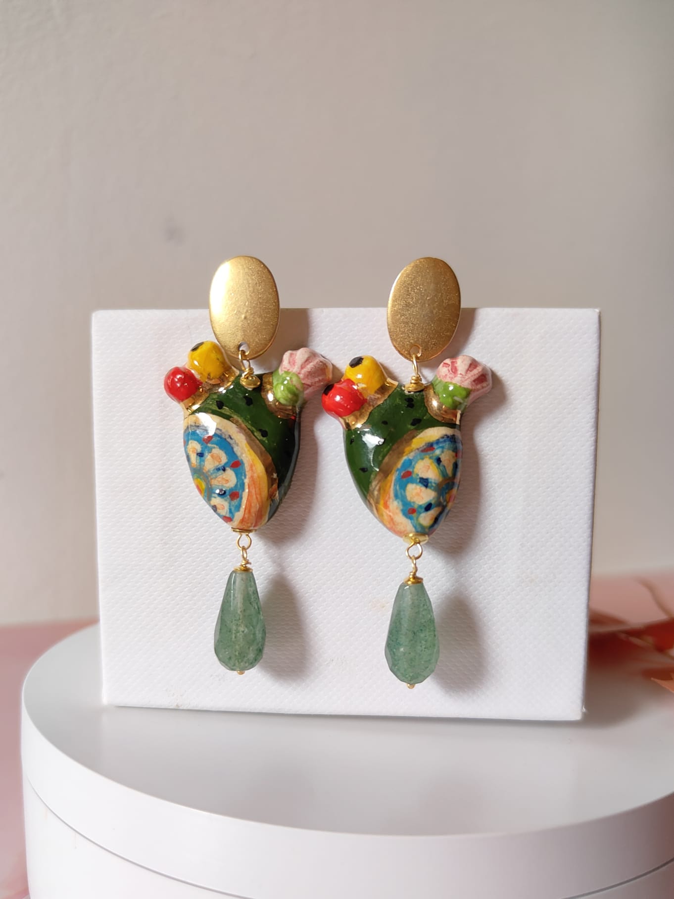 Gli orecchini fichi d’india sono una creazione artigianale esclusiva, realizzata in unico esemplare per chi desidera un gioiello che racchiuda tradizione, simbolismo e raffinatezza. La loro bellezza nasce dall’incontro tra la ceramica di Caltagirone, celebre per i suoi colori intensi e le decorazioni tipiche siciliane, e la purezza di una goccia di quarzo verde sfaccettato che completa la composizione con un tocco di eleganza naturale.
