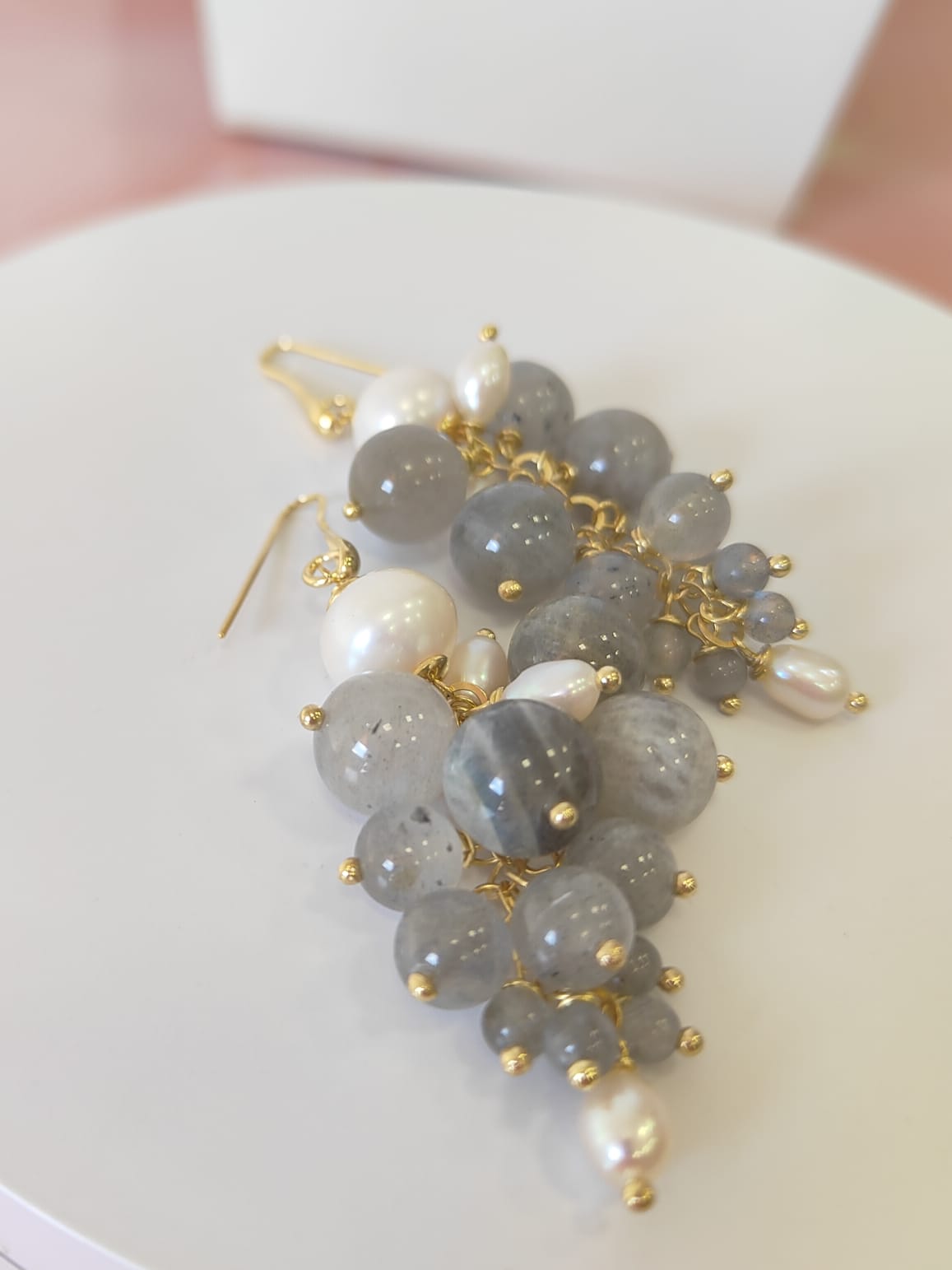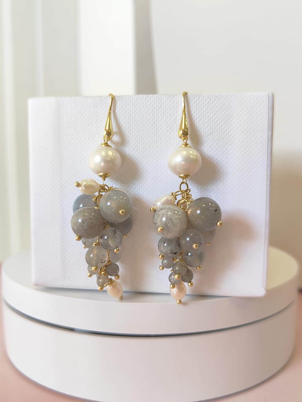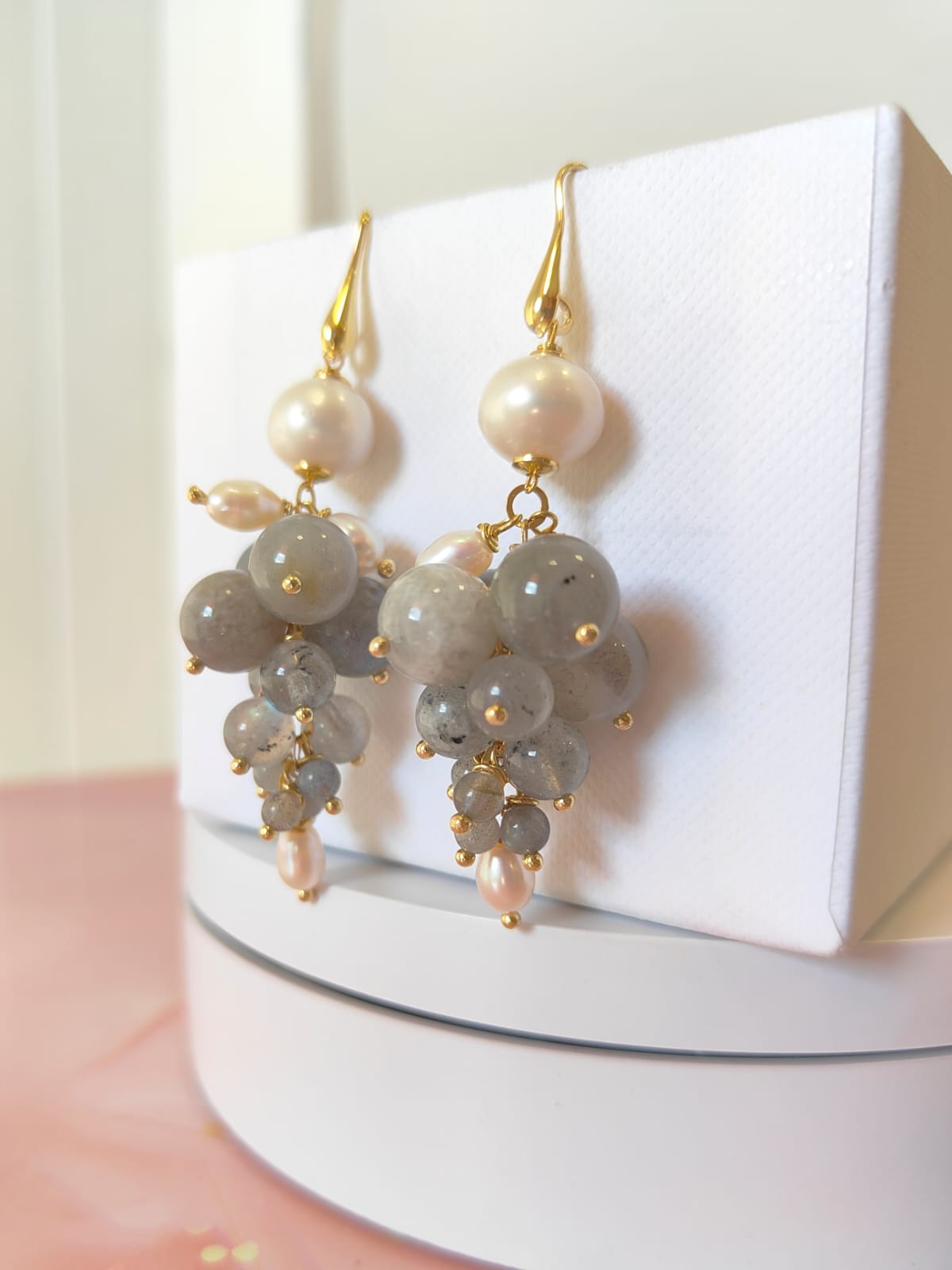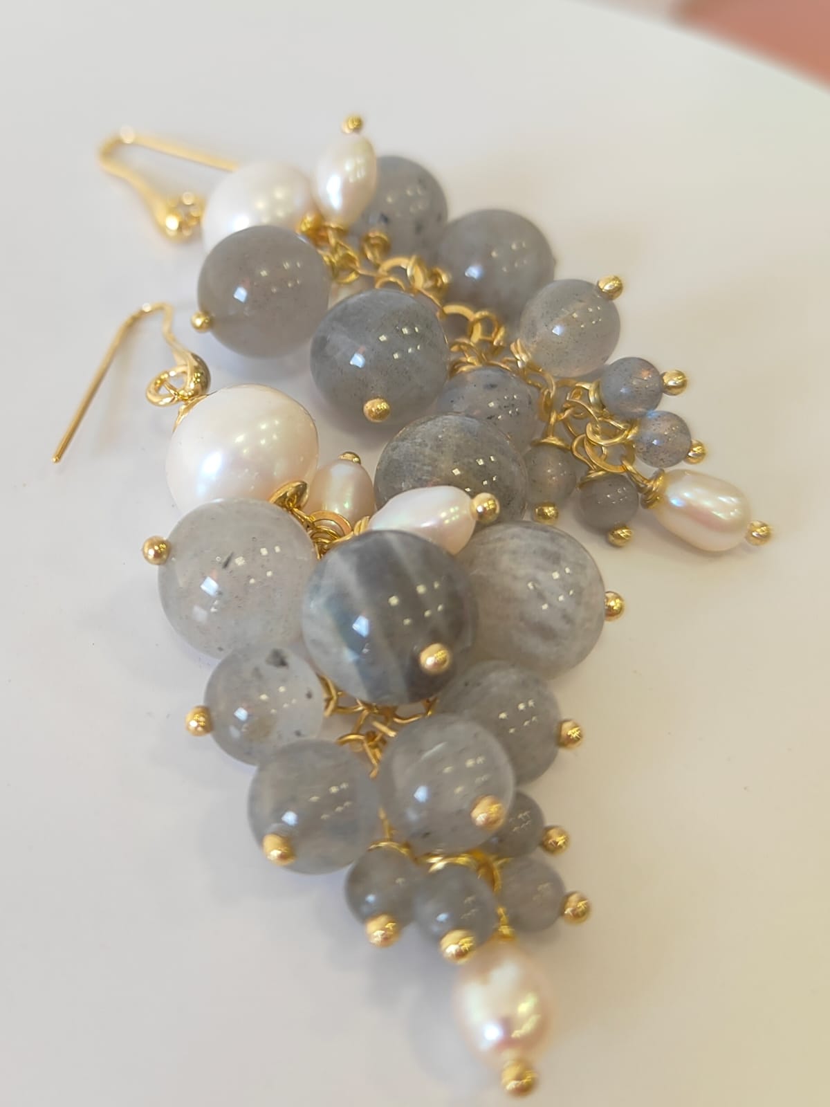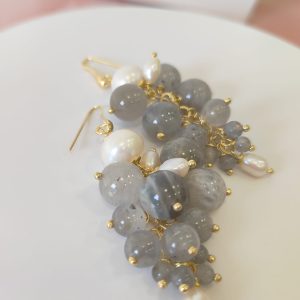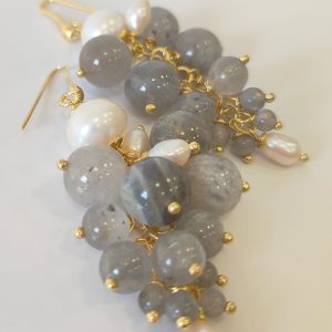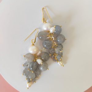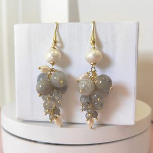 Gli orecchini labradorite e perle sono pensati per chi ama la luce morbida delle pietre naturali e il movimento ricco degli orecchini a grappolo. Le sfere di labradorite mostrano riflessi blu e verdi che compaiono a ogni gesto, mentre le perle aggiungono un tocco di candore classico. Il risultato è un equilibrio raffinato tra toni grigi iridescenti e bianco luminoso, ideale sia per il giorno sia per la sera.