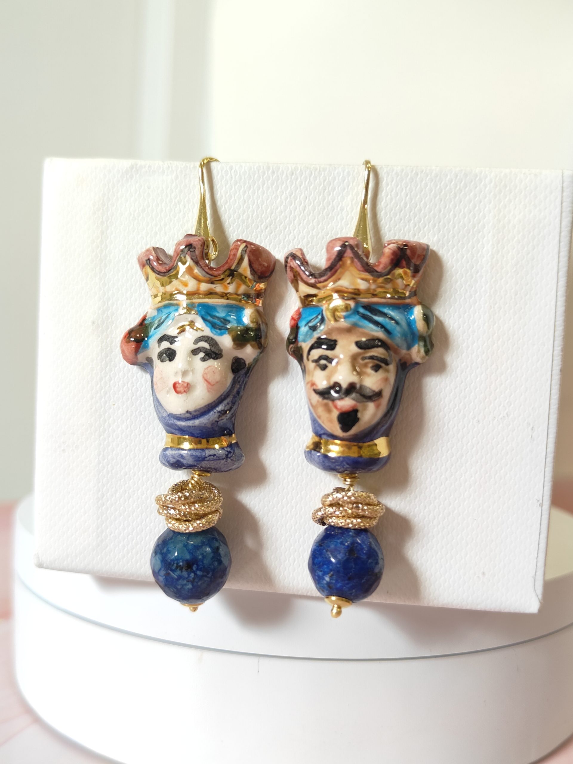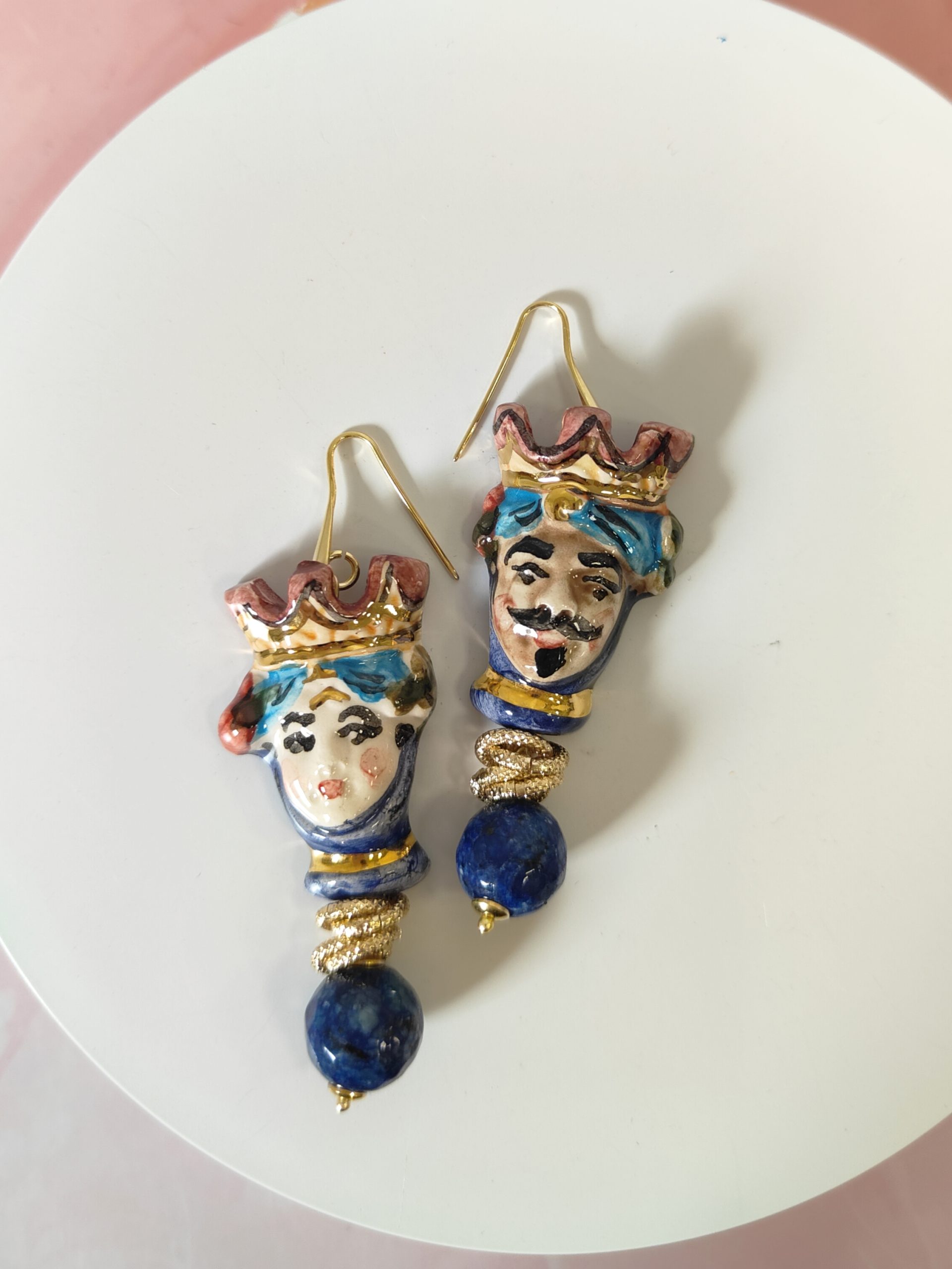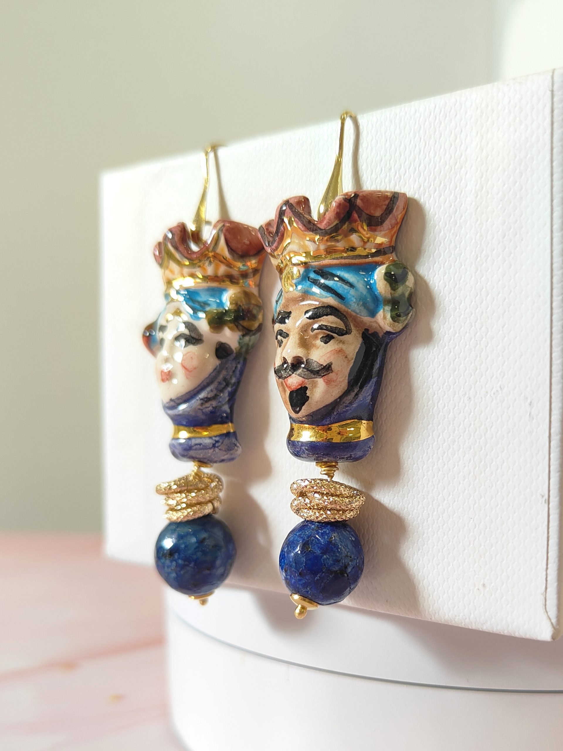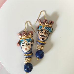 Gli orecchini mori e lapislazzuli sono una celebrazione della tradizione siciliana, reinterpretata con eleganza contemporanea e materiali preziosi. Le teste di moro in ceramica di Caltagirone, dipinte e modellate a mano, raccontano una storia antica fatta di colori, simboli e artigianalità. Ogni espressione del volto, ogni sfumatura delle corone e dei tratti dipinti, testimonia il lavoro meticoloso dell’artigiano e rende questi orecchini un piccolo capolavoro da indossare.