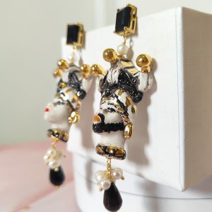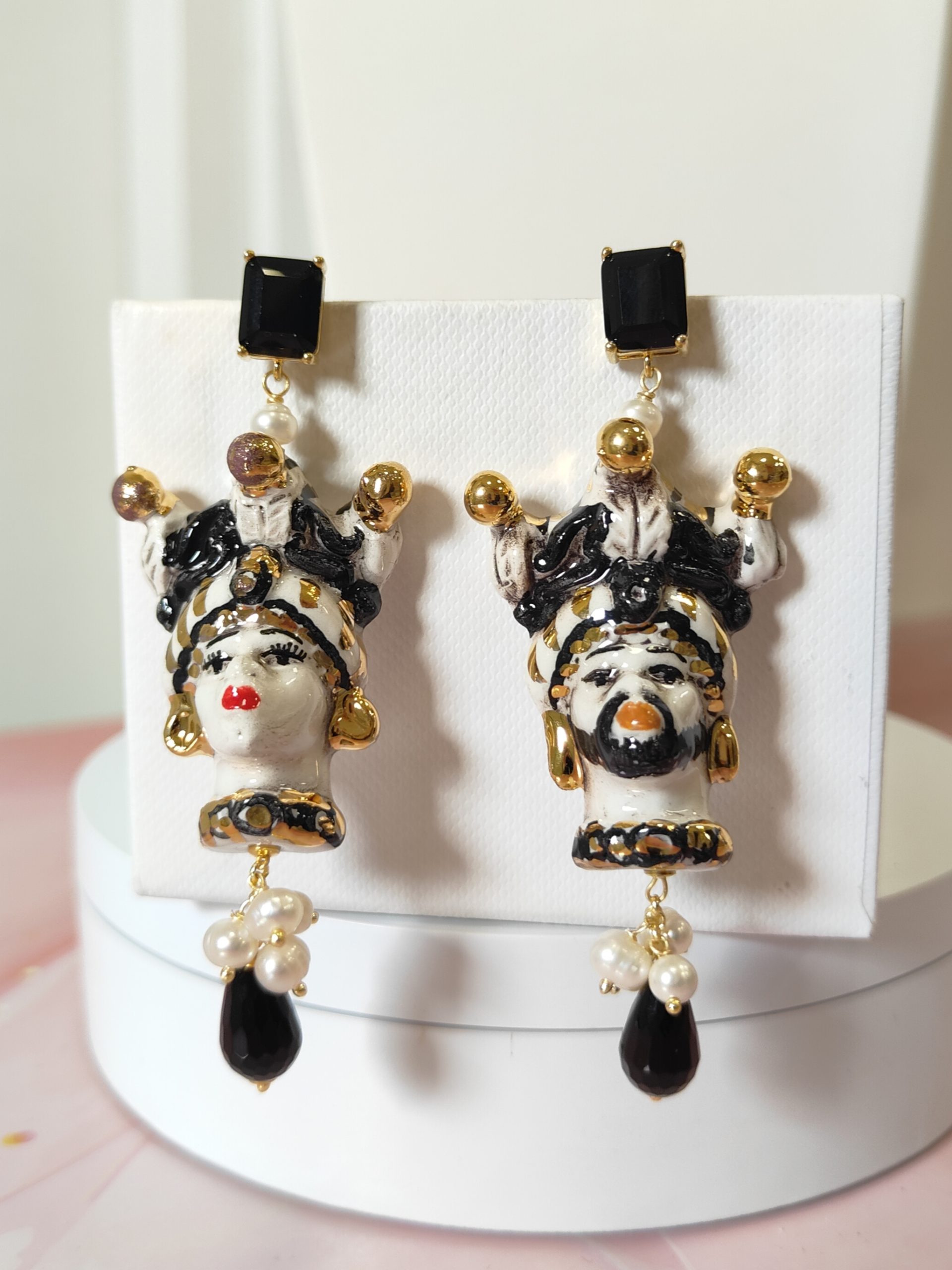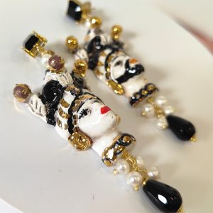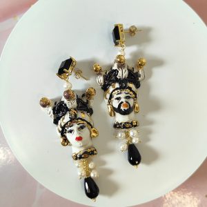 Gli orecchini mori onice nero uniscono tradizione, carattere e raffinatezza in una creazione artigianale che cattura subito l’attenzione. Le teste di moro in ceramica di Caltagirone, dipinte a mano con grande cura, raccontano una storia antica fatta di passione, arte e cultura mediterranea. Ogni dettaglio è modellato con precisione: le espressioni, le corone dorate e le pennellate nere e avorio danno vita a un volto deciso, ricco di personalità e profondità.