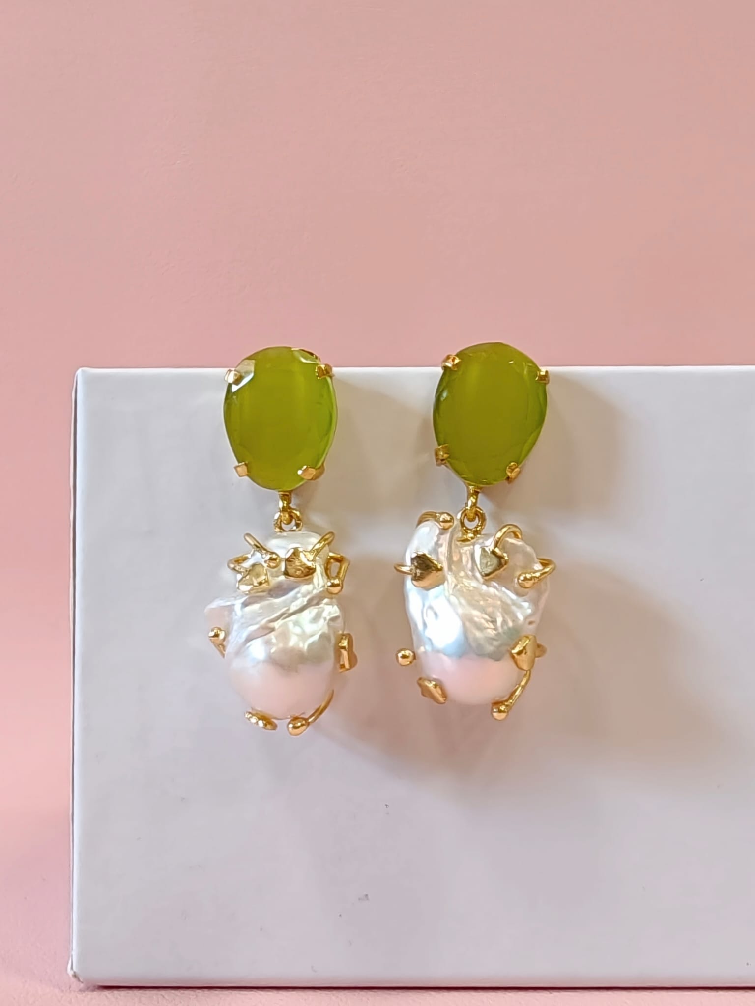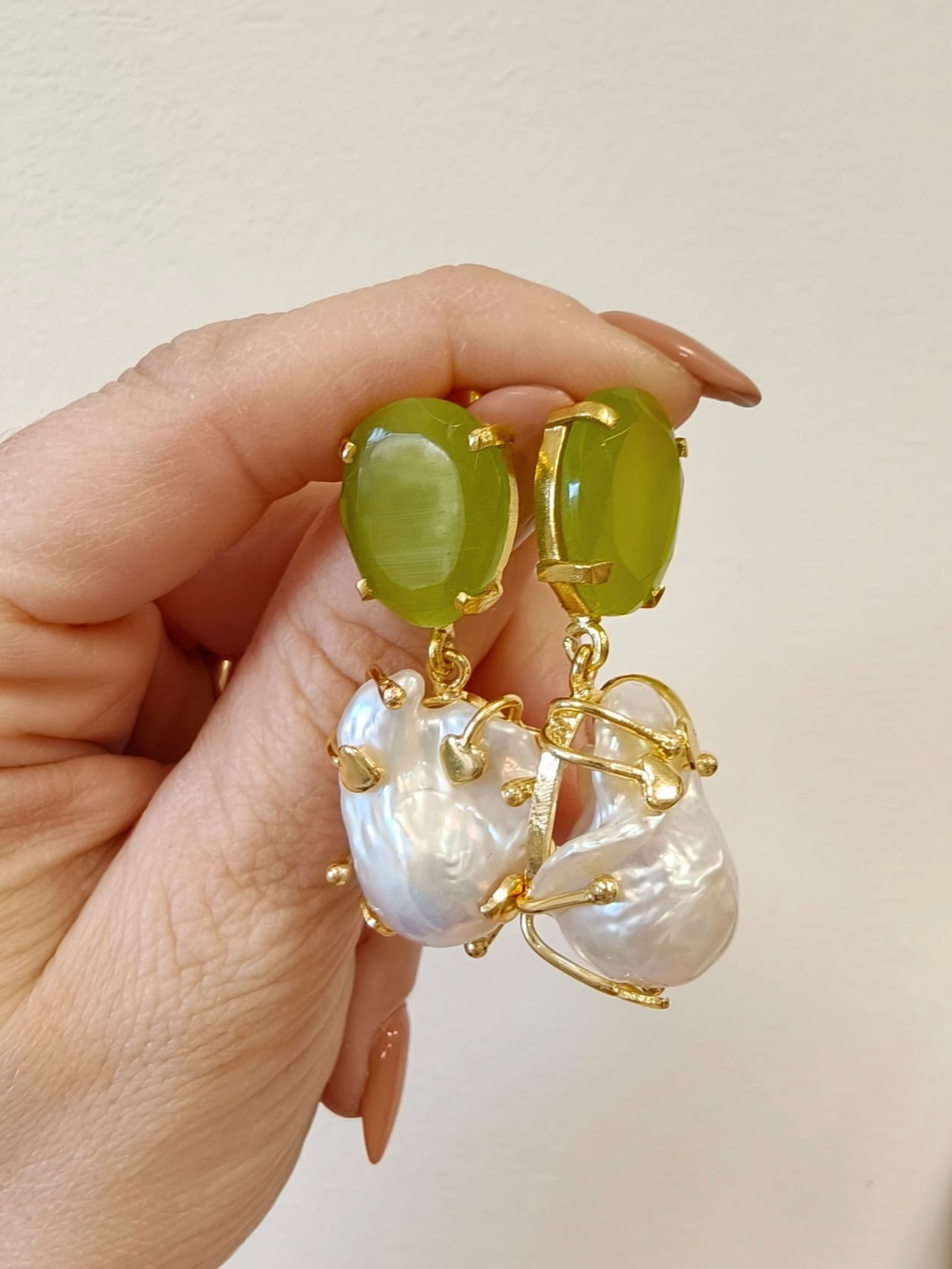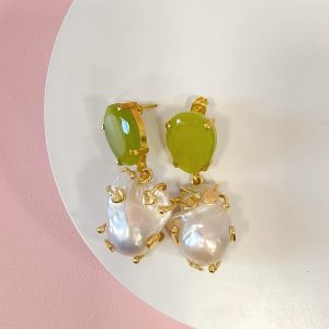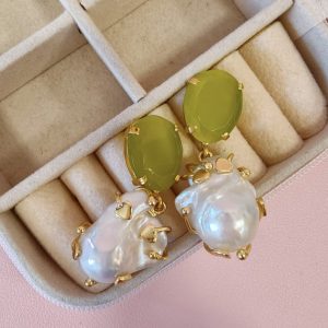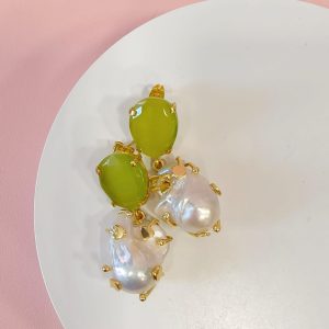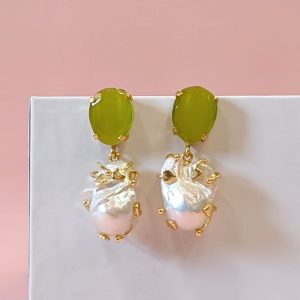 Raffinati orecchini occhio di gatto e perla con pietra verde luminosa e perla barocca pendente, montati in ottone dorato dal design contemporaneo.