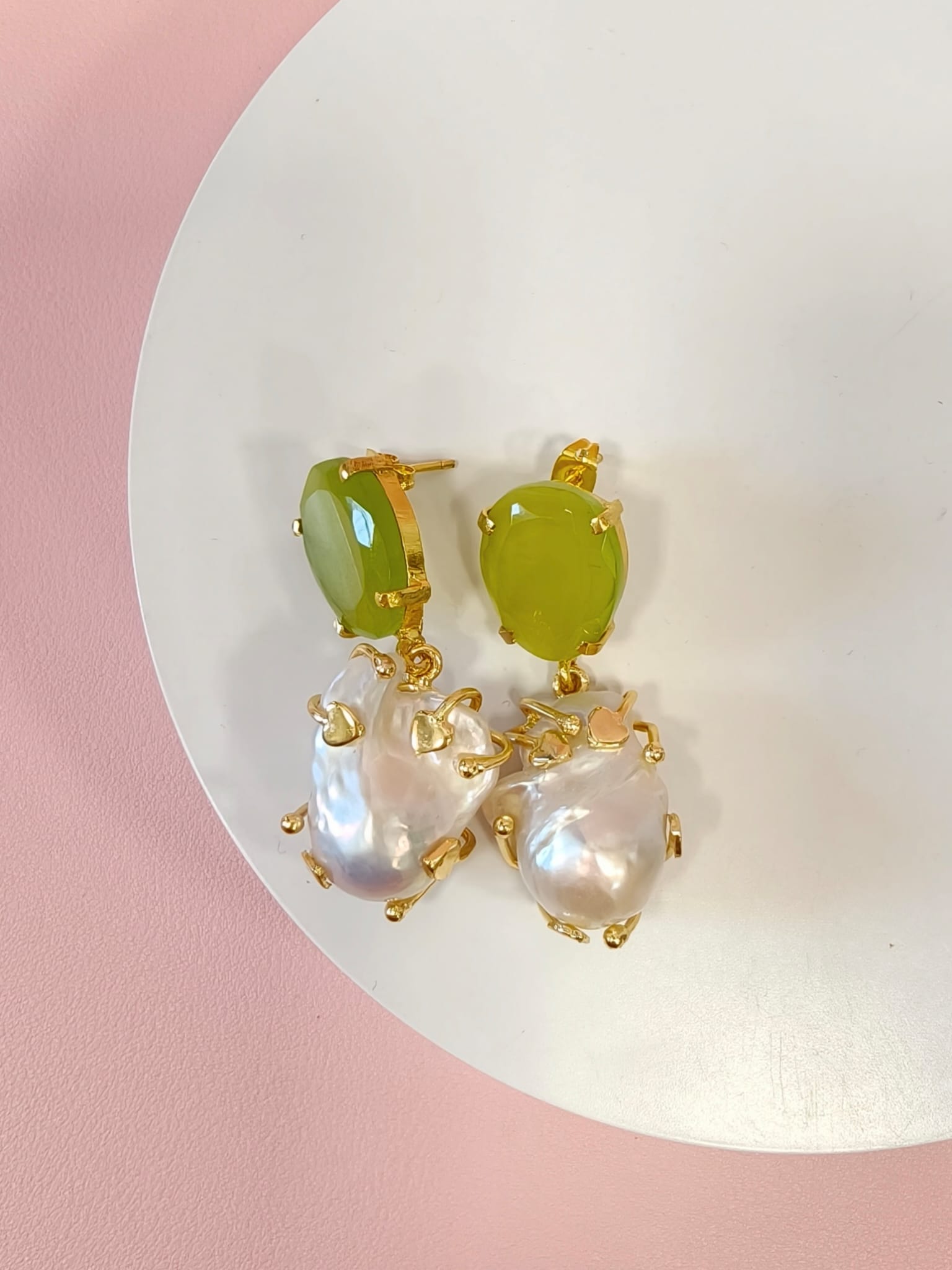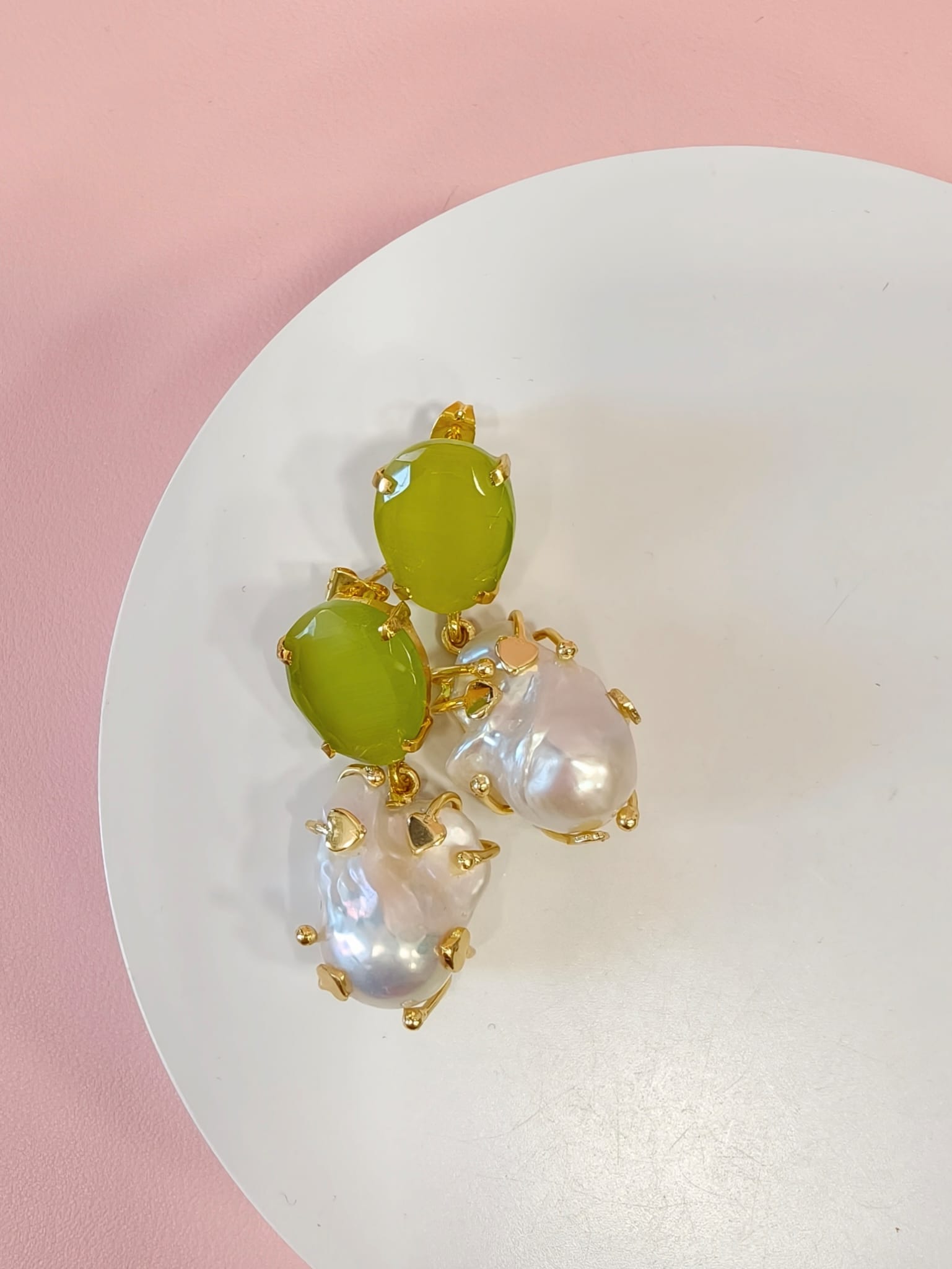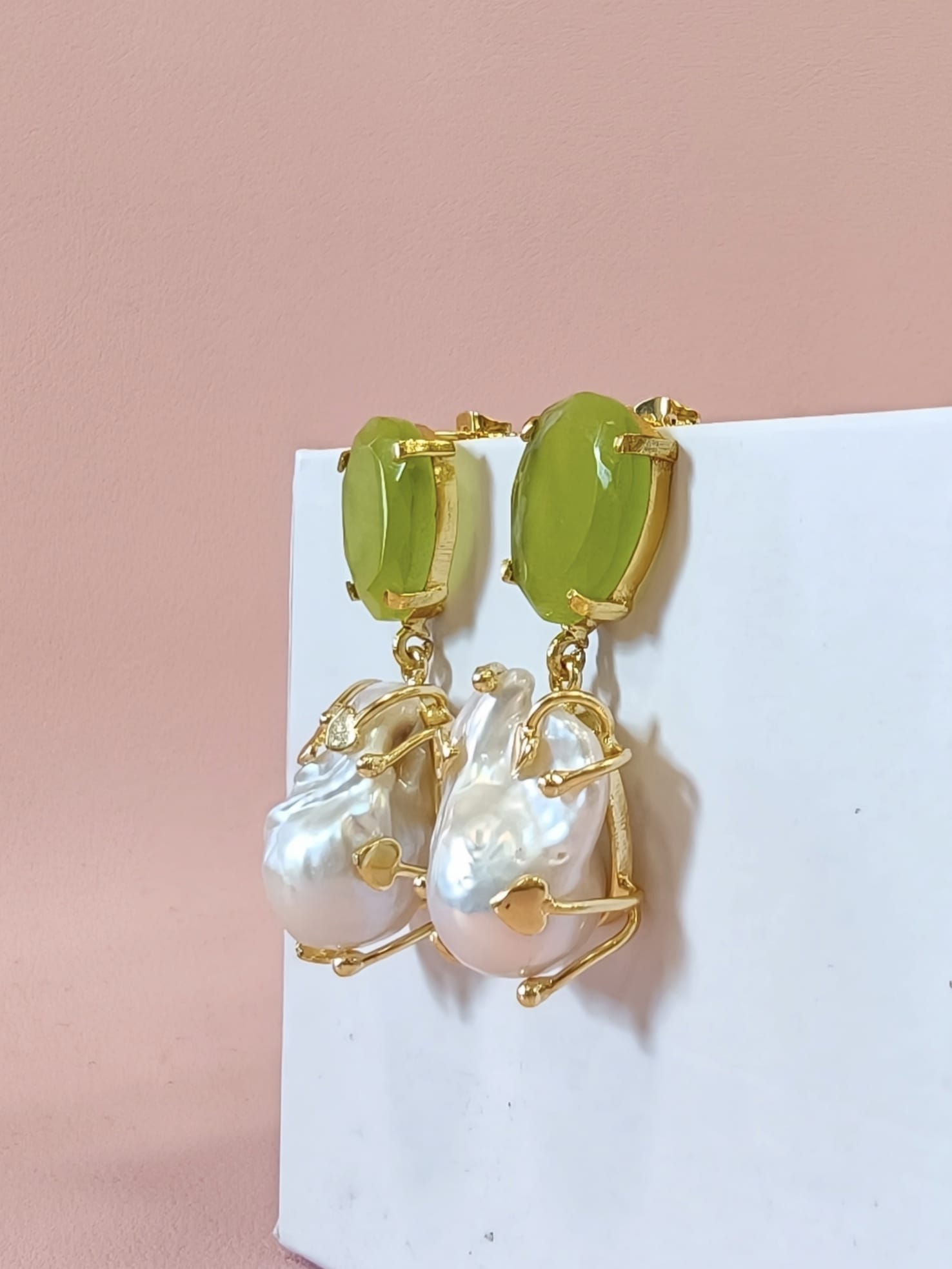 Raffinati orecchini occhio di gatto e perla con pietra verde luminosa e perla barocca pendente, montati in ottone dorato dal design contemporaneo.