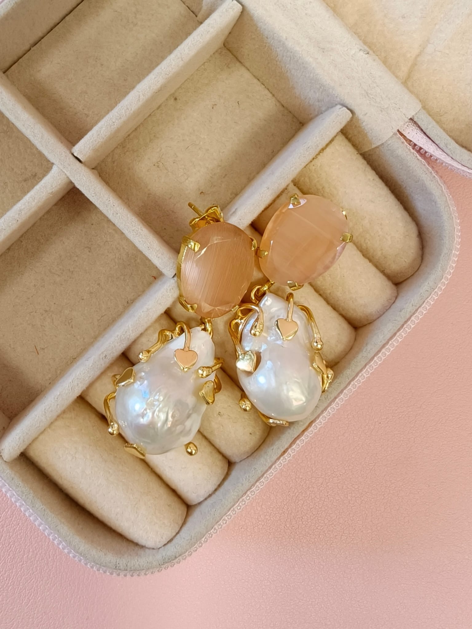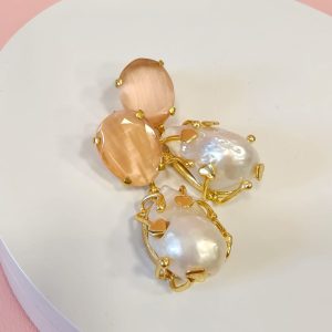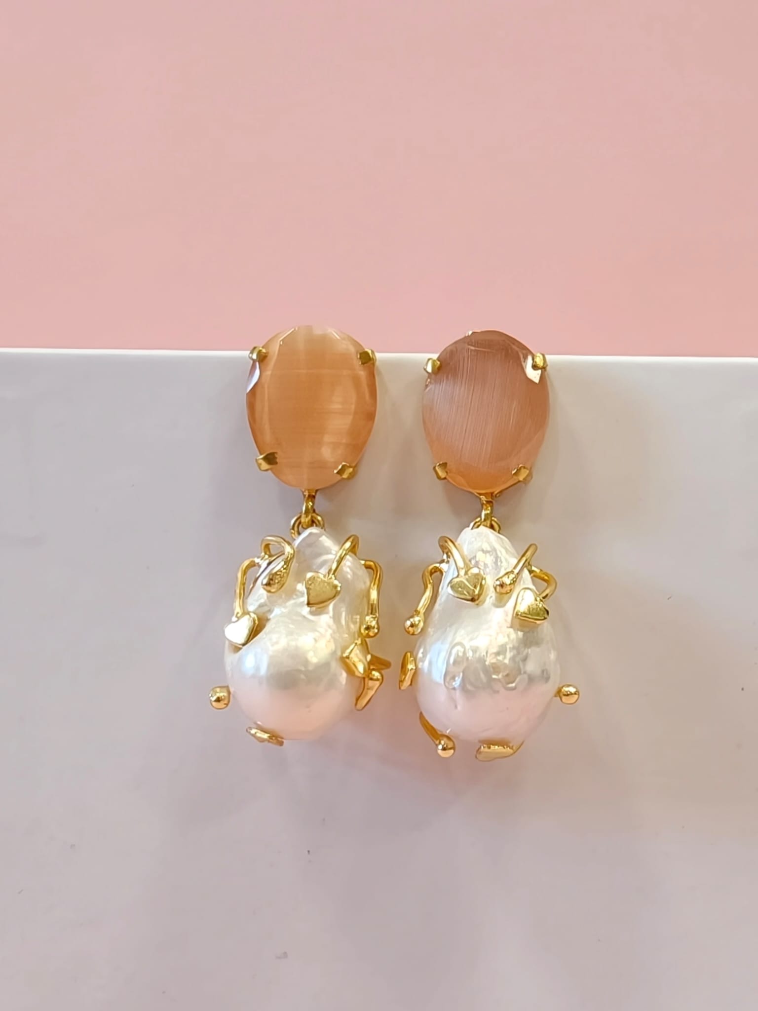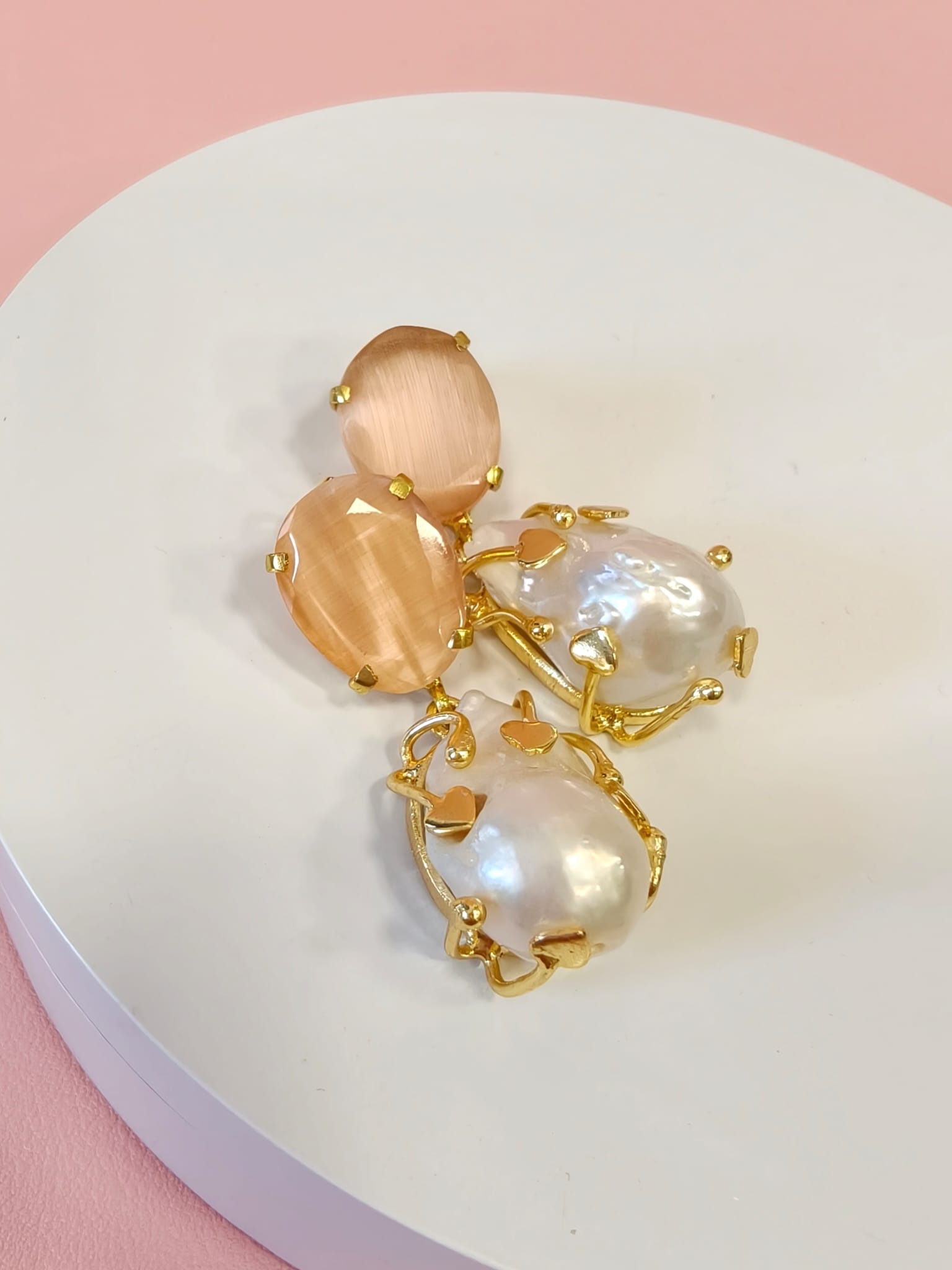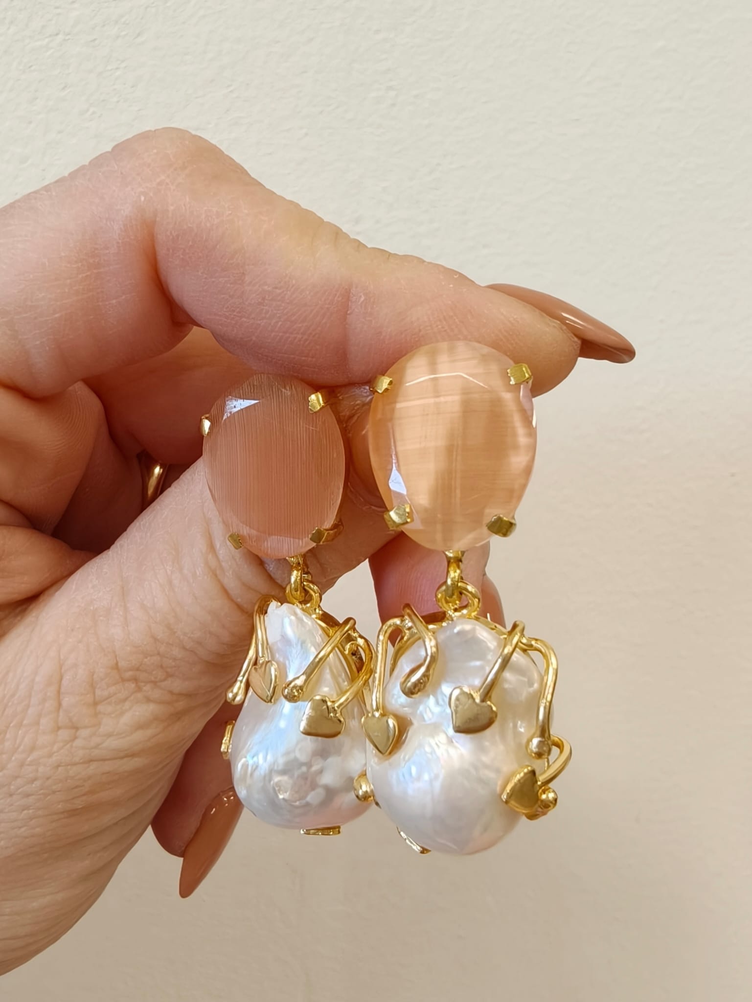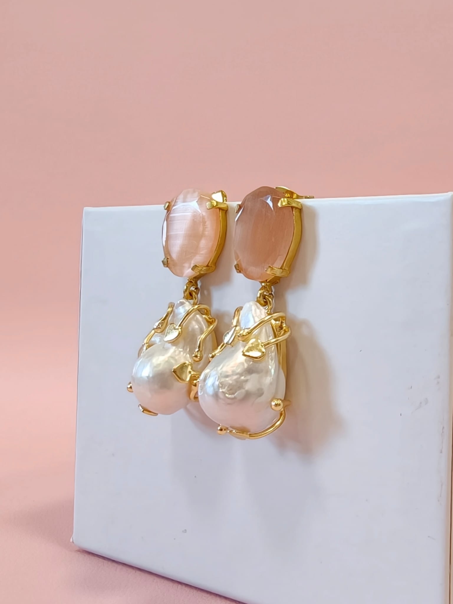 Materiali: ottone dorato, perla barocca naturale e pietra occhio di gatto rosa.