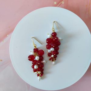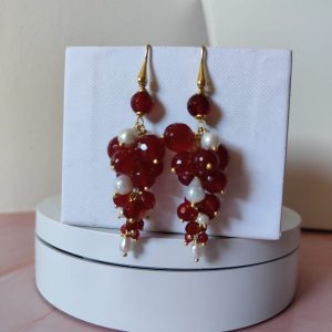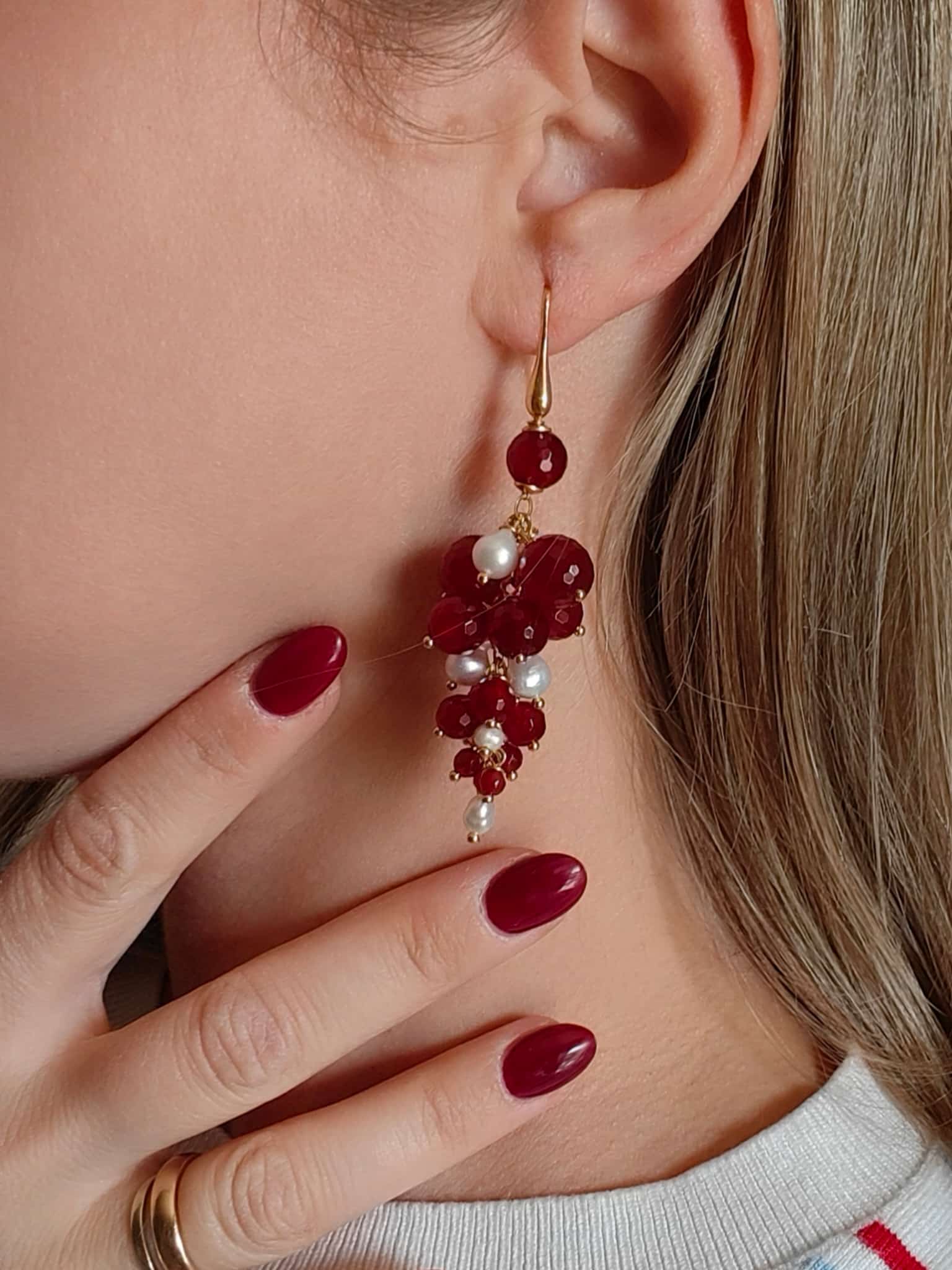 La struttura, ispirata a un grappolo di gemme, esalta il movimento e la brillantezza delle pietre. Ogni sfera di agata borgogna sfaccettata cattura la luce in mille riflessi, con tonalità che spaziano dal rosso profondo al borgogna intenso, simbolo di passione e vitalità. Accanto, le perle naturali bianche aggiungono un tocco di delicatezza e purezza, creando un contrasto armonioso e luminoso che valorizza il volto.