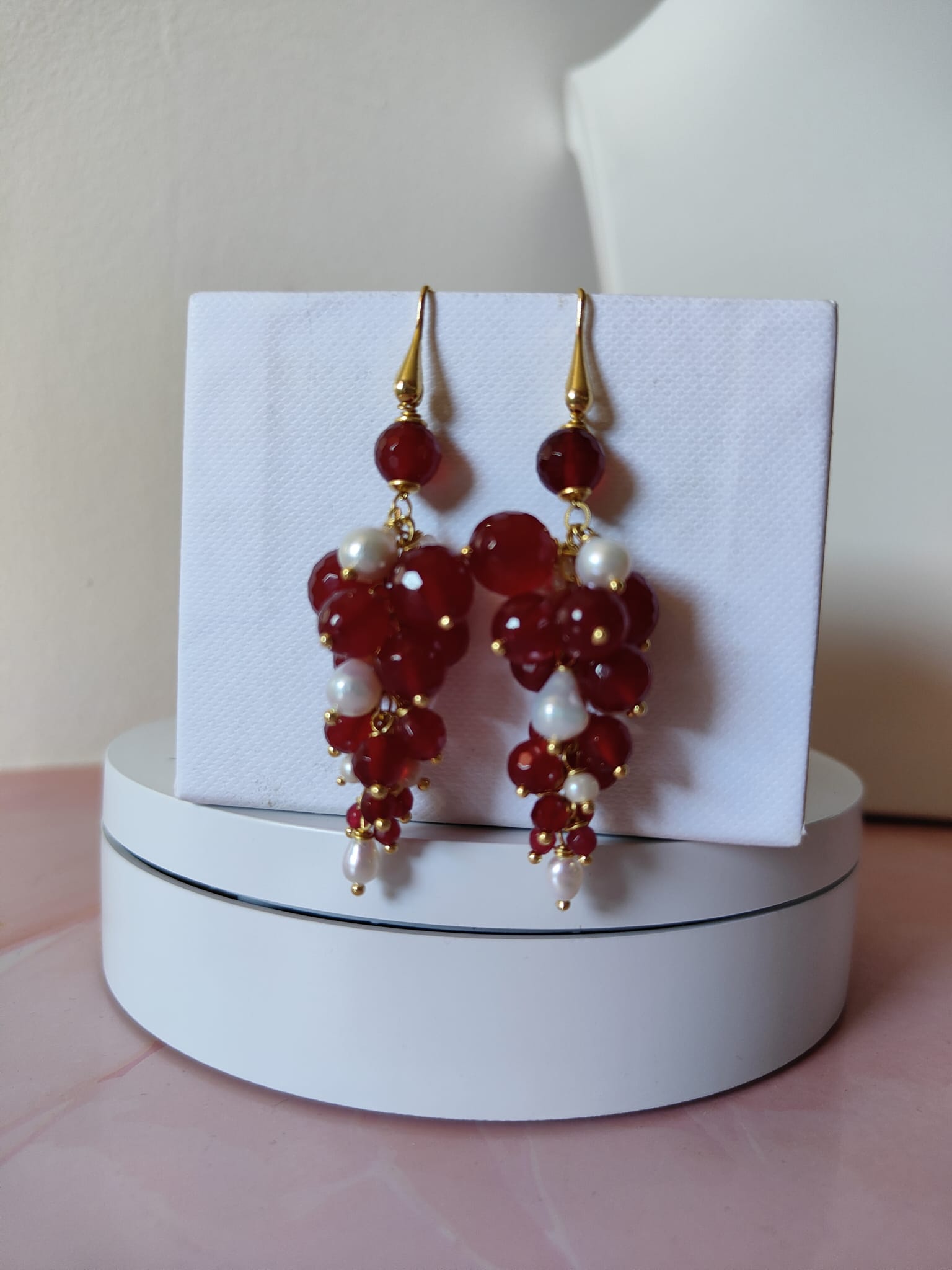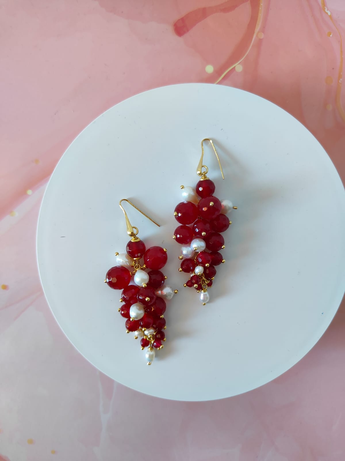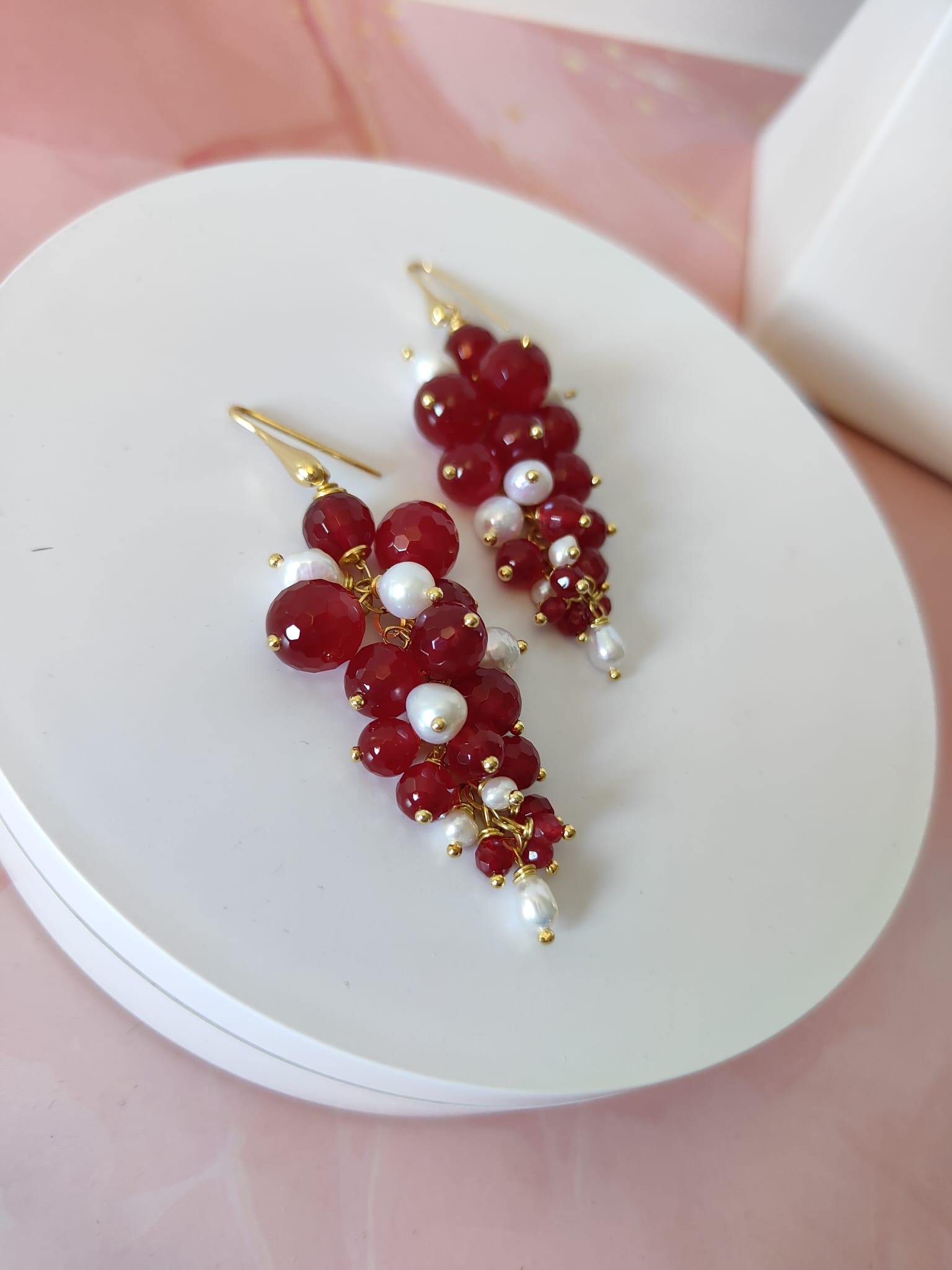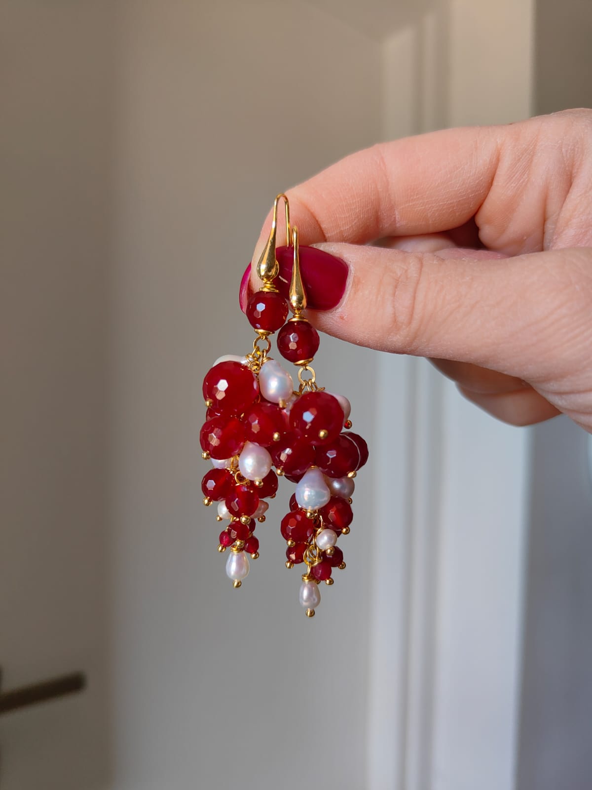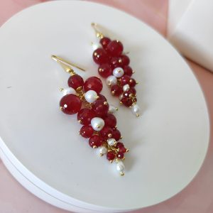 Gli orecchini agata borgogna e perle incarnano l’arte del fatto a mano: ogni dettaglio è frutto di un’attenta selezione di materiali e di una composizione curata nei minimi particolari. Ogni esemplare è leggermente diverso, come un piccolo capolavoro artigianale che conserva il fascino dell’unicità.