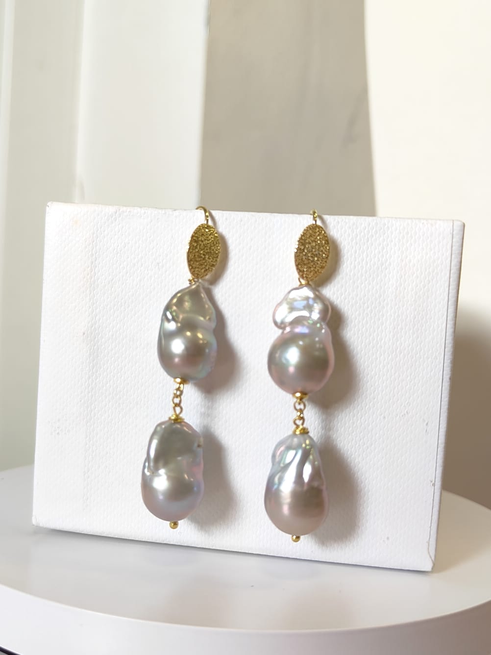 Raffinati orecchini perle grigie barocche, realizzati a mano con monachella in argento 925 placcato oro. Lunghi circa 5,8 cm, leggeri ed eleganti, ideali per un look femminile e luminoso.