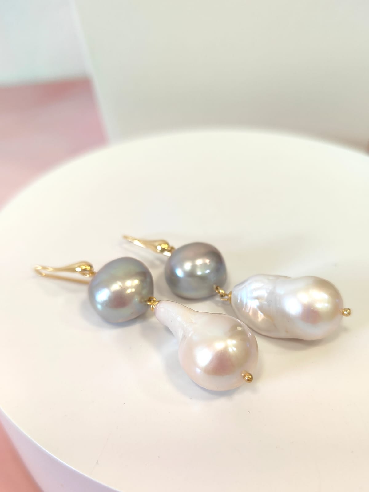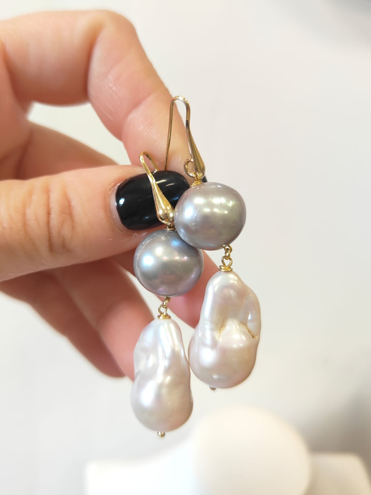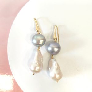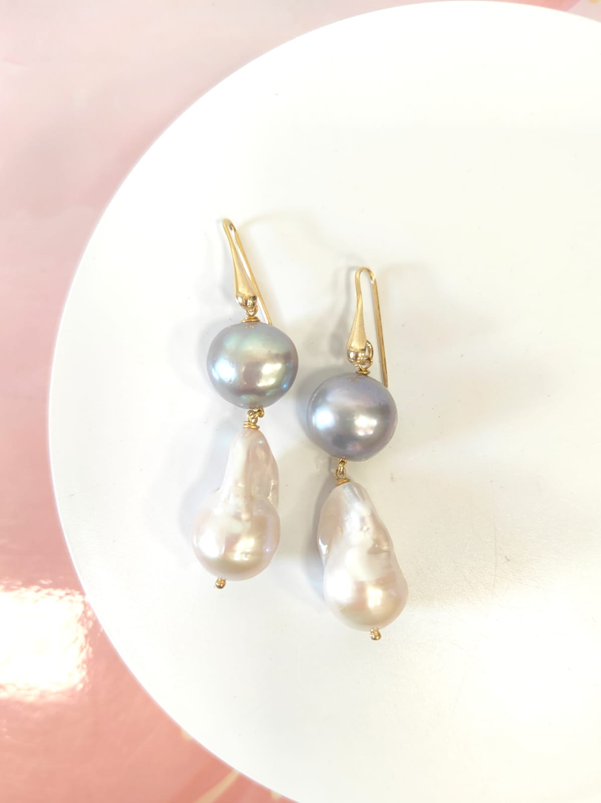Ogni orecchino è composto da una perla grigia sferica nella parte superiore, caratterizzata da riflessi cangianti che spaziano dal platino al perlaceo. Da essa scende una perla barocca più grande, dalla forma irregolare e naturalmente scolpita, con una luminosità calda e avvolgente. L’accostamento tra le due tonalità crea un contrasto armonioso e sofisticato, perfetto per chi ama gioielli versatili ma distintivi.