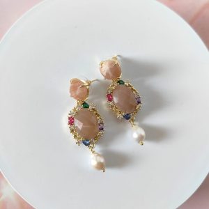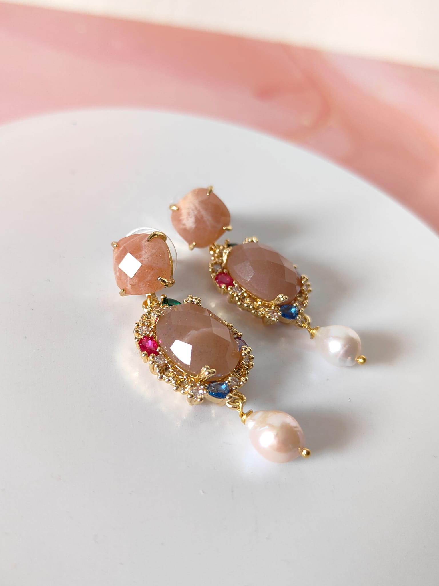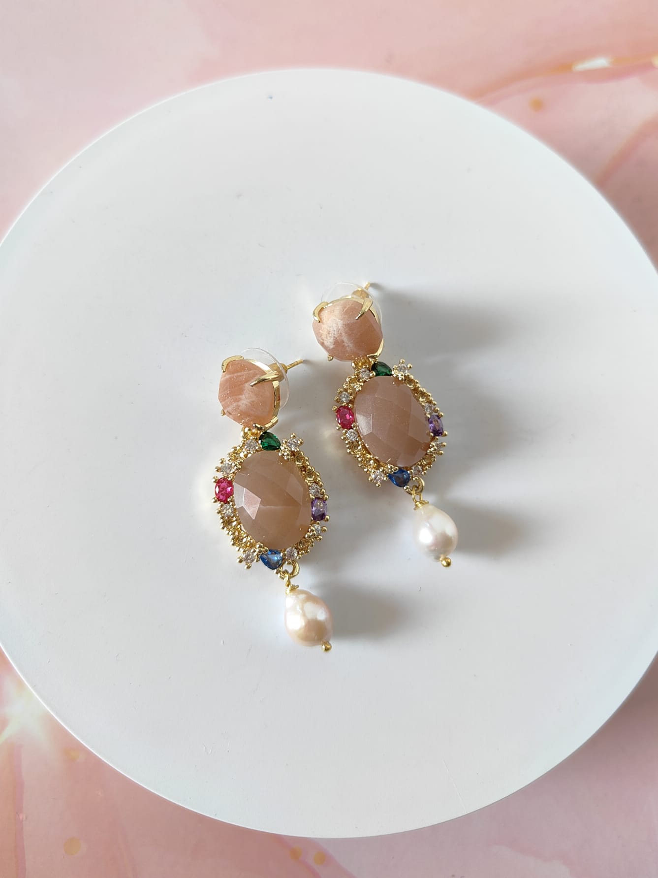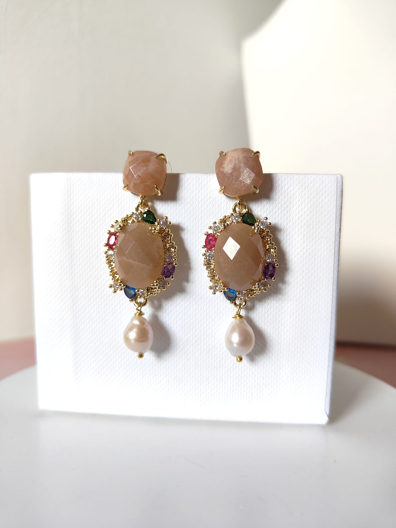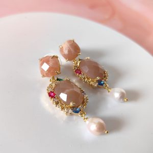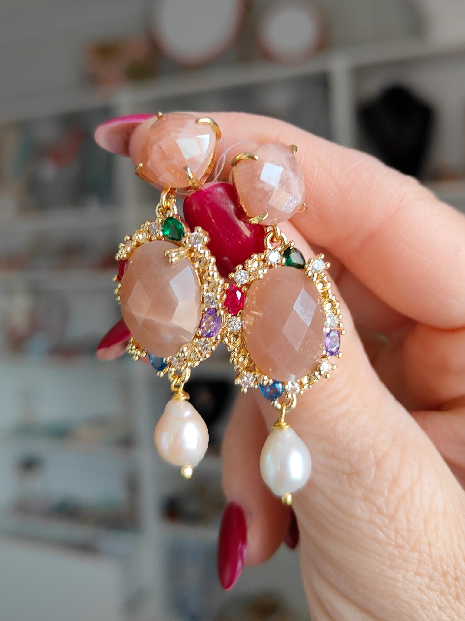 Materiali: ottone anallergico dorato, pietra di luna naturale, zirconi multicolor, perla barocca piccola
